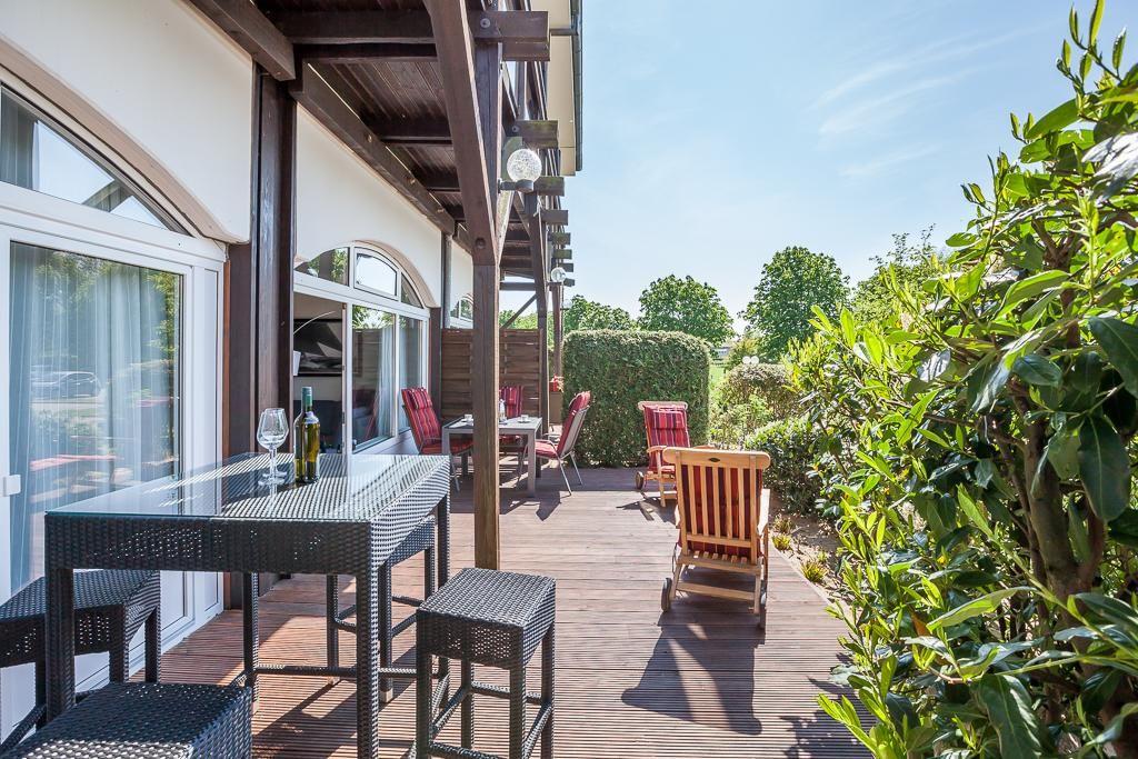 Sowohl vom Schlaf- als auch vom Wohnzimmer gelangen Sie auf die ca. 25 qm große West-Terrasse wo Sie auf dem neu verlegten Holzdeck mit Gartenmöbeln die Nachmittags- und Abendsonne nach einem tollen Strandtag genießen können.