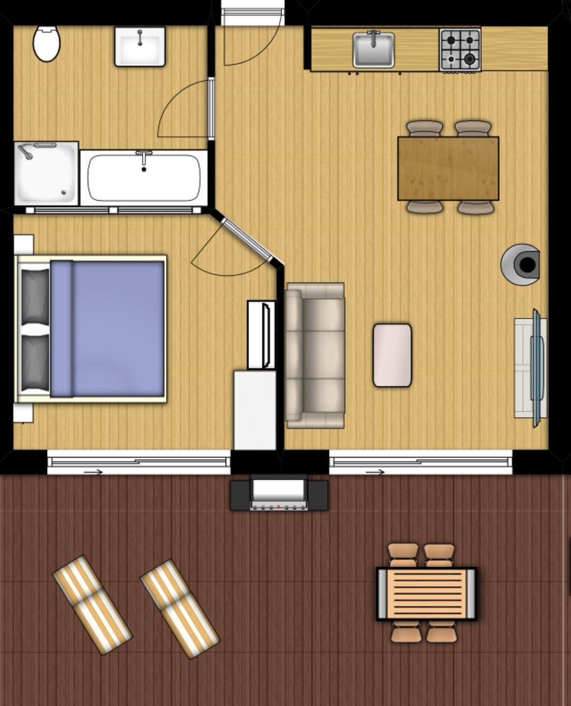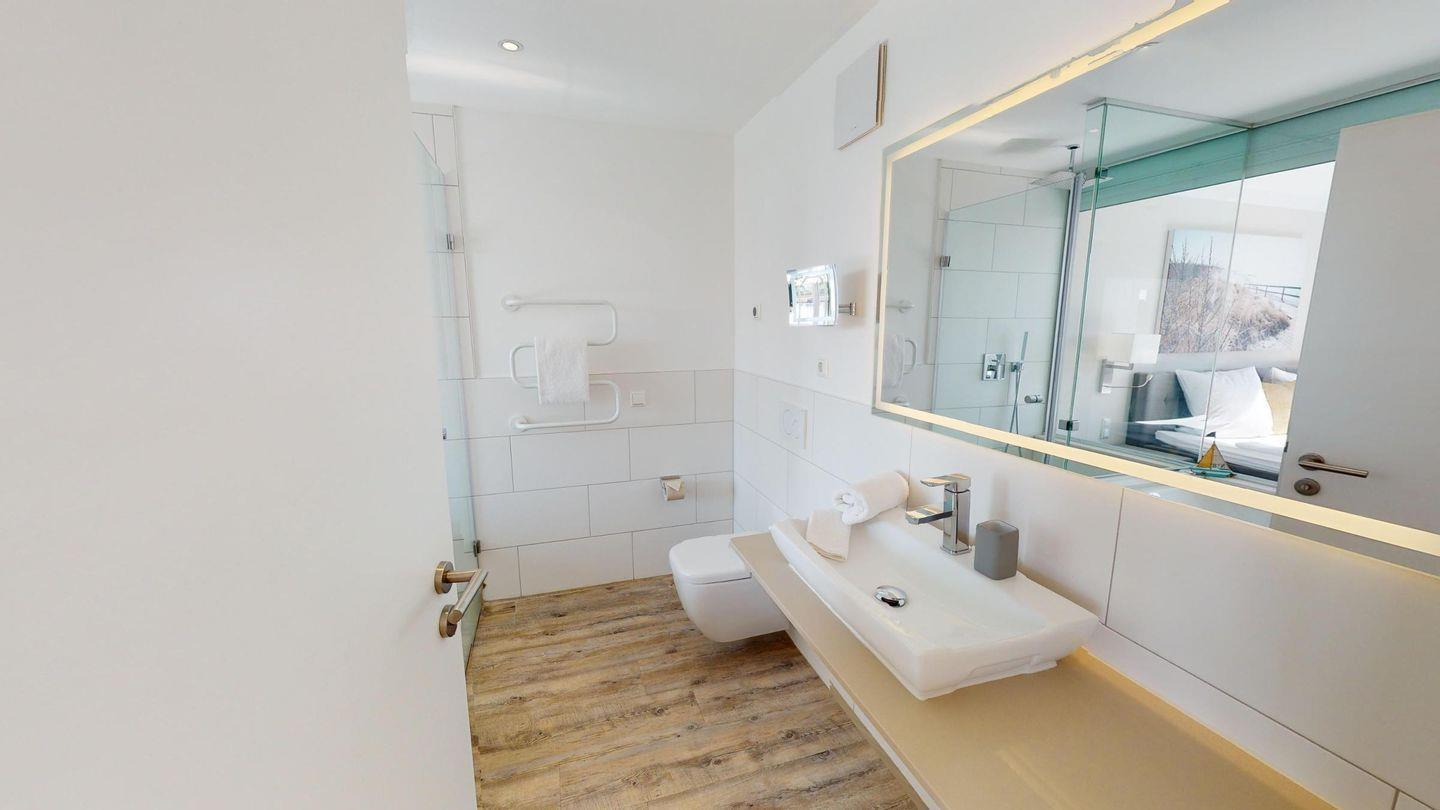 Im Schlafzimmer erwartet Sie ein hochwertiges Boxspringbett sowie Verdunkelungsplissees und ein Flachbildfernseher. Der Wohnbereich wird durch das Duschbad mit Regenbrause abgerundet, das außerdem einen beleuchteten Wand- und Kosmetikspiegel, ein Wandradio mit Bluetooth-Verbindung sowie einen Fön bietet.