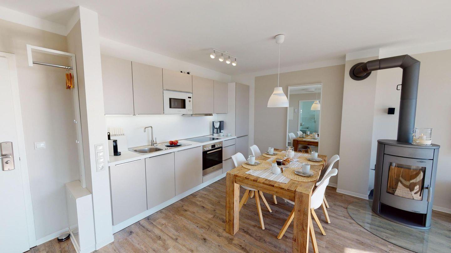 Das Herzstück der Wohnung bildet der großzügige Wohn- und Essbereich mit einer offenen, gut ausgestatteten Küche. Der Wohnbereich wird durch einen schönen Kaminofen und eine gemütliche Sofaecke ergänzt.