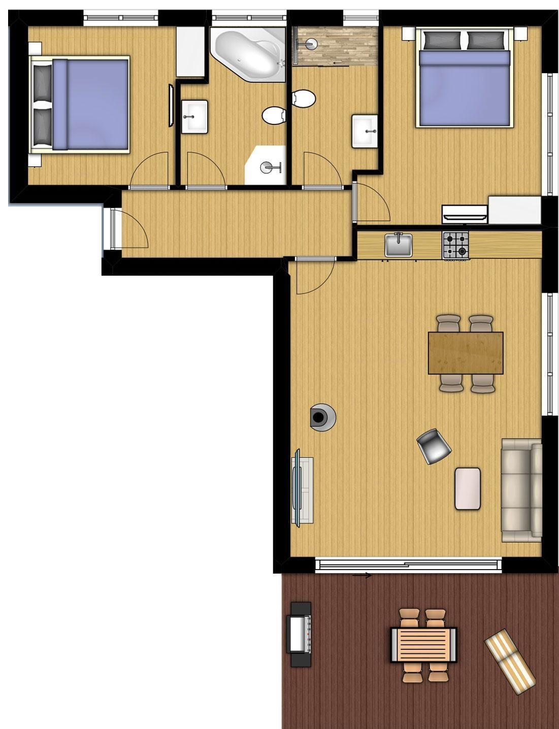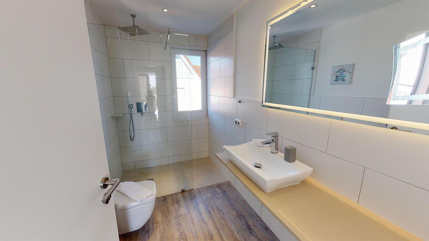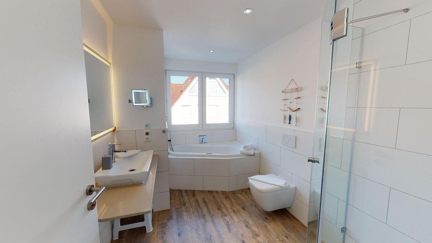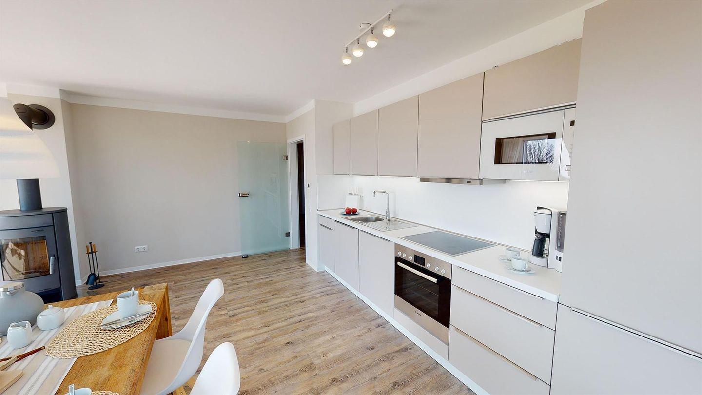 Die beiden Schlafzimmer sind mit hochwertigen Boxspringbetten ausgestattet, inklusive Verdunklungsplissees und Flachbildfernsehern. Das Apartment verfügt über ein Duschbad mit einer Regenbrause sowie ein weiteres Badezimmer mit einer Whirlwanne. In beiden Bädern finden sich beleuchtete Wand- und Kosmetikspiegel sowie Wandradios mit Bluetooth-Verbindung. Das Wohnzimmer zeichnet sich durch seine Helligkeit aus, während die voll ausgestattete Küche zum Genießen einlädt. Ein Essbereich und ein gemütlicher Sofabereich mit Kaminofen vervollständigen den Wohnraum.