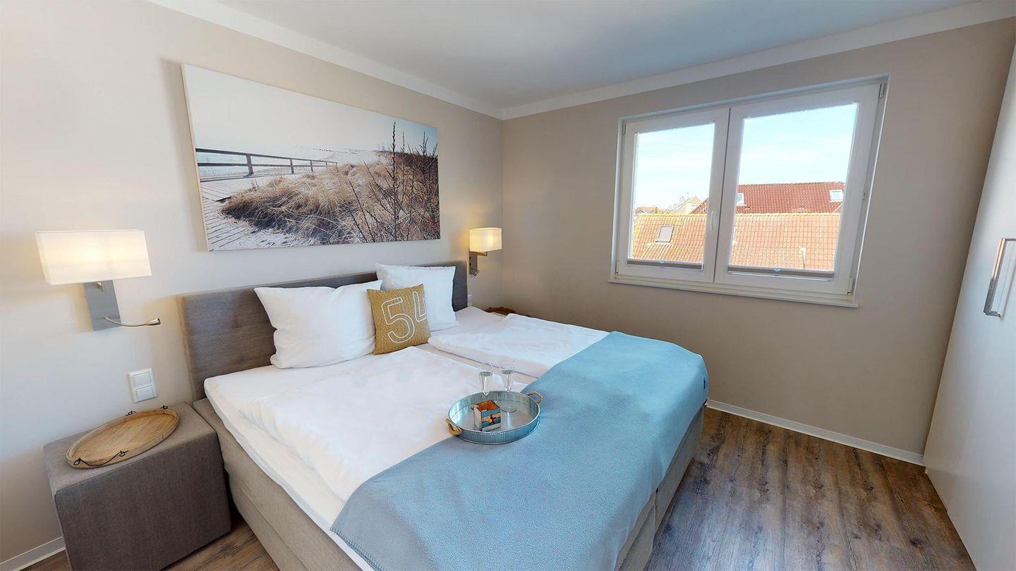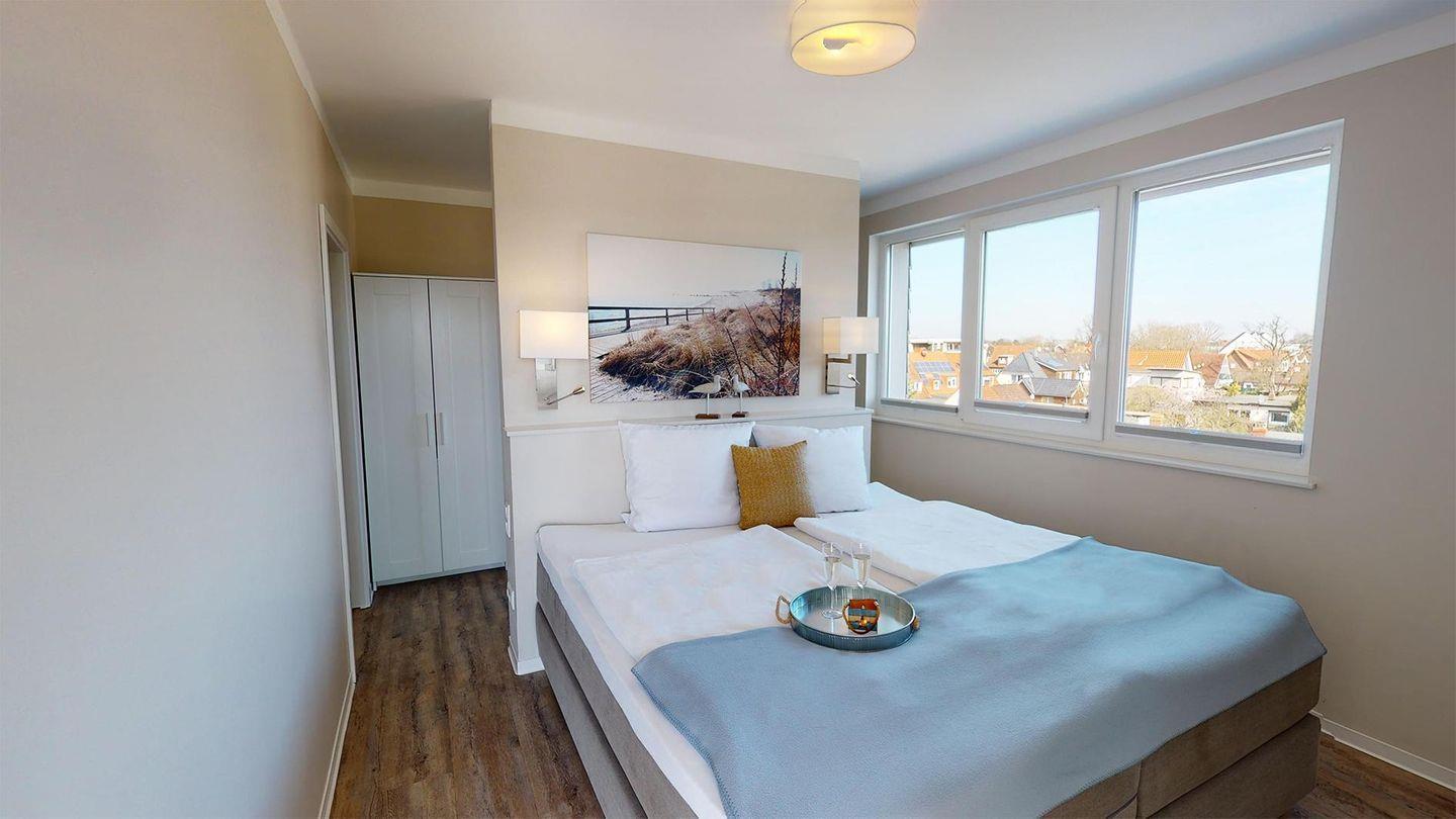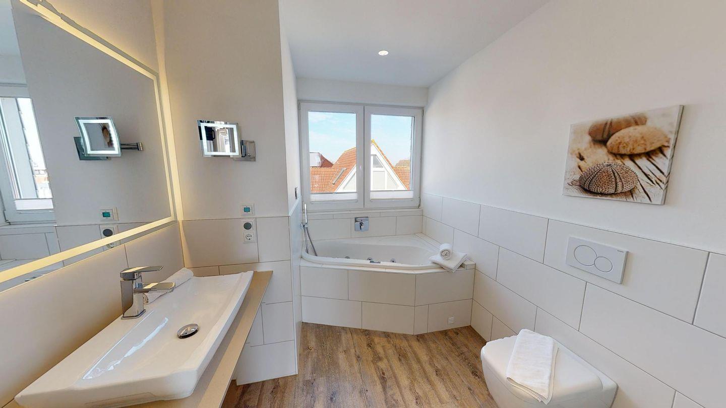 Die drei Schlafzimmer sind mit hochwertigen Boxspringbetten ausgestattet, inklusive Verdunklungsplissees und Flachbildfernsehern. Zwei Duschbäder mit Regenbrause sind über die jeweiligen Schlafzimmer erreichbar, während das dritte Duschbad mit Regenbrause und Whirlwanne über den Flur zugänglich ist. Alle drei Bäder sind mit beleuchteten Wand- und Kosmetikspiegeln sowie Wandradios mit Bluetooth-Verbindung ausgestattet.