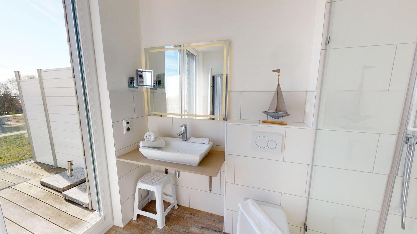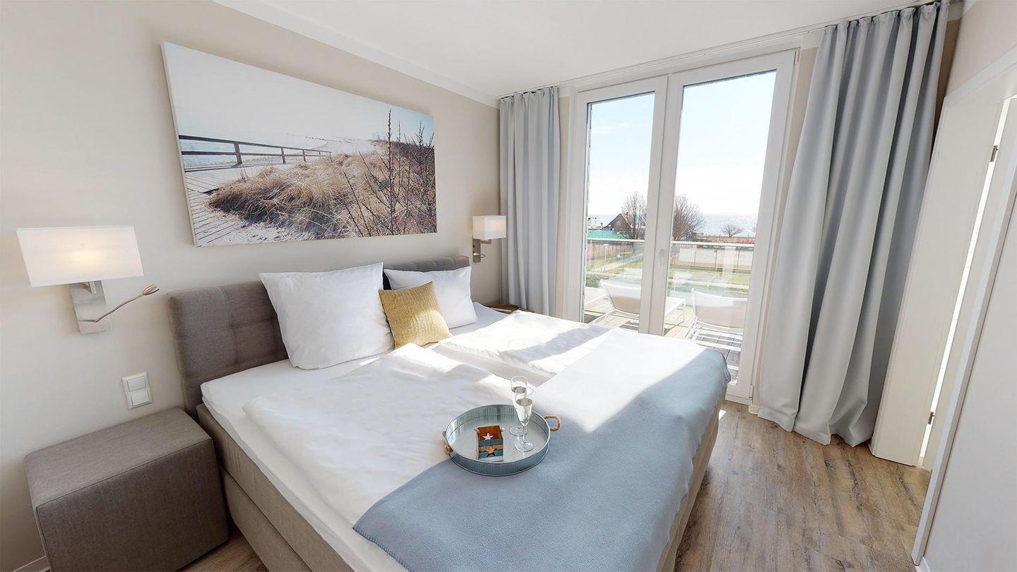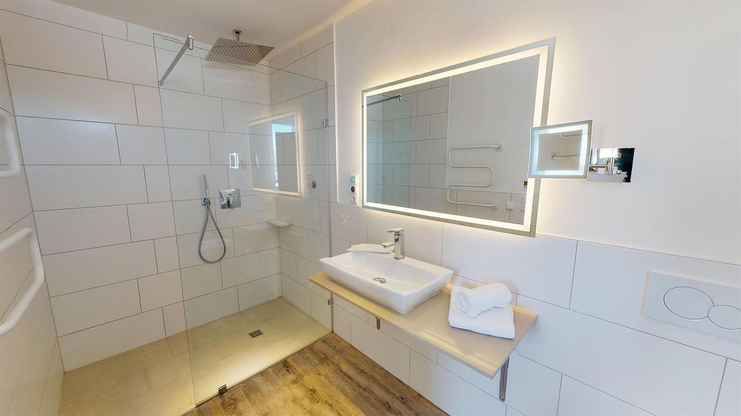 Die drei Schlafzimmer sind mit hochwertigen Boxspringbetten ausgestattet, inklusive Verdunklungsplissees und Flachbildfernsehern. Zwei Duschbäder mit Regenbrause sind über die jeweiligen Schlafzimmer erreichbar, während das dritte Duschbad mit Regenbrause und Whirlwanne über den Flur zugänglich ist. Alle drei Bäder sind mit beleuchteten Wand- und Kosmetikspiegeln sowie Wandradios mit Bluetooth-Verbindung ausgestattet.
