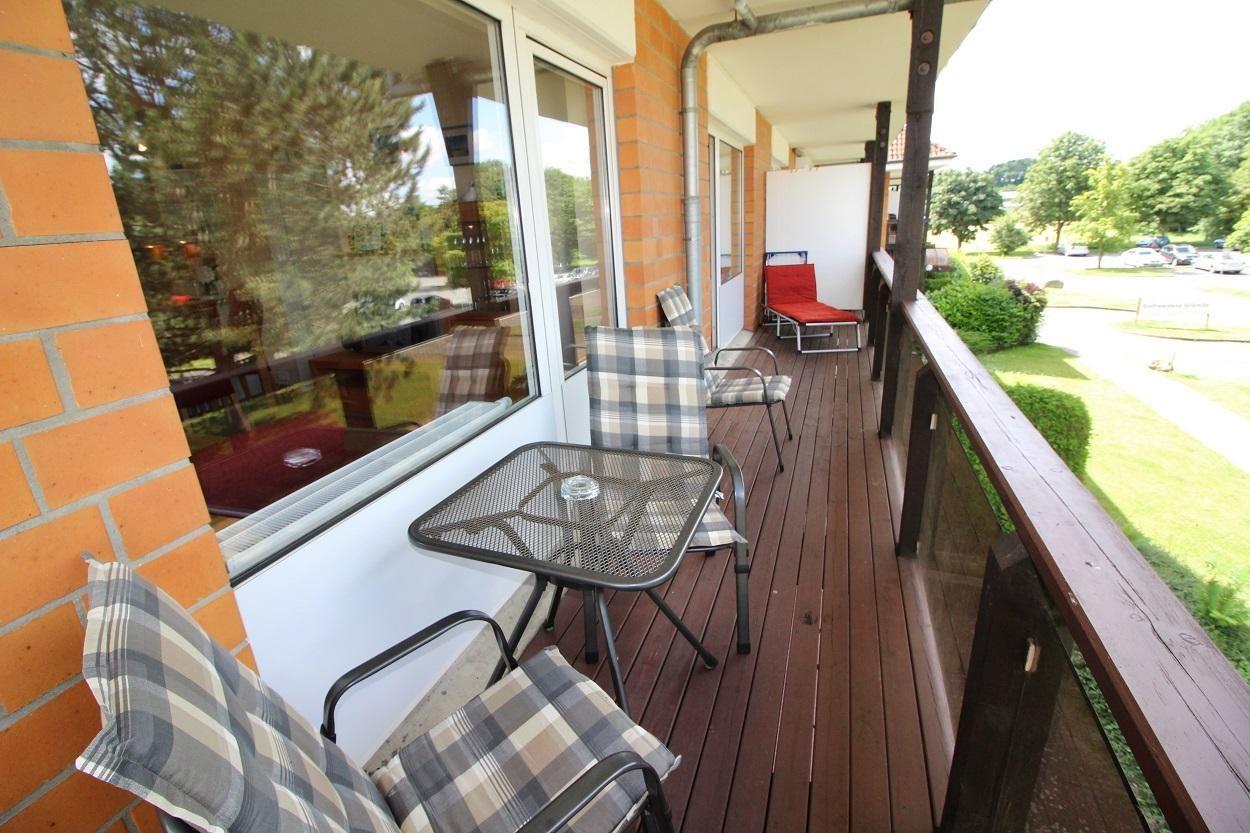 Vom Schlafzimmer, mit einem Doppelbett und Kleiderschrank, gelangen Sie, ebenso wie vom Wohnzimmer, auf den ca. 12 m² großen Balkon mit Gartenmöbeln.