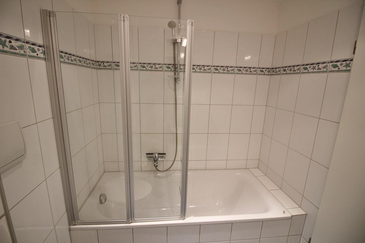 Das Badezimmer verfügt über eine Badewanne, ist hell gefliest und bietet genug Platz für die persönlichen Dinge.