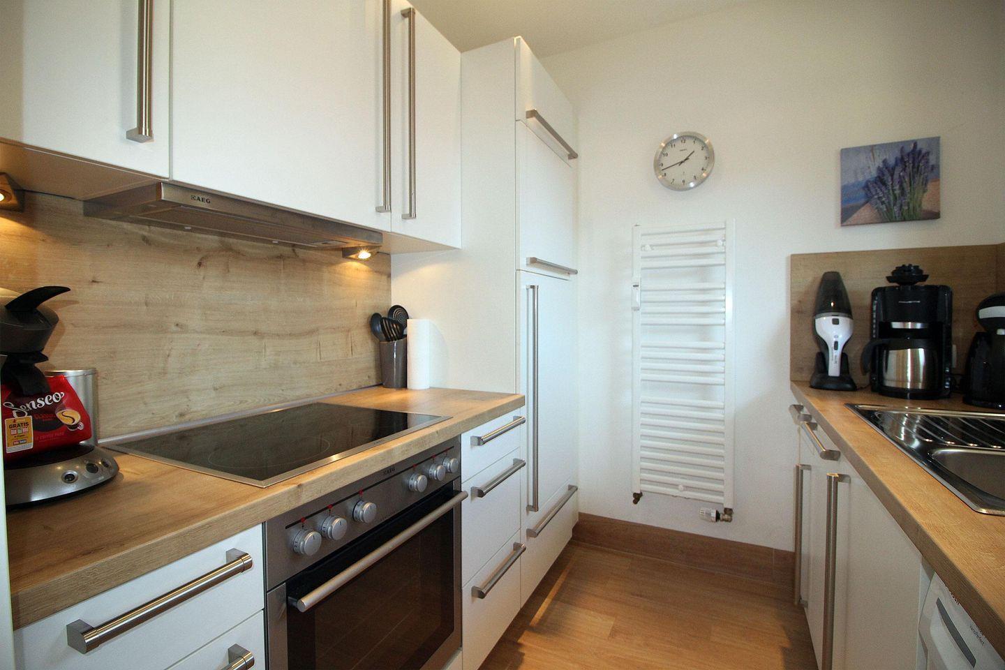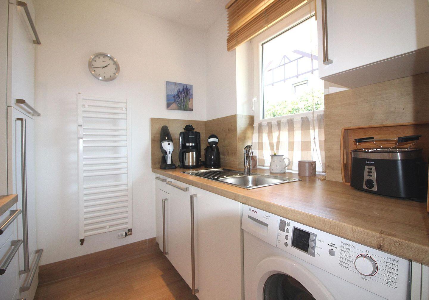 Die Küche ist unter anderem mit einem Backofen, Ceranfeld, einer Geschirrspülmaschine und Waschmaschine ausgestattet.