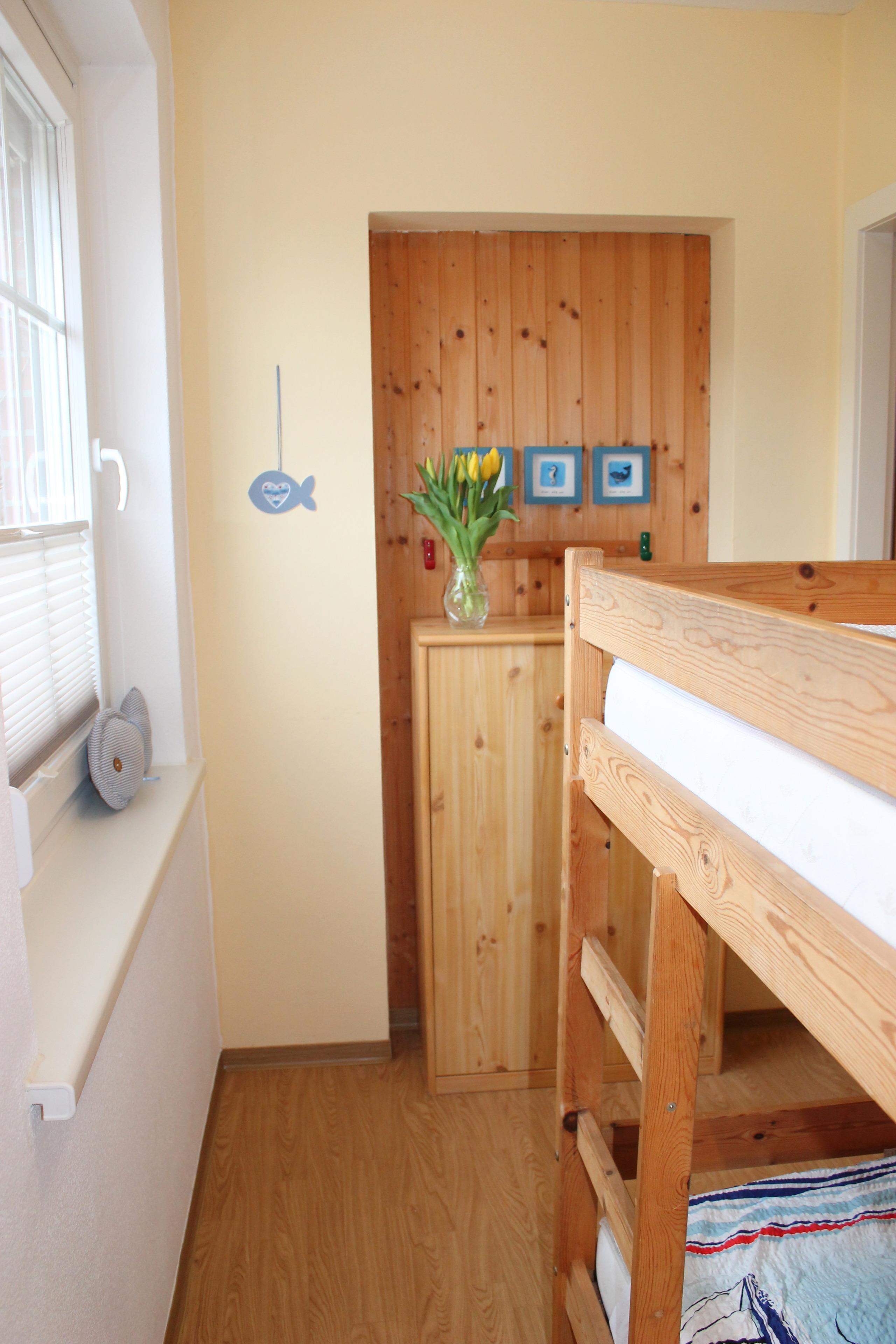 Das kleine separate Schlafzimmer ist mit einem Etagenbett versehen. Die Küchenzeile verfügt u.a. über einen 2-Plattenherd und viele Küchengeräte.