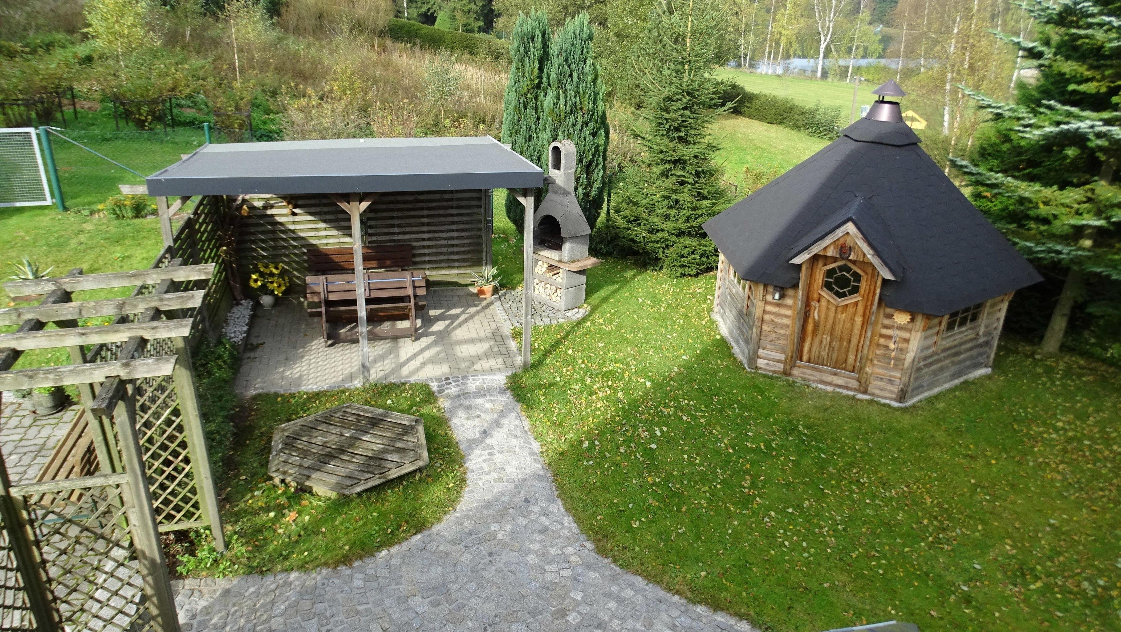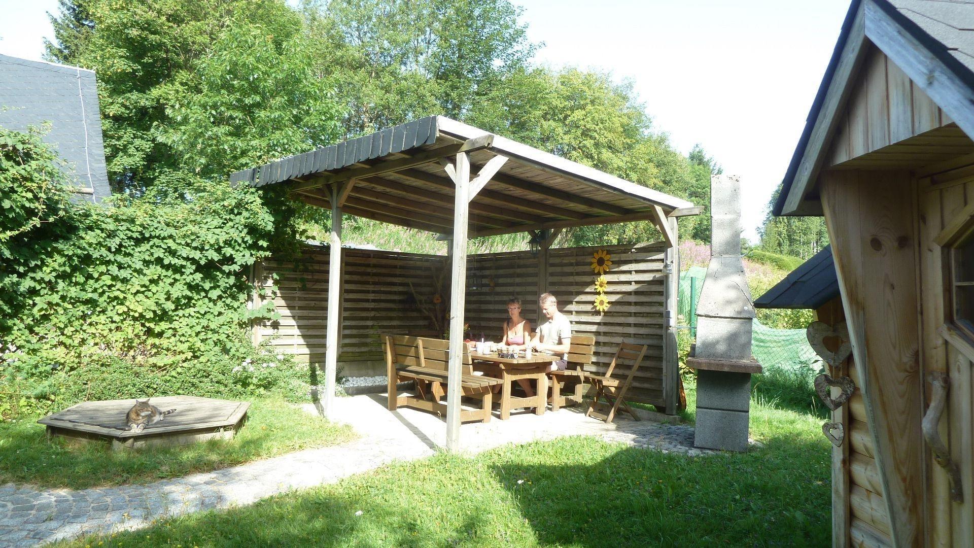 Am Abend lädt die überdachte Sitzecke zum Erholen oder Grillen ein.