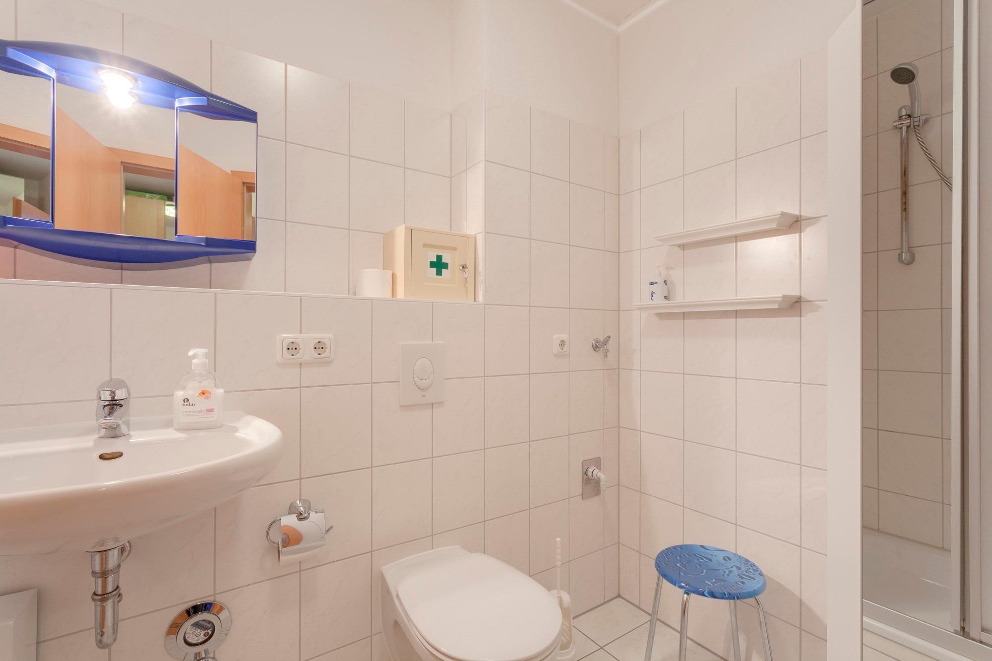 Das Duschbad bietet viele Ablageflächen. Ein Haartrockner steht Ihnen zur Verfügung.
