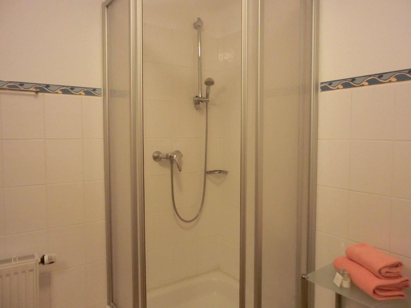 - Das Badezimmer bietet neben Dusche, WC und Waschtisch, genügend Ablagefläche.