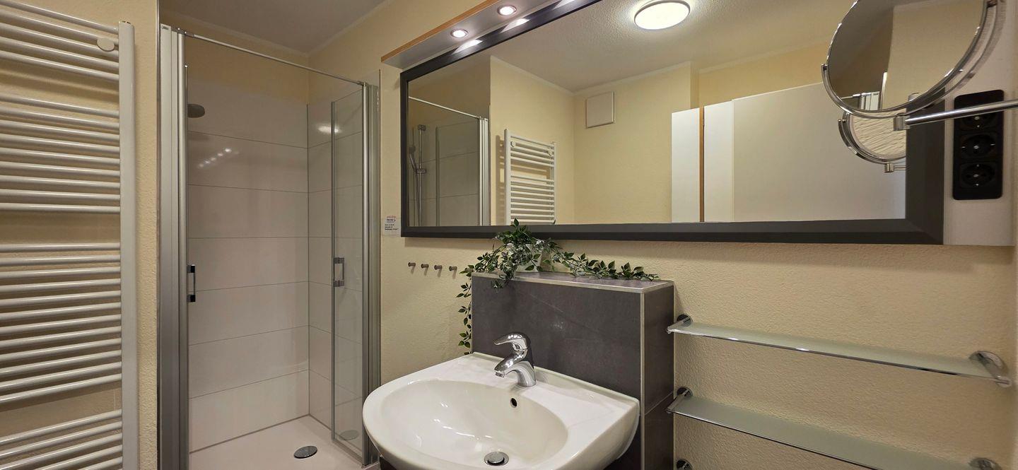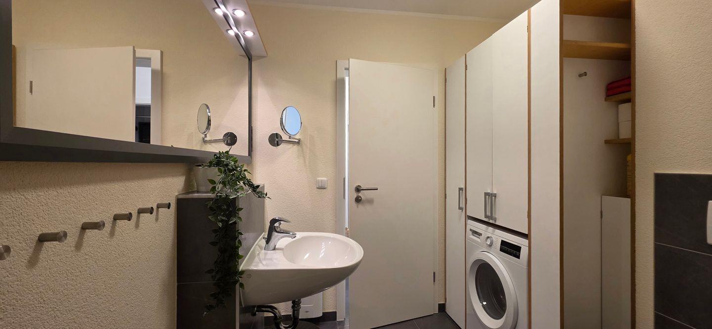 - Badezimmer mit Fußbodenheizung, ebenerdiger 90er Duschtasse mit Glaspendeltür und geräumigen Einbauschrank mit integrierter Waschmaschine