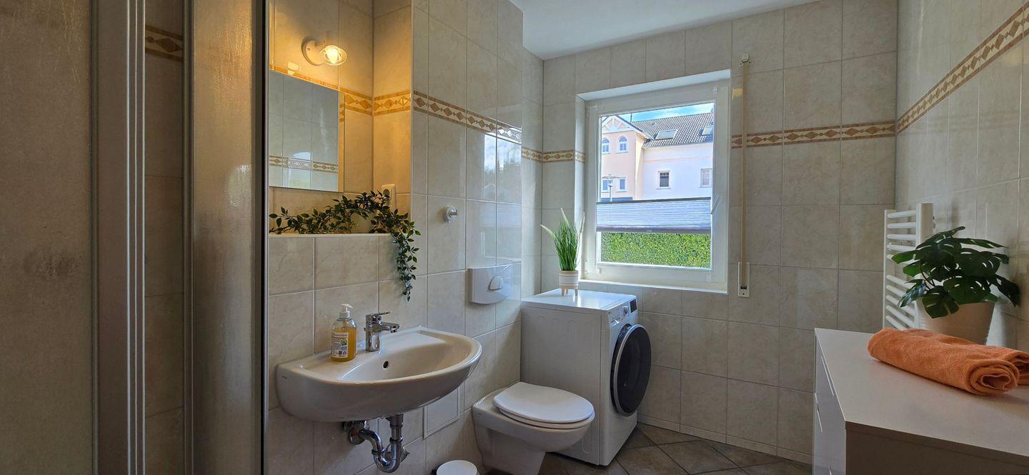 - Das Badezimmer bietet eine Dusche, WC, Waschtisch und eine Waschmaschine.