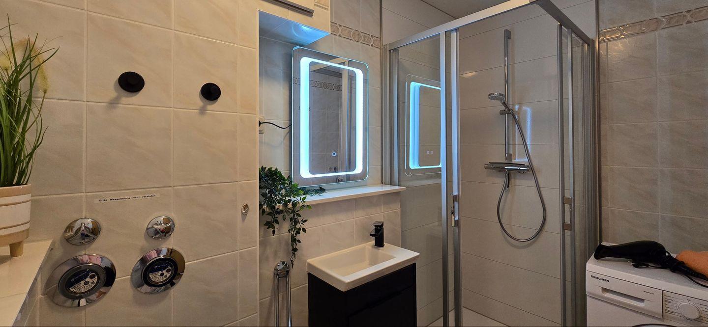 Das Badezimmer ist mit einer Dusche, Waschmaschine und Fön ausgestattet.