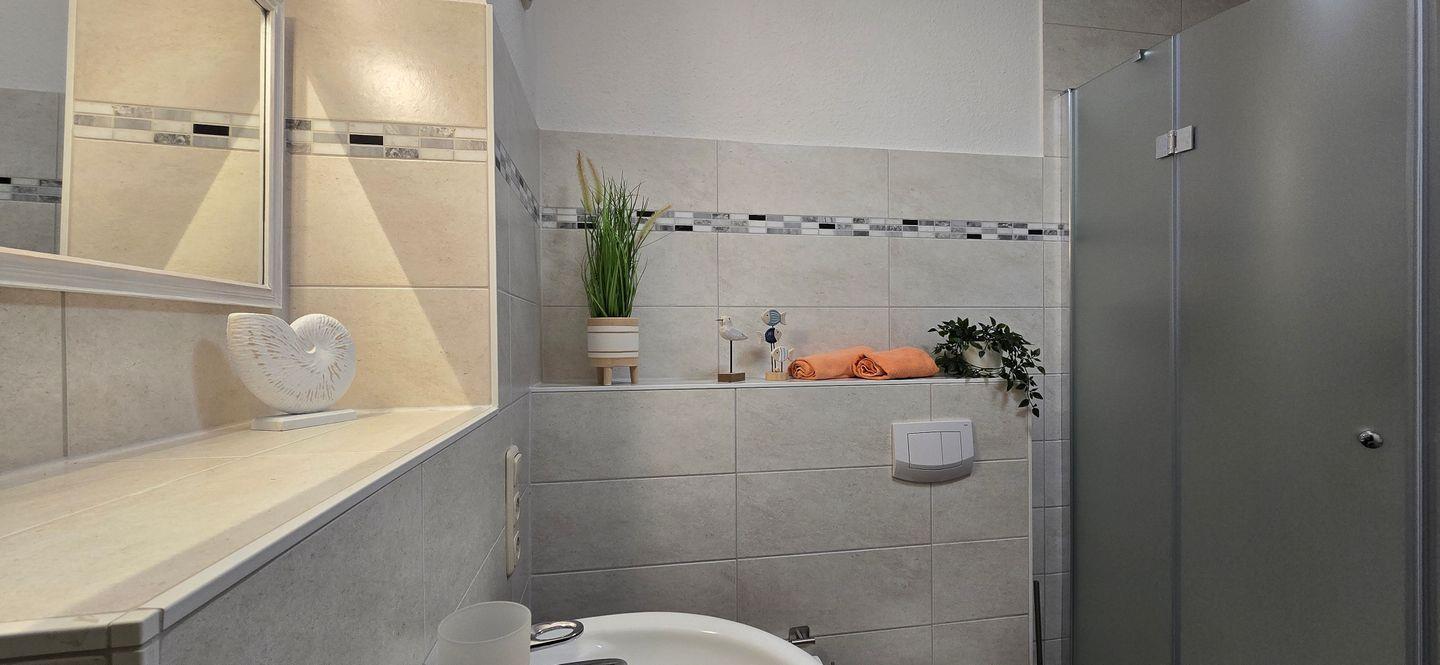 - Badezimmer mit Dusche und Waschmaschine und Fön