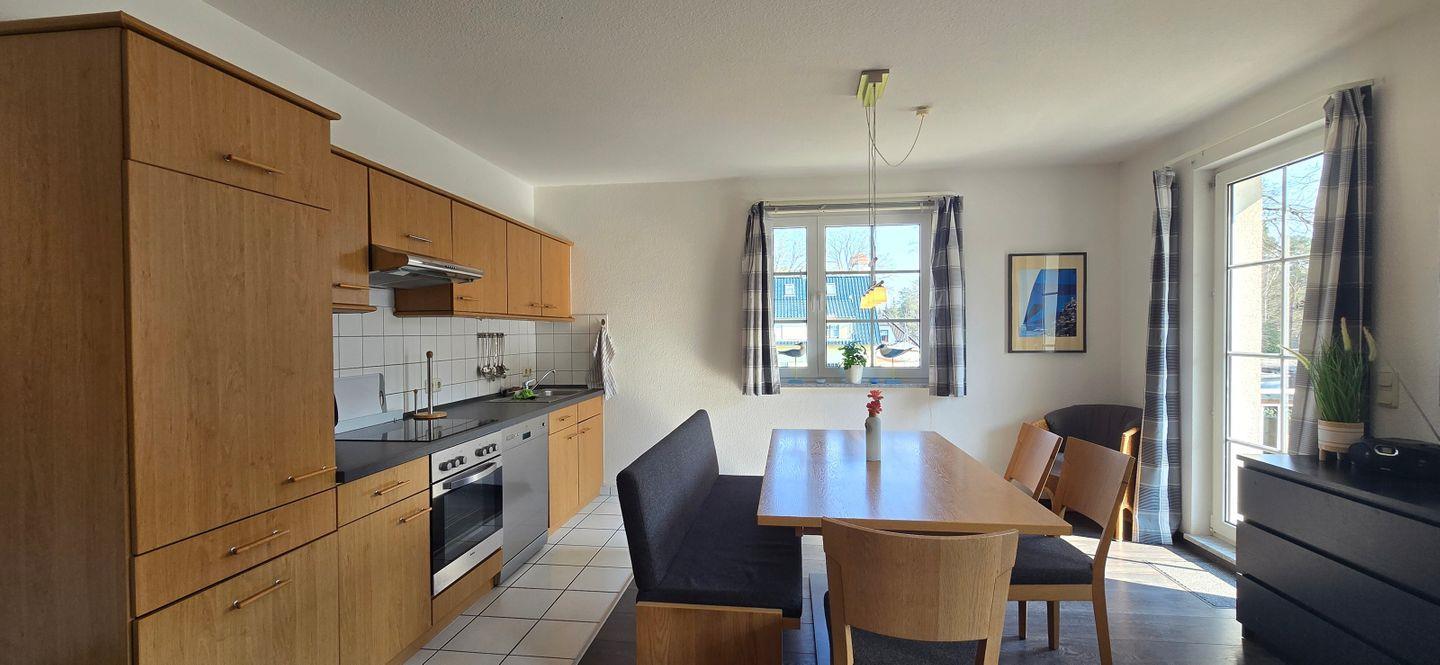 - in separater Ecke im Wohnbereich eine Einbauküche inkl. Geschirrspüler, Herd mit Backofen, Kaffeemaschine, Toaster, Kühlschrank