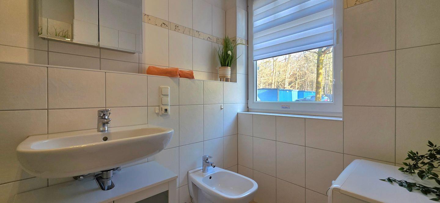 Ein modernes Badezimmer mit Dusche, WC, Bidet und Waschmaschine rundet das Angebot ab.