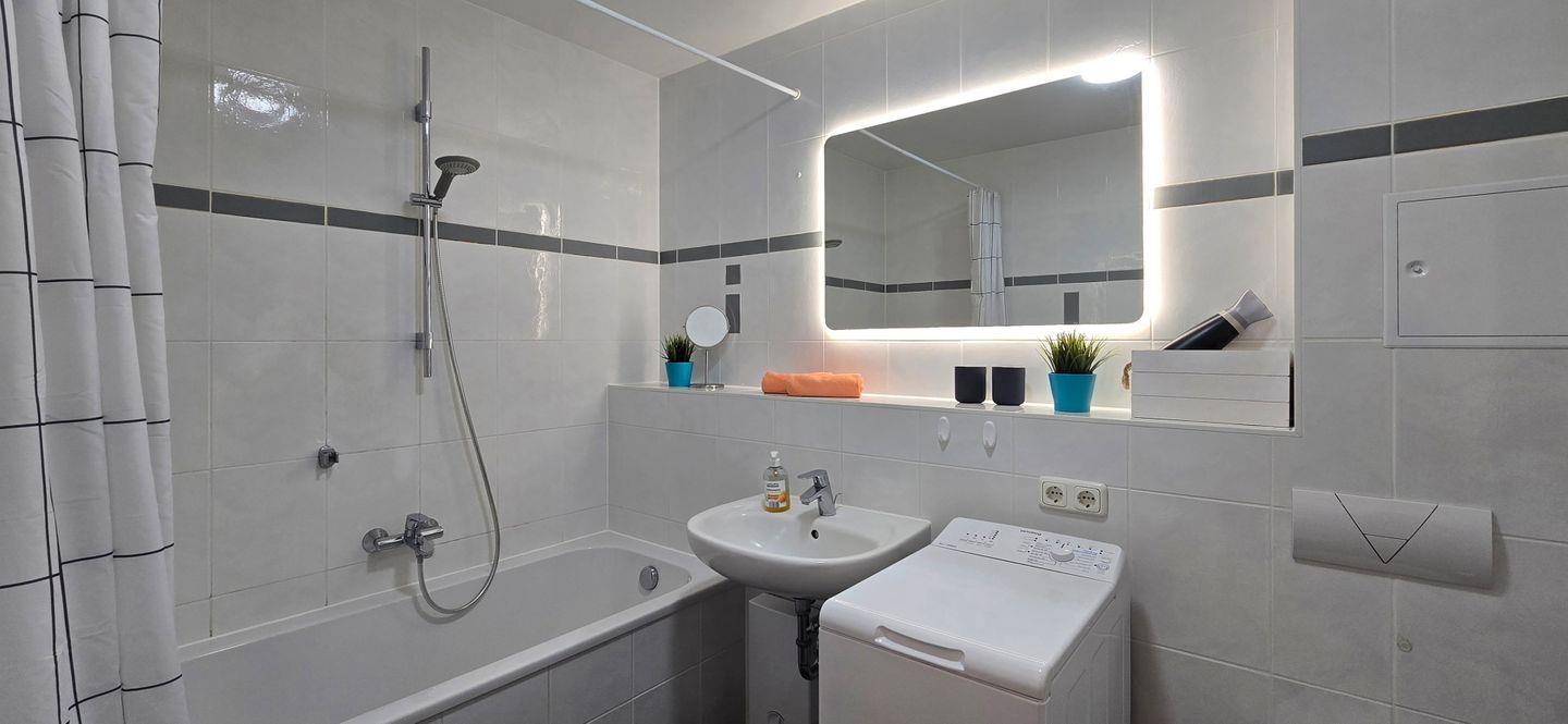 Kleiderschrank, Flatscreen mit Sat-TV, Playstation 3, Radio mit CD & Bluetooth/NFC, Waschmaschine,