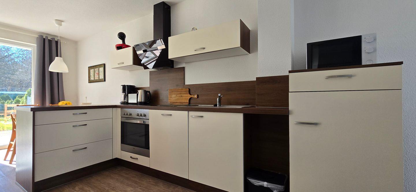 • Offene Küche mit Herd & Backofen & Dunstabzugshaube, Geschirrspülmaschine, Kühlschrank mit Gefrierfach,