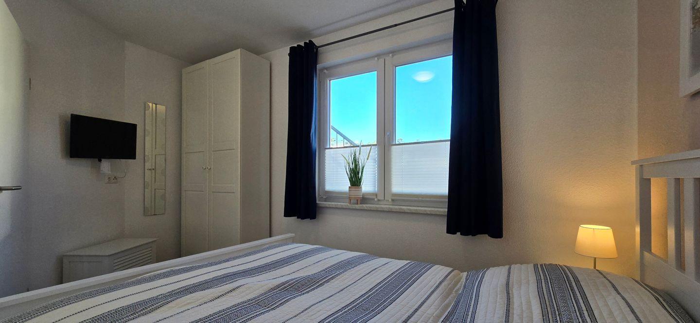 • Schlafzimmer mit Doppelbett (160 cm × 200 cm), Mückengaze, Kleiderschrank und zusätzlichem TV mit DVD-Player