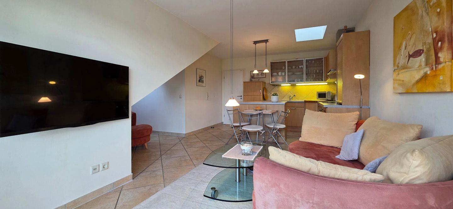 • Wohnbereich mit Sofa, Sessel, TV, Radio und Esstisch für gemeinsame Mahlzeiten