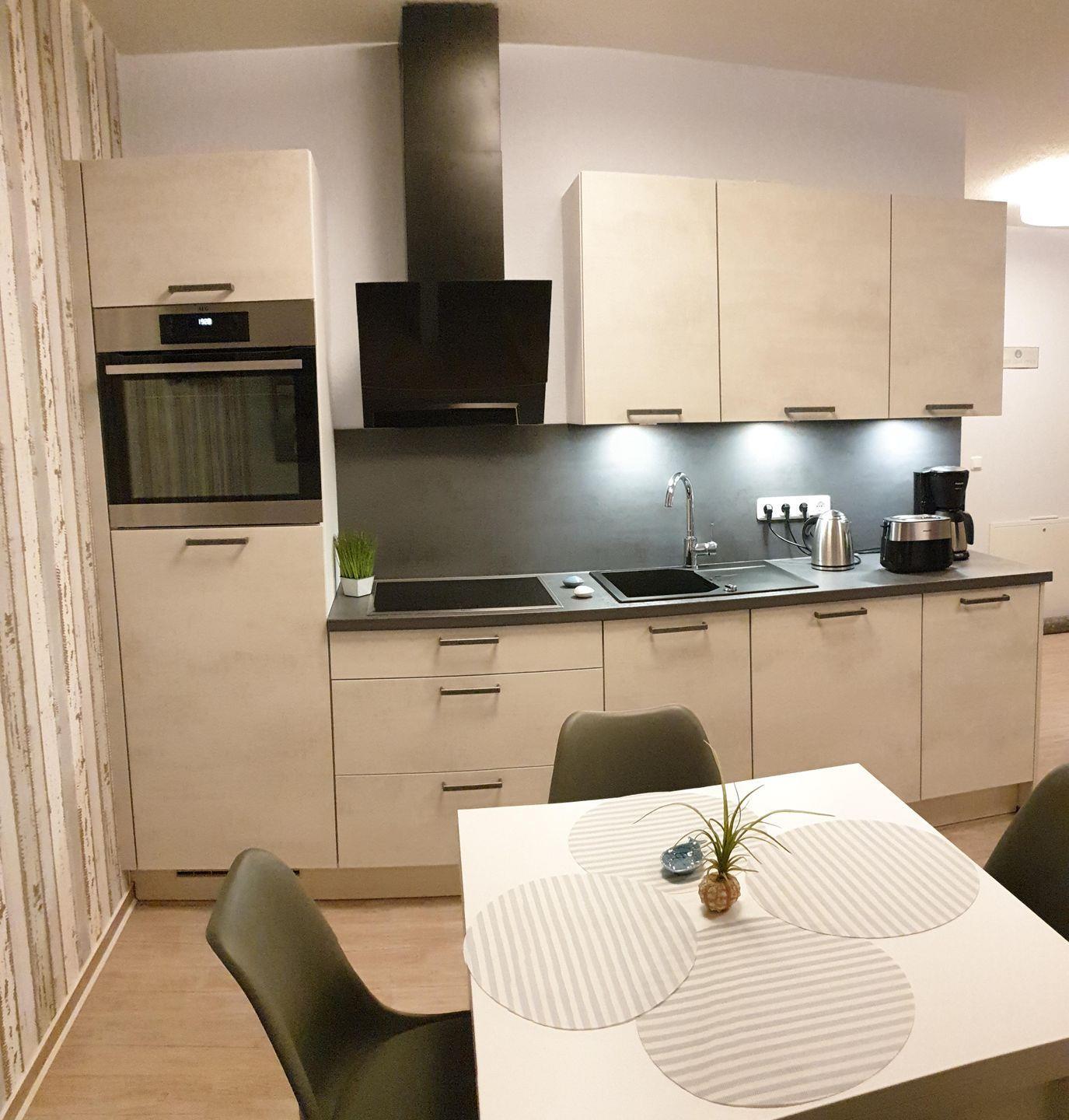 - offene, komplett eingerichtete hochwertige Küche inkl. Induktionsherd, Backofen, Elektrogrill, Geschirrspülmaschine, Kühlschrank, Mikrowelle, Kaffeemaschine, Toaster, Wasserkocher
