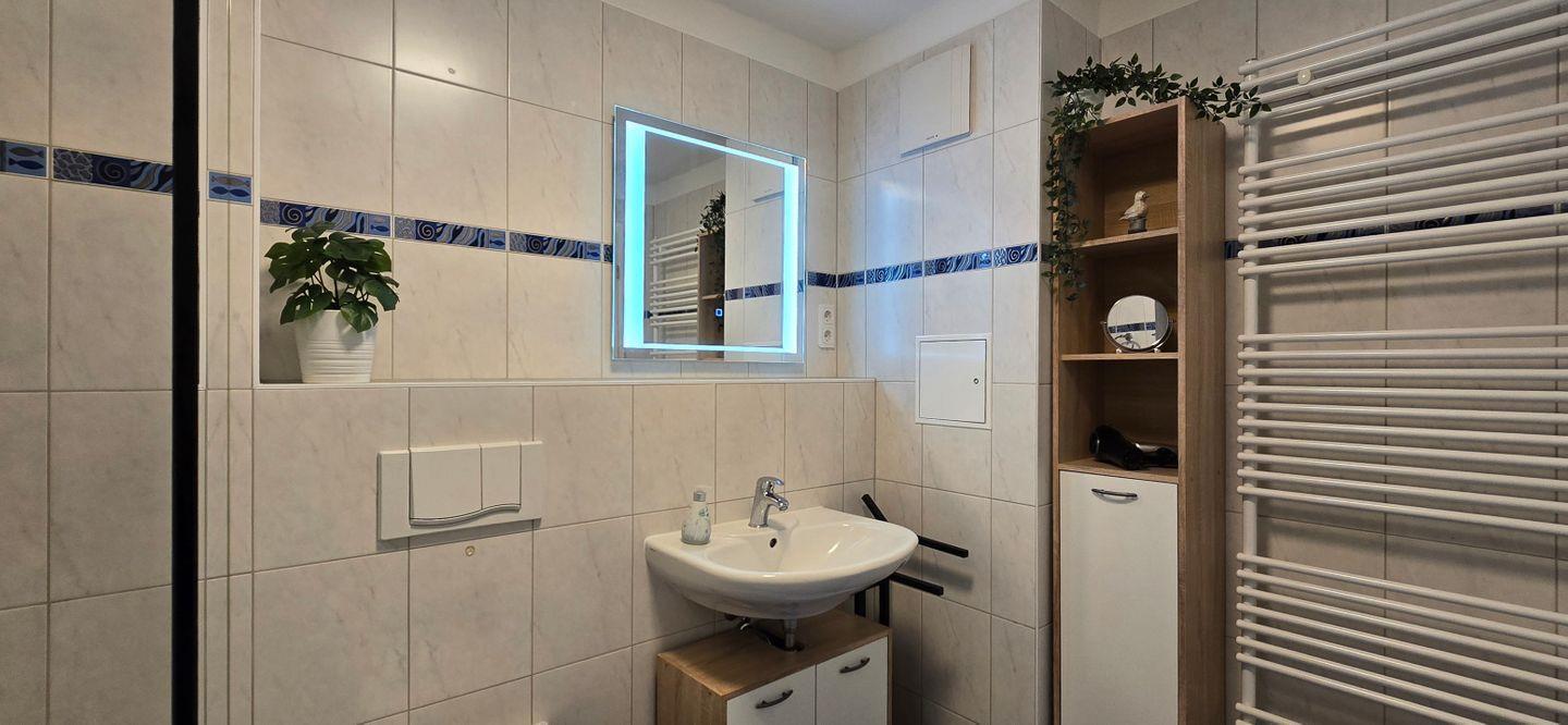 - Das große, moderne Badezimmer bietet neben einer geräumigen Dusche, WC und Waschtisch, genügend Ablagefläche. Ein Fön ist vorhanden.