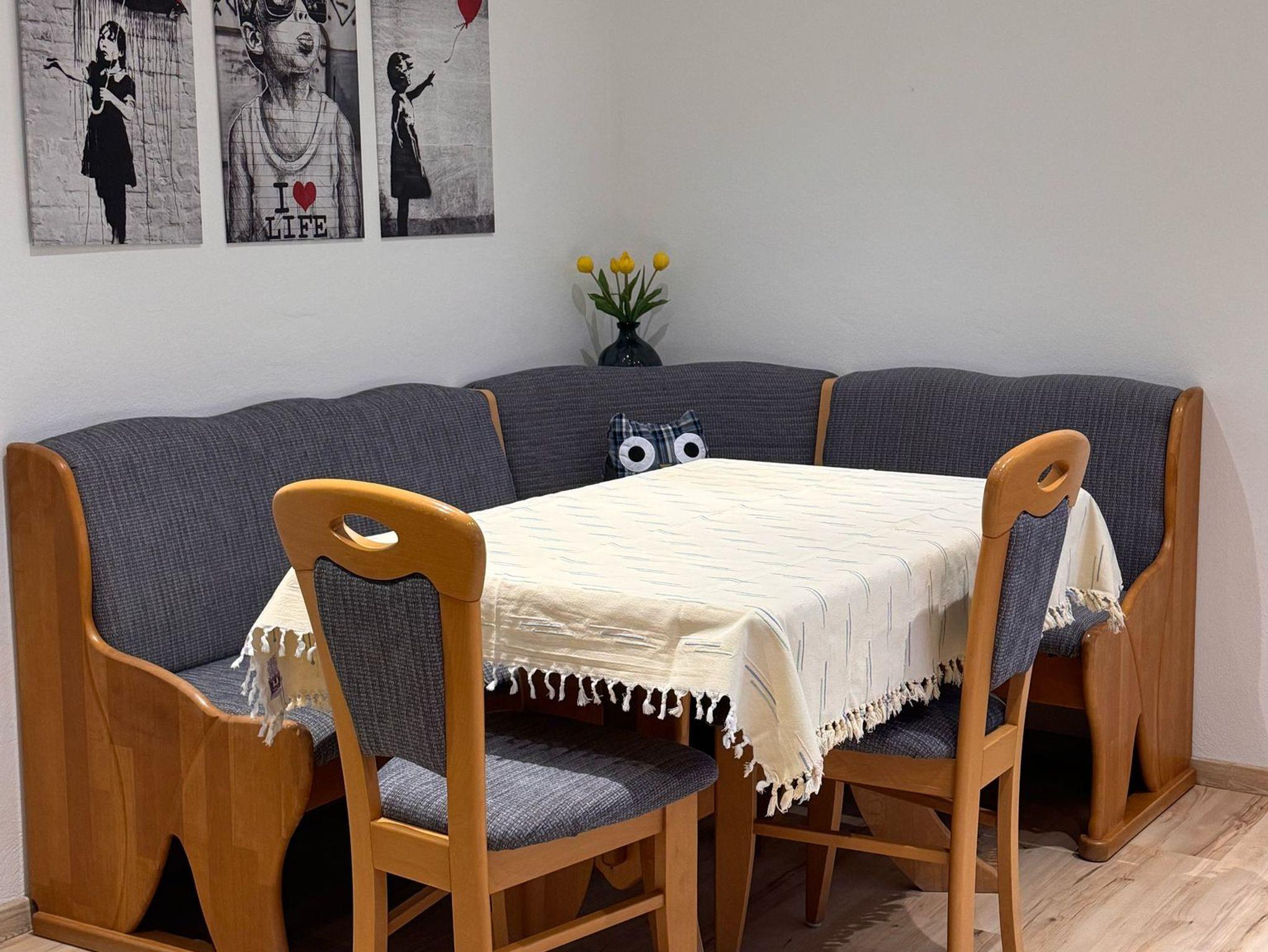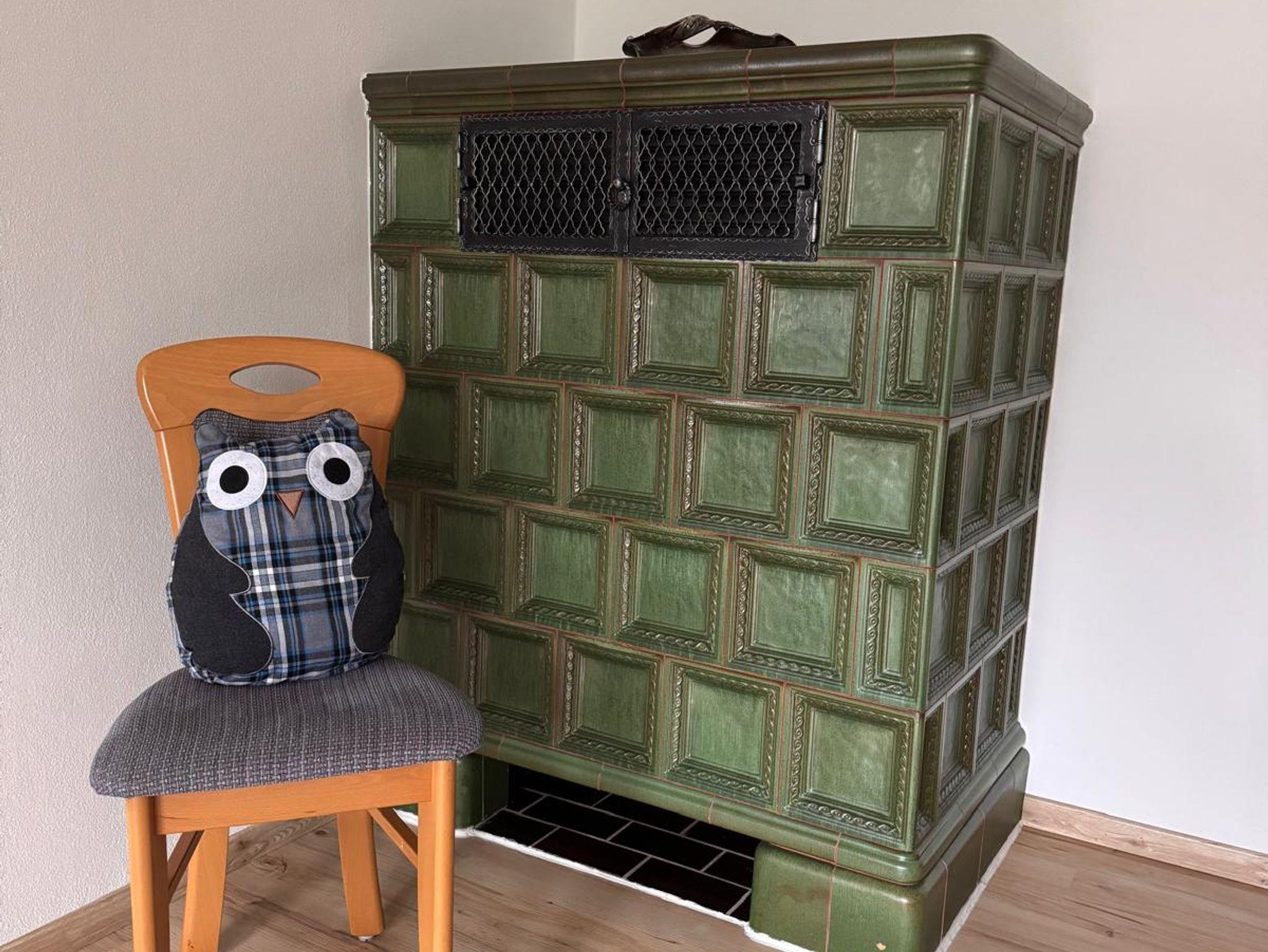 Das geräumige Wohnzimmer hat eine 2-Sitzer-Couch sowie einen großen Beistellhocker. Der Kachelofen zaubert wohlige Wärme in den Wohn-/Essbereich, der mit einer Buchen Eckbank ausgestattet ist.