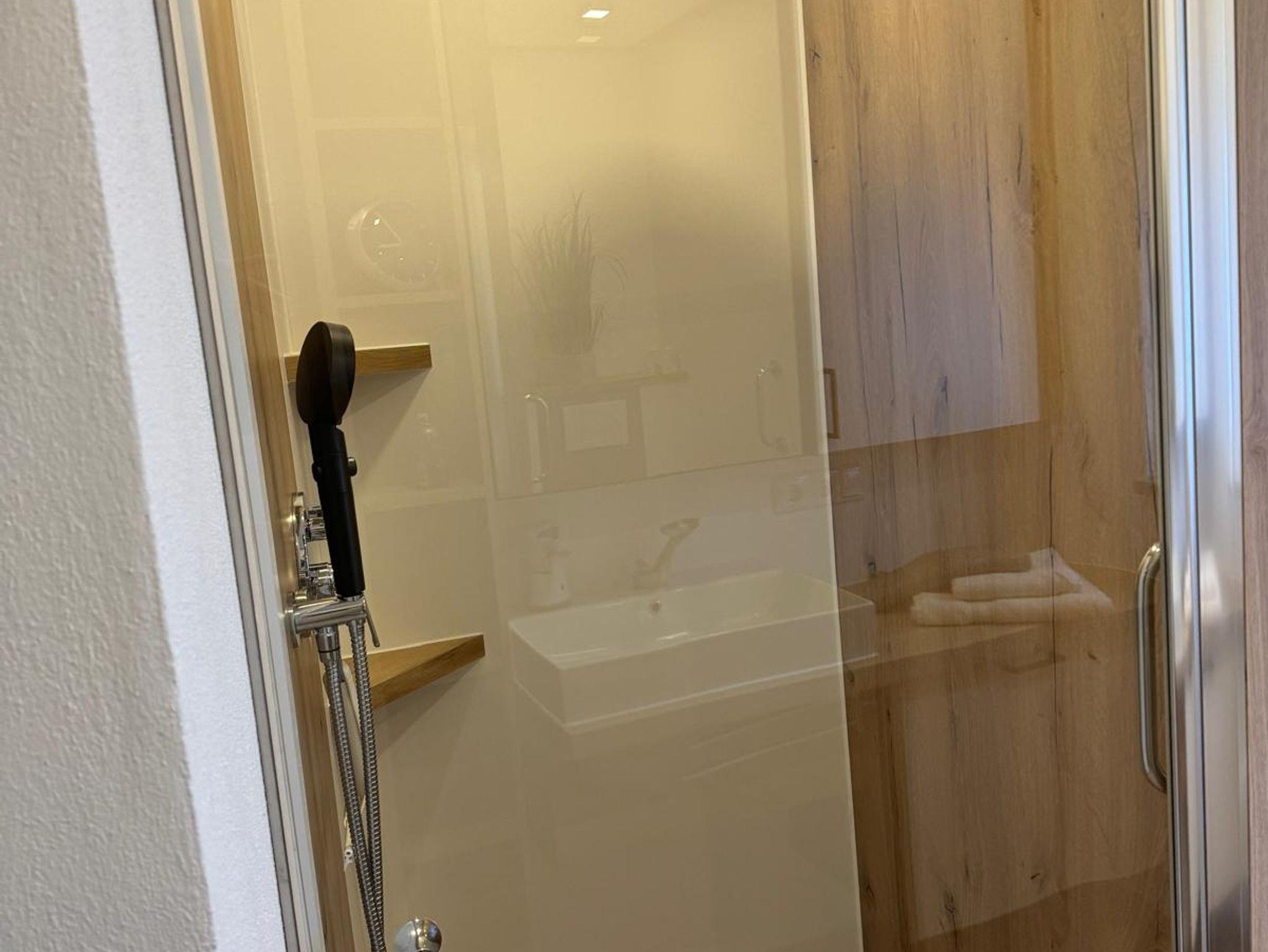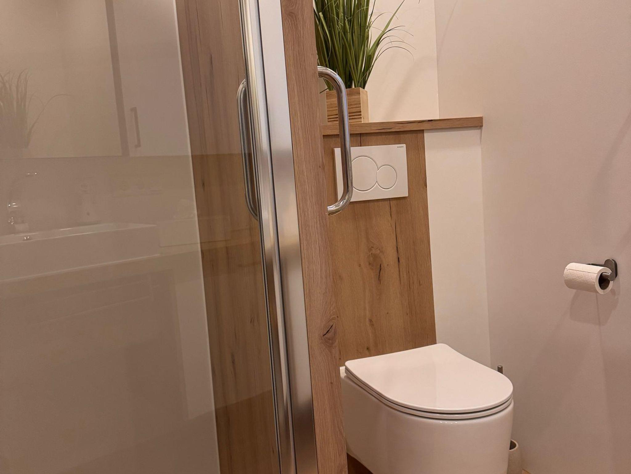 Das moderne Bad ist mit Holzmöbeln ausgestattet und einer ebenerdigen Dusche 90 x 90 cm. Ein Handtuchtrocker zaubert wohlig warme Handtücher.