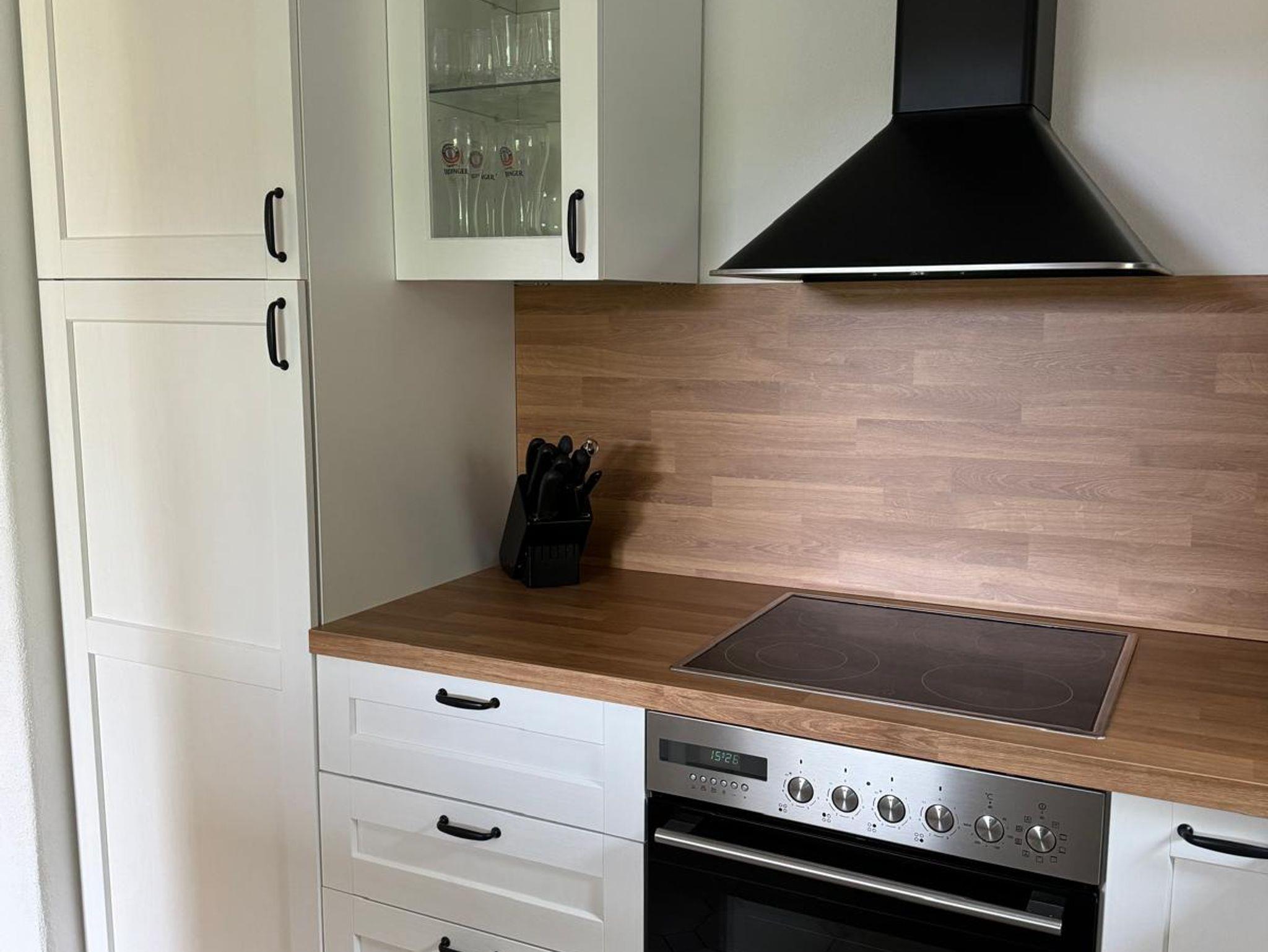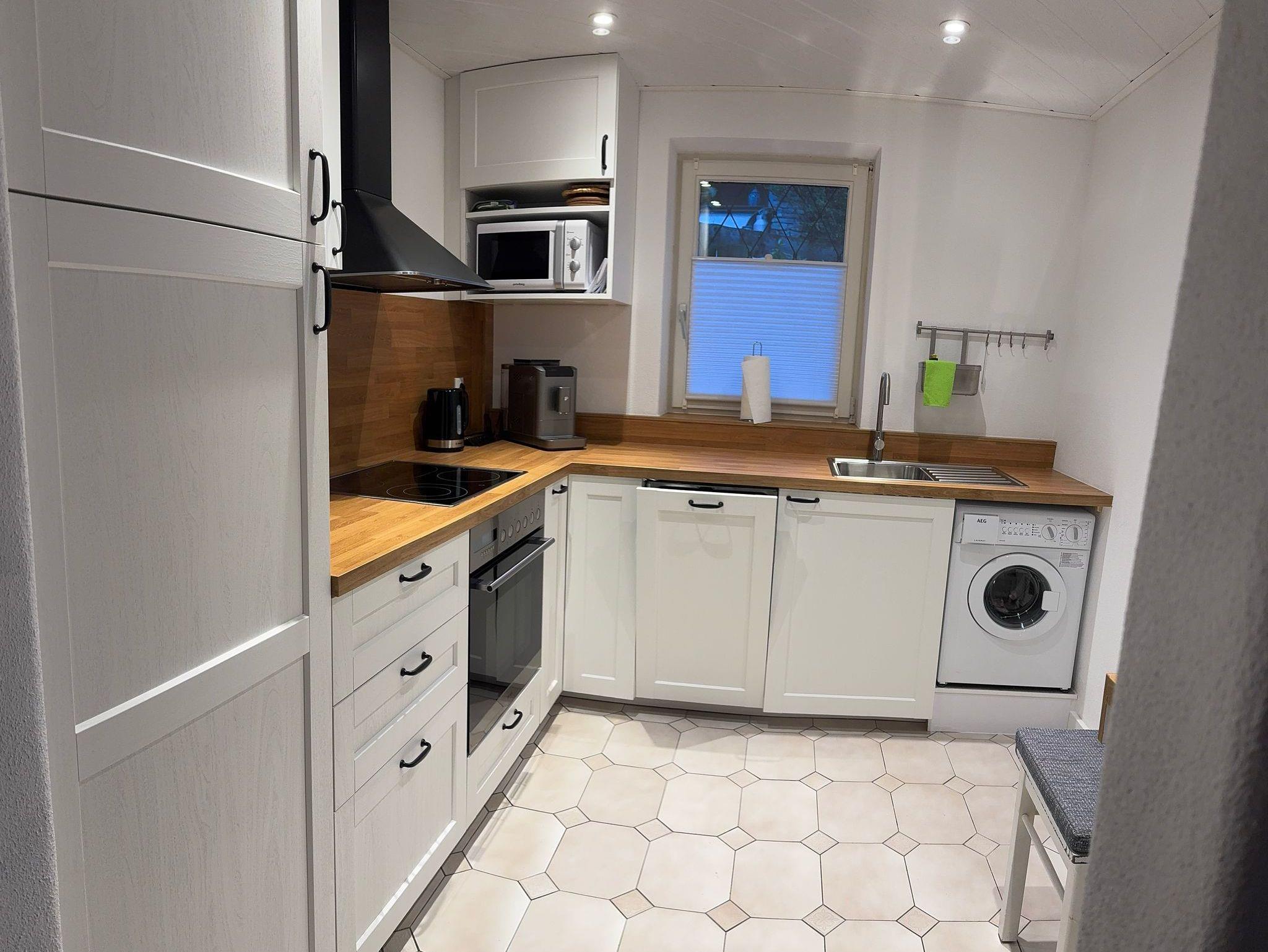 Die neue Küche hat einen großen Kühlschrank mit Gefrierfach. Es sind alle notwendigen Küchengeräte vorhanden. Ebenso findet sich ein Kaffeevollautomat für den morgendlichen Kaffee.