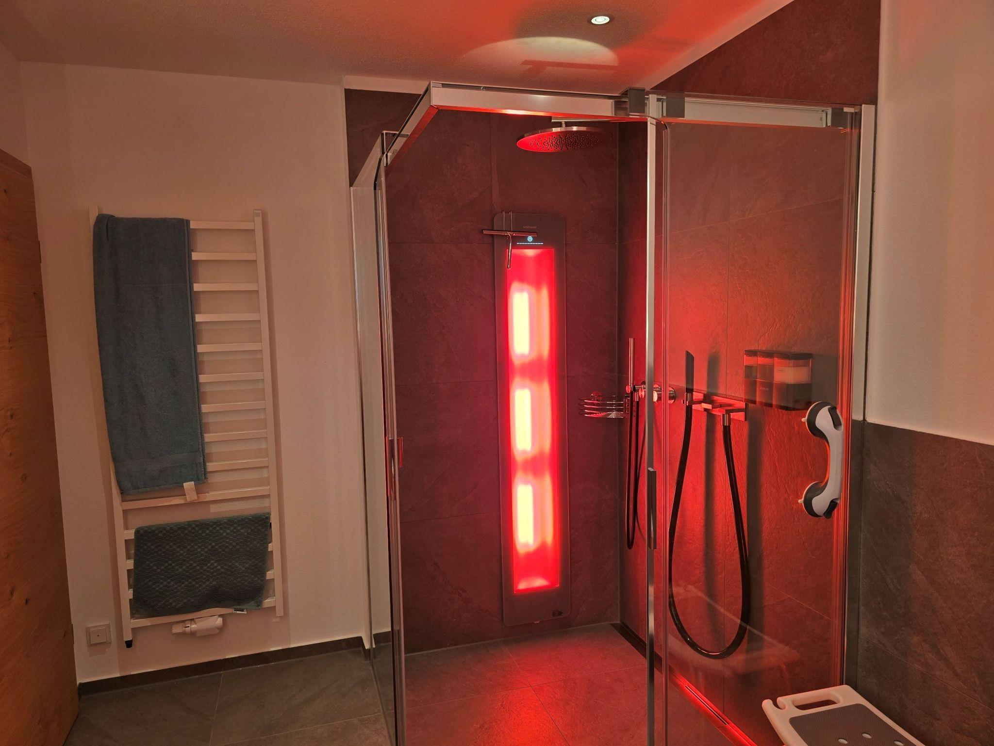 Das Bad verfügt über eine Regendusche sowie eine Infrarot-Sonnendusche zum Aufwärmen. Ein separates WC sorgt für zusätzlichen Komfort. Technisch ist die Wohnung bestens ausgestattet: Smart-Home-System (Loxone), Lüftungsanlage mit Pollenfilter, Farbbeleuchtung, Lautsprechersystem, kostenlosen highspeed WLAN, extragroßen Smart-TV – alles vorhanden, um den Aufenthalt angenehm zu gestalten.