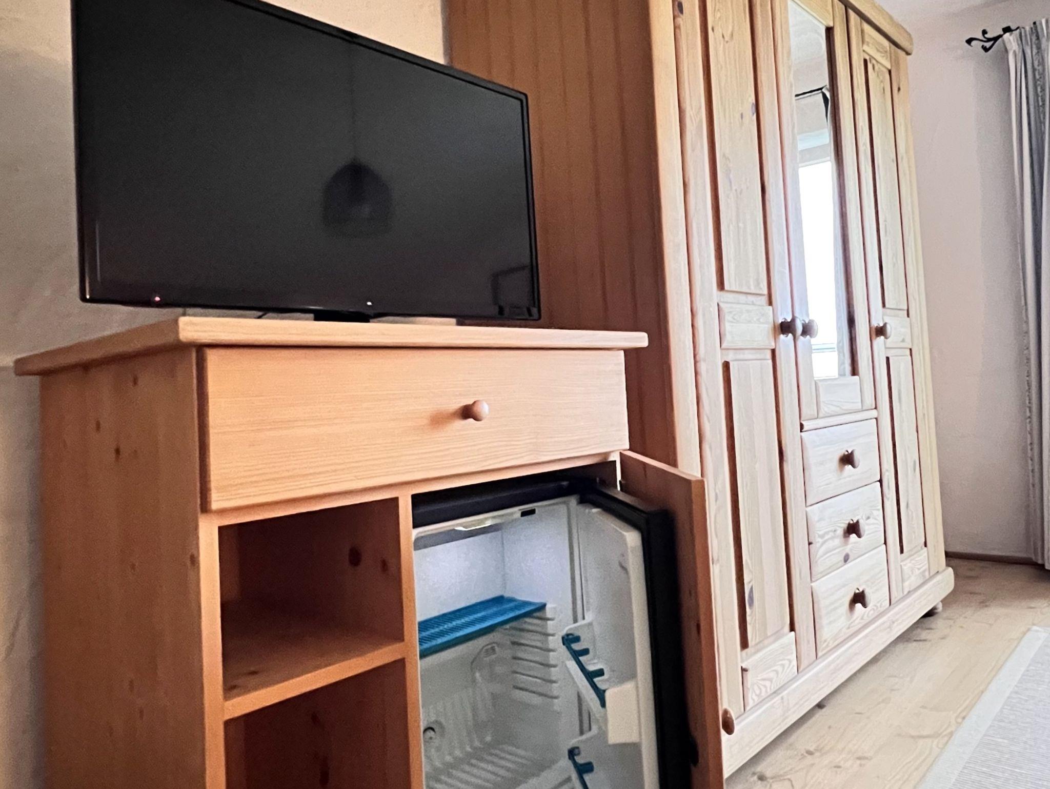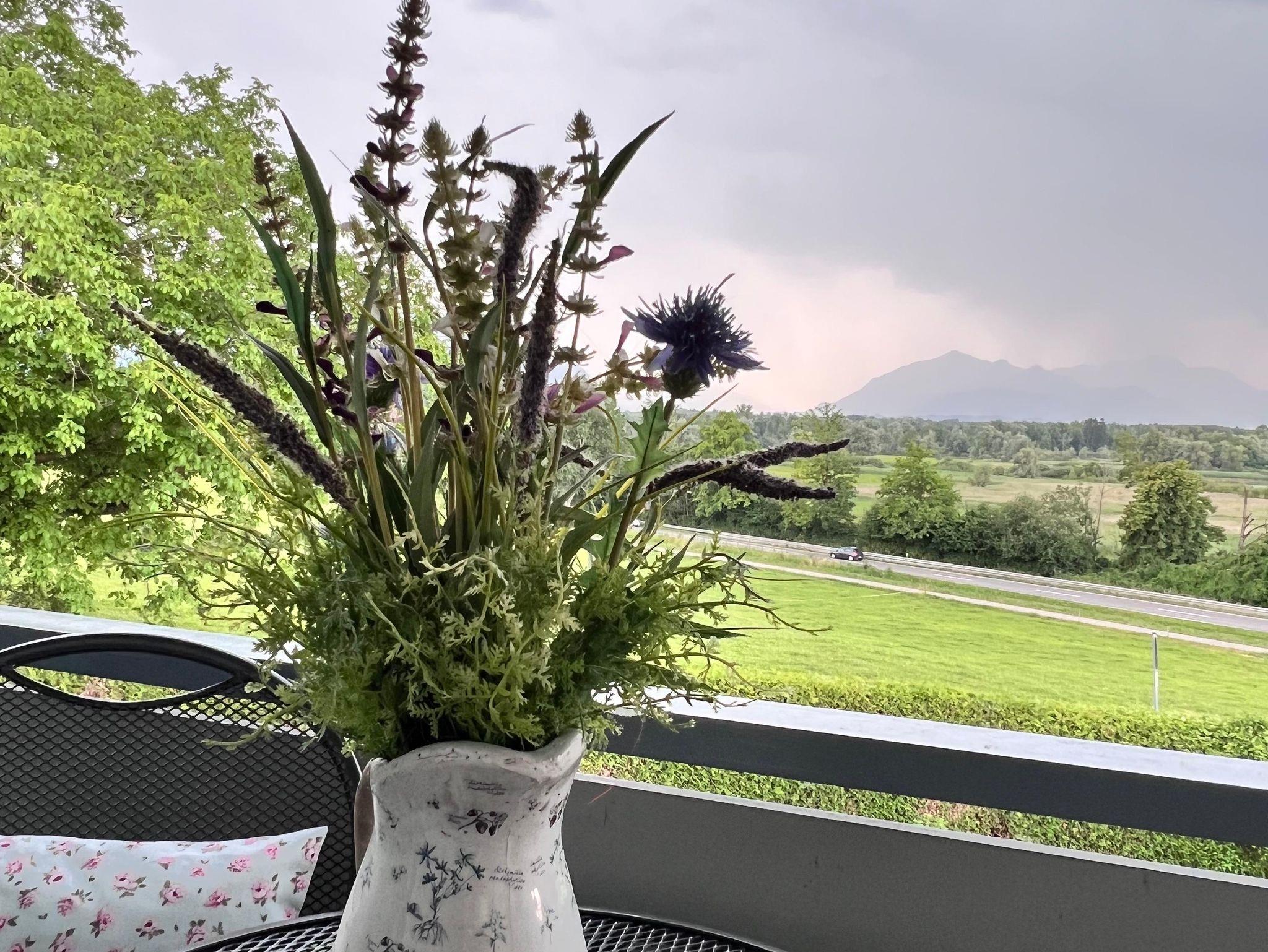 Neu eingerichtetes Balkonzimmer (25 qm) mit Chiemsee-Alpenpanoramablick. Boxspringbett mit 2 m Länge. Bad, das mit Dusche/WC und Waschbecken direkt mit dem Zimmer verbunden ist. Entlüftung durch einen Entlüfter. Sitzgruppe: Tisch, 2 Stühle, Sofa. TV. Nichtraucherzimmer, keine Haustiere.