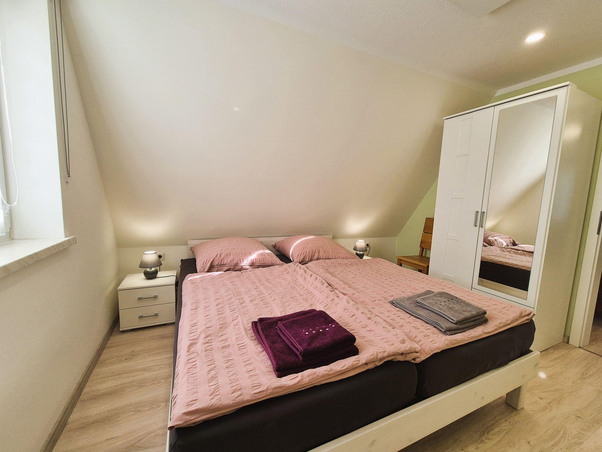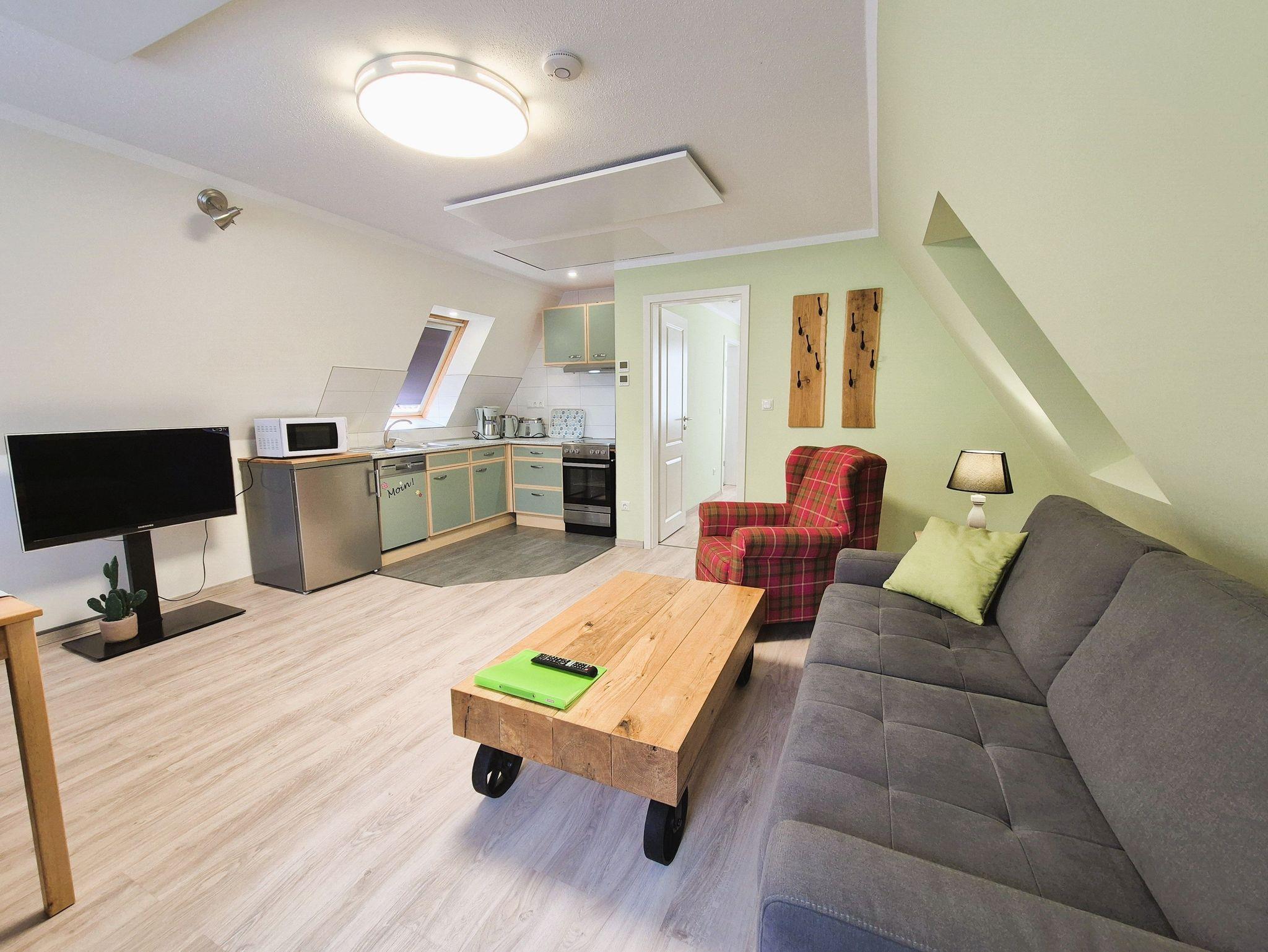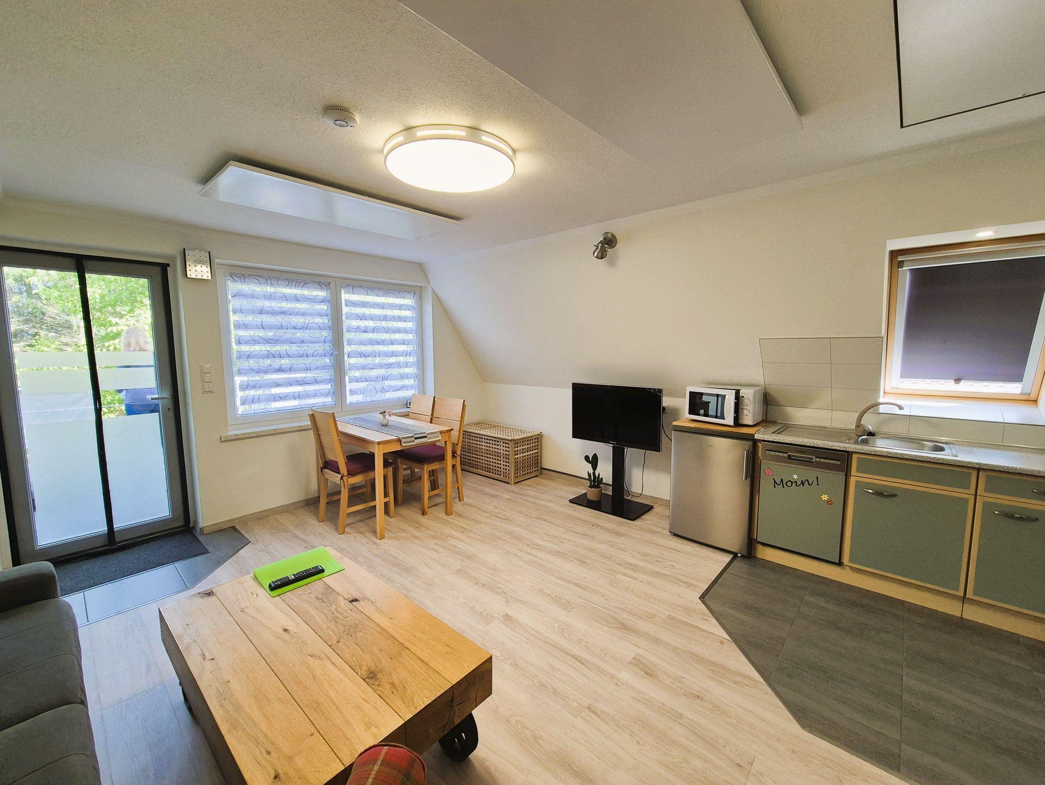 Unsere Ferienwohnung begrüßt Sie mit einem großzügigen Wohn-, Koch- und Essbereich, die keine Wünsche offenlässt. Entspannen Sie auf der gemütlichen Couchlandschaft, genießen Sie Ihre Lieblingssendungen auf dem Flachbild-TV und speisen Sie in der einladenden Essecke. Die moderne Küchenzeile ist mit allen wichtigen technischen Details ausgestattet, so dass es Ihnen an nichts fehlt. Im Schlafzimmer erwartet Sie ein komfortables Doppelbett, begleitet von Nachttischen und einem geräumigen Kleiderschrank. Von dort aus gelangen Sie direkt in das helle Tageslichtbad mit begehbarer Dusche ? der perfekte Ort, um den Tag entspannt zu beginnen!
