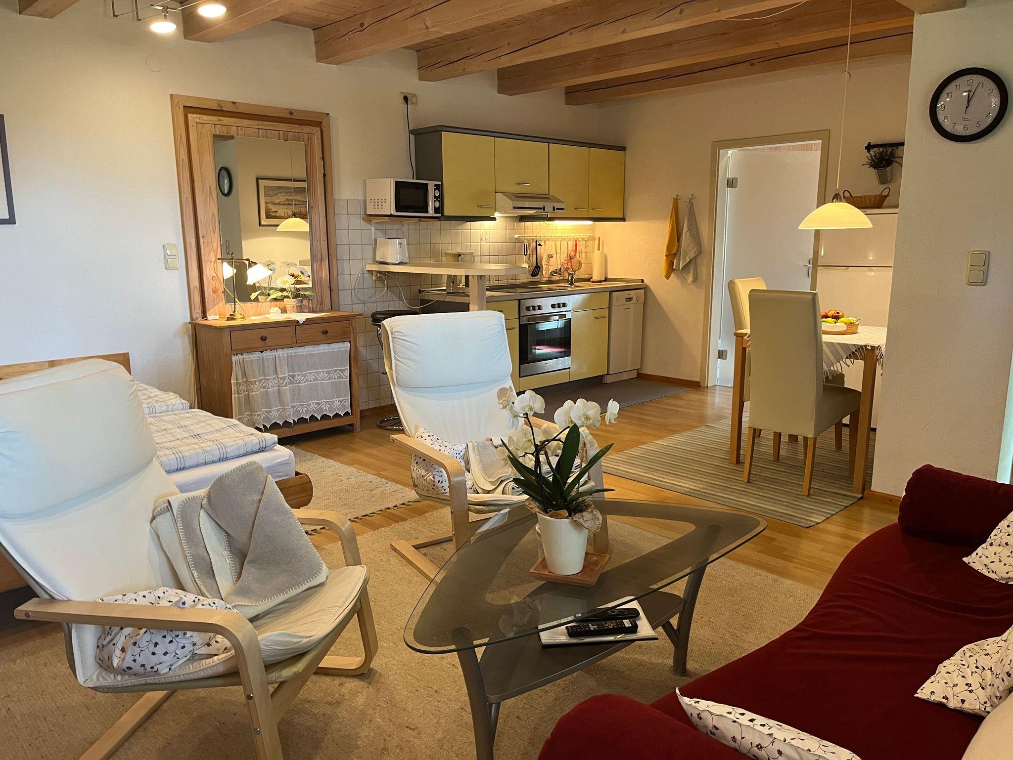 zwei bequeme Sessel, ein Couchtisch, TV, Radio und WLAN. Im Schlafbereich gibt es ein Doppelbett 200x180 (Bettwäsche ist im Preis enthalten) sowie einen Kleiderschrank.