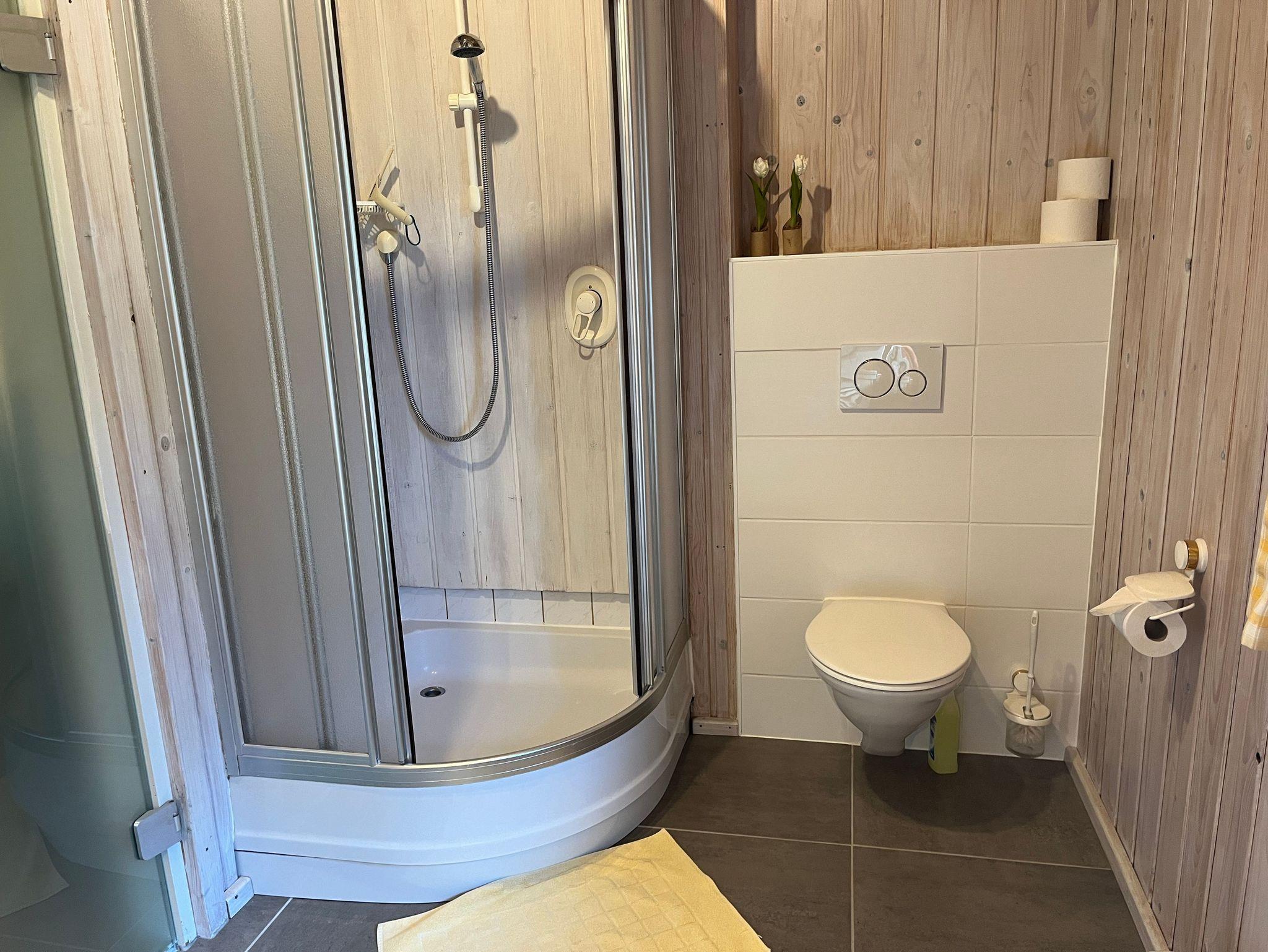 Das helle Bad mit Fenster ist ausgestattet mit Dusche, WC, großem Waschtisch mit Spiegel, Kosmetikspiegel, Föhn sowie WC Papier. Hand und Badetücher sind im Preis enthalten.
