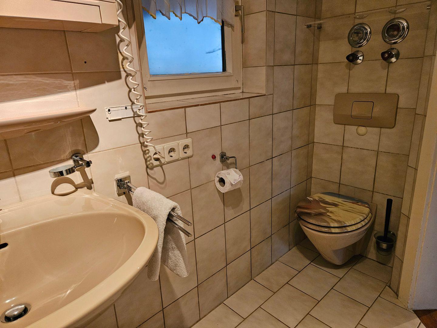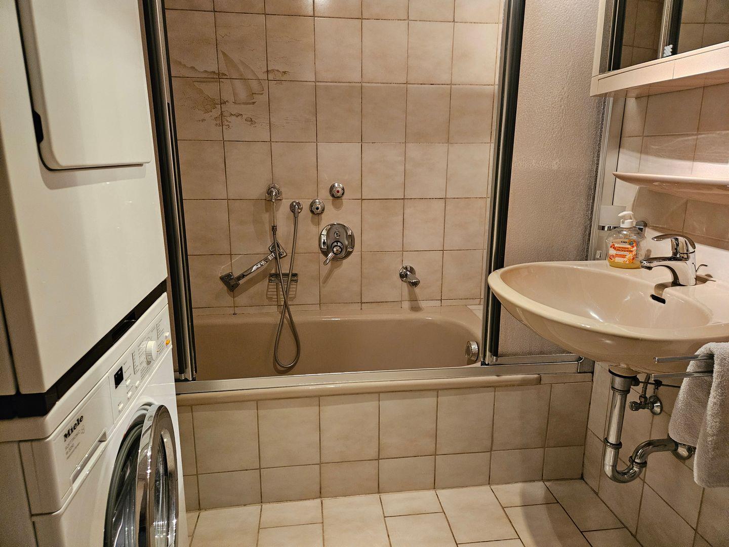 Die Ferienwohnung bietet ein gemeinsames Badezimmer, das sowohl mit einer Dusche als auch einer Badewanne ausgestattet ist. Zusätzliche Annehmlichkeiten wie eine Waschmaschine, ein Trockner und ein Haartrockner sind vorhanden, um Ihnen den Aufenthalt so angenehm wie möglich zu gestalten.