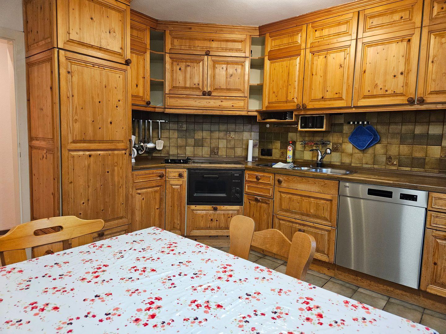 Der gemütliche Wohnbereich ist der perfekte Ort für geselliges Beisammensein. Hier finden Sie bequeme Sofas und einen Satelliten-TV für entspannte Filmabende. Die moderne Küche, die mit einem Ceranfeld, Backofen, Kühlschrank, Geschirrspüler und weiteren Küchenutensilien ausgestattet ist, lädt dazu ein, kulinarische Köstlichkeiten zuzubereiten. Genießen Sie Ihre selbst zubereiteten Mahlzeiten am Esspletz in der Küche oder auf der Terrasse, die zum Verweilen und Entspannen einlädt. Hier finden Sie ein weiteres Einzelbett vor.