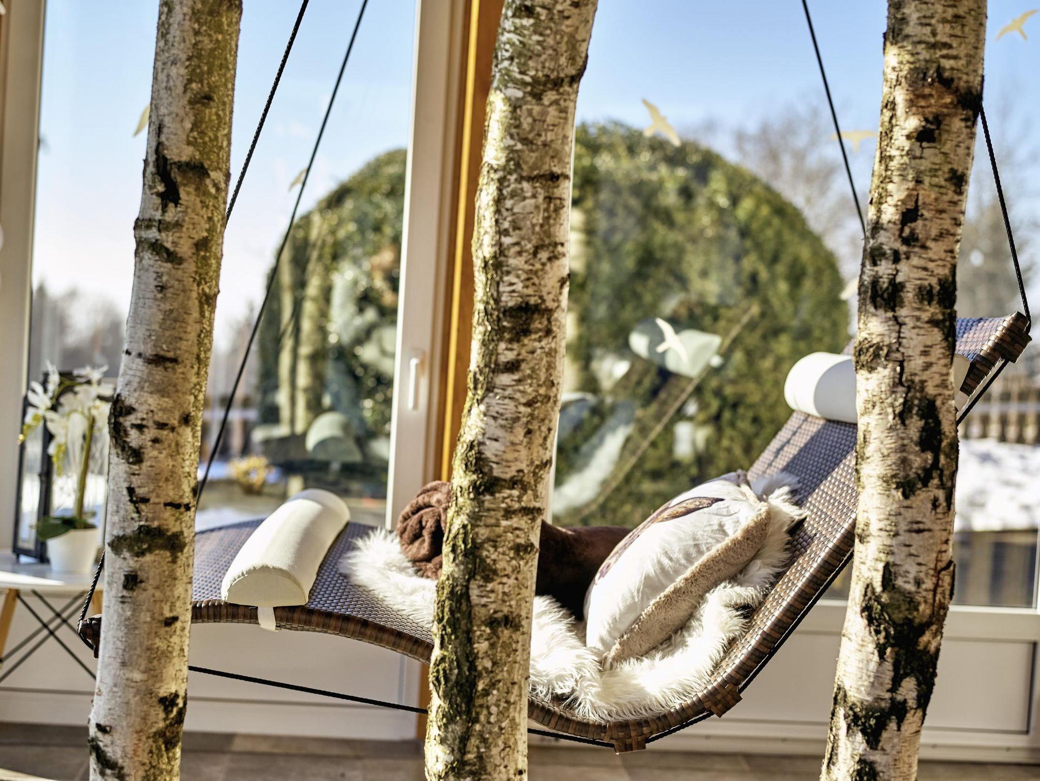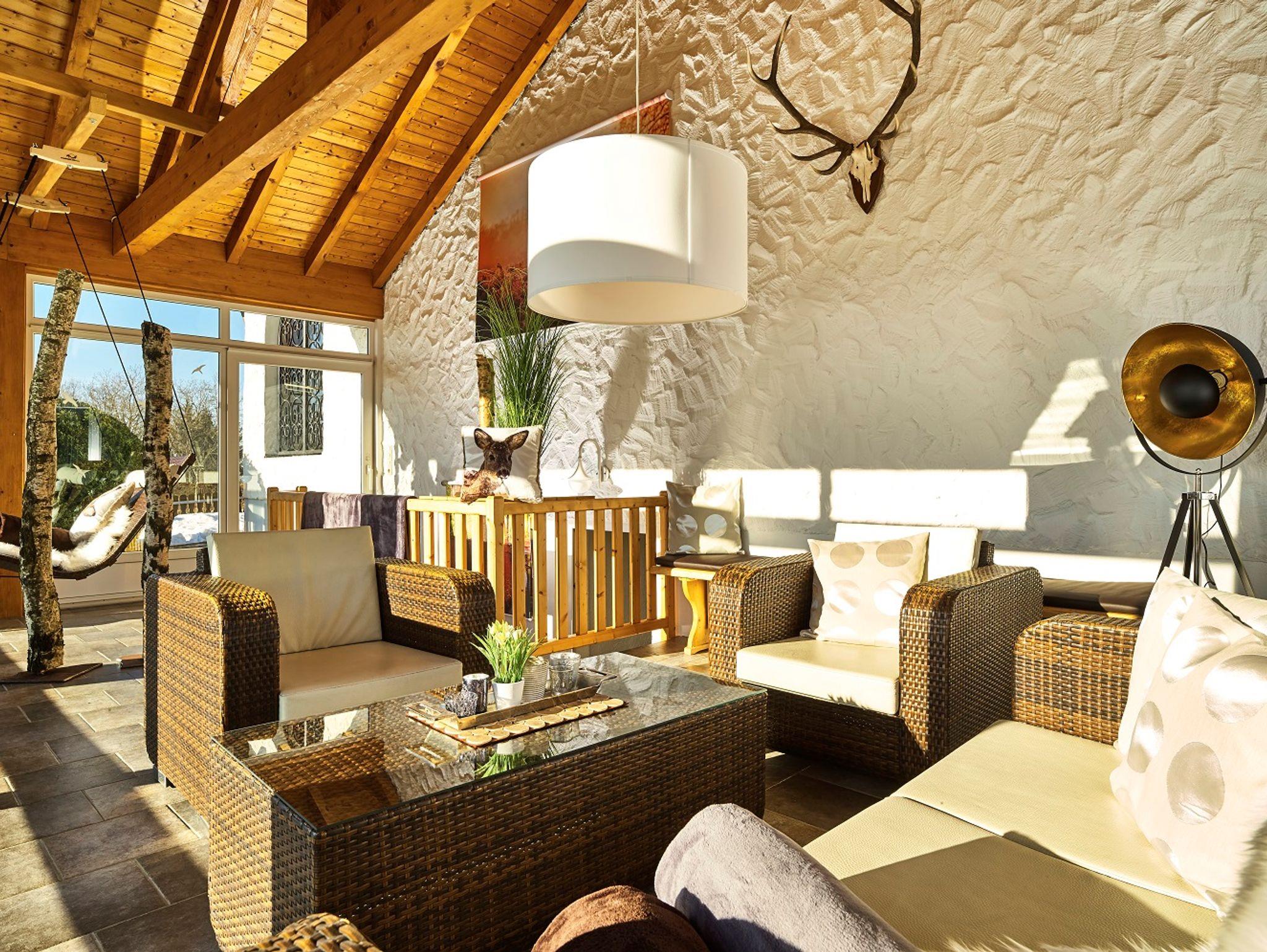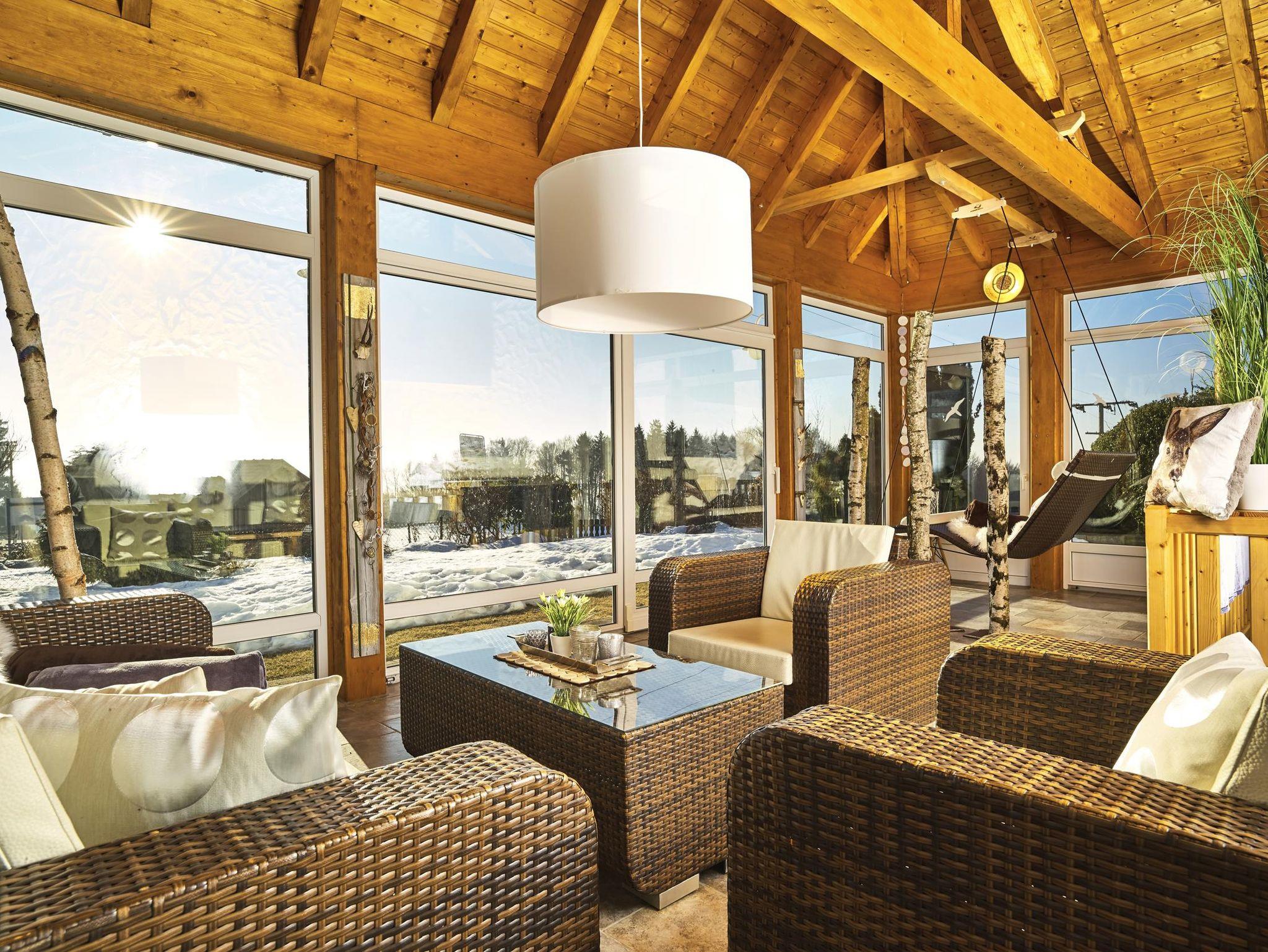 Entspannen Sie nach dem Saunabesuch im Wintergarten oder am Panoramafenster mit Lesebank im Wohnzimmer!