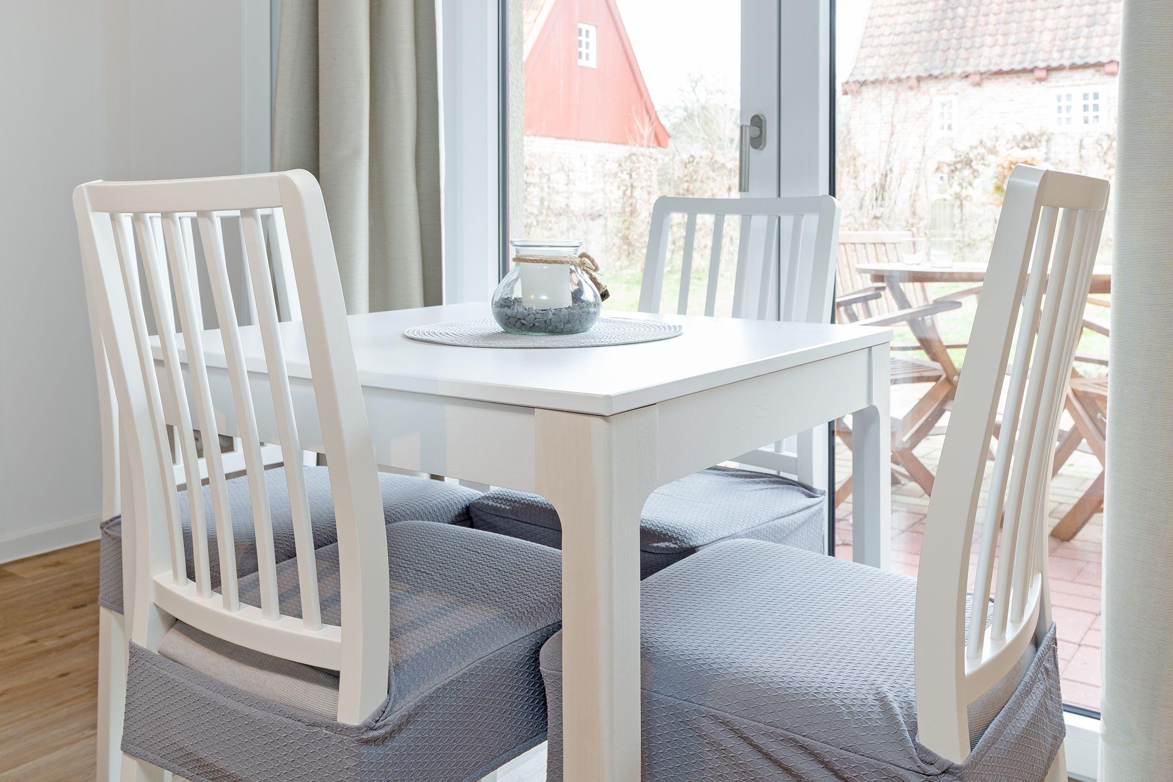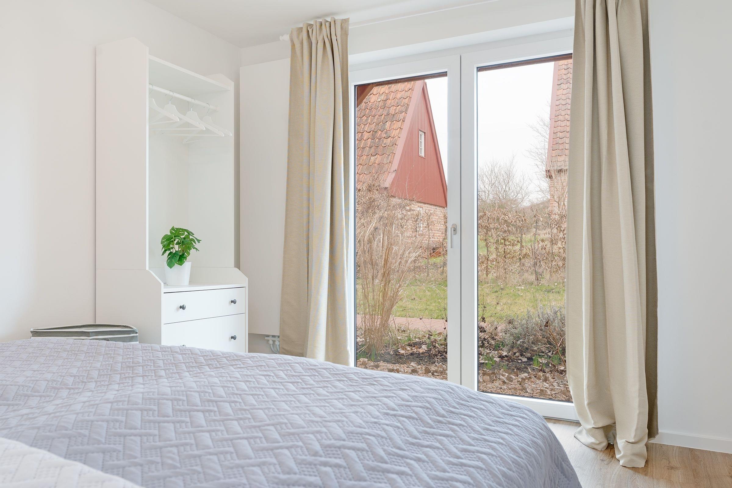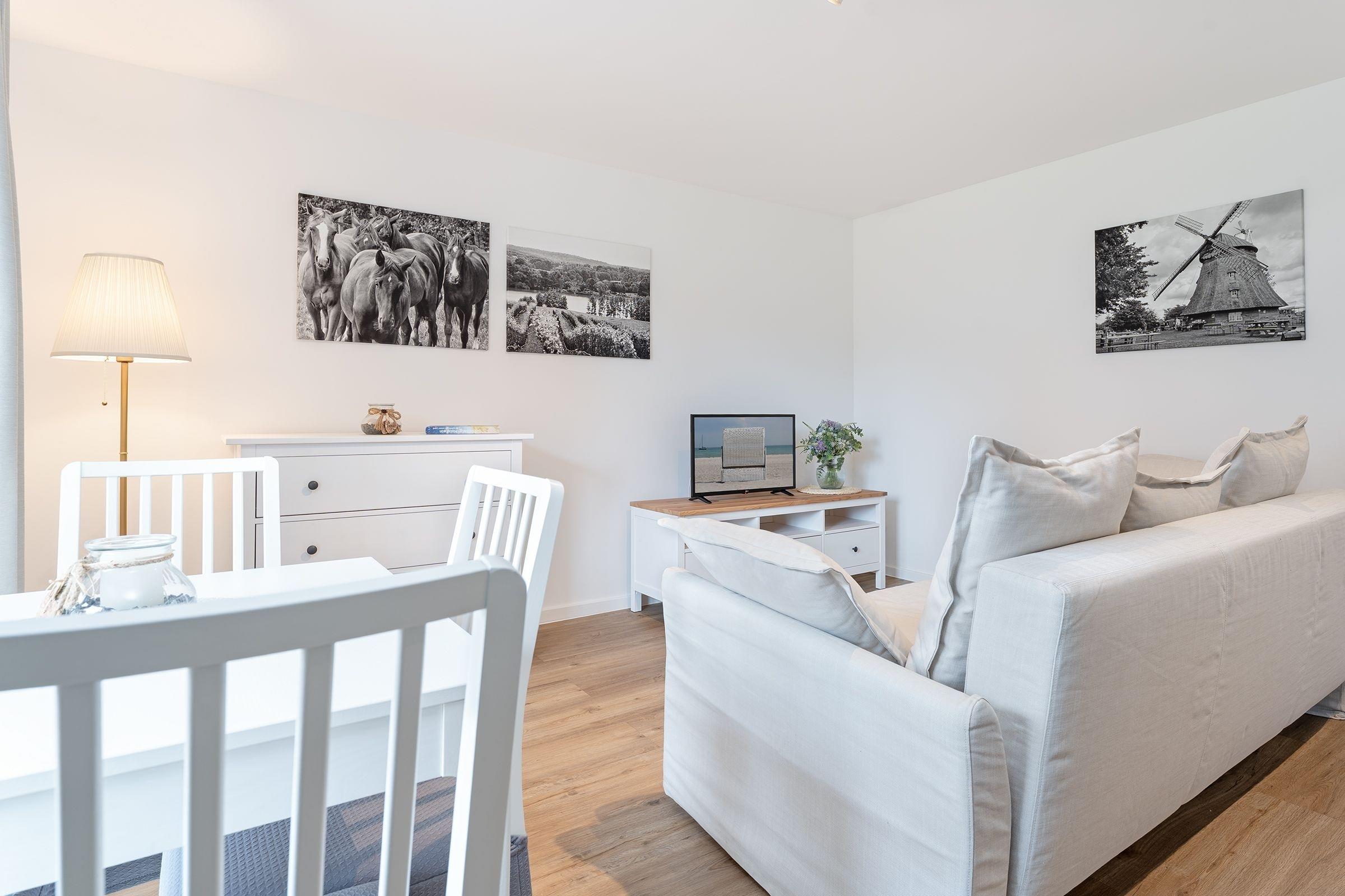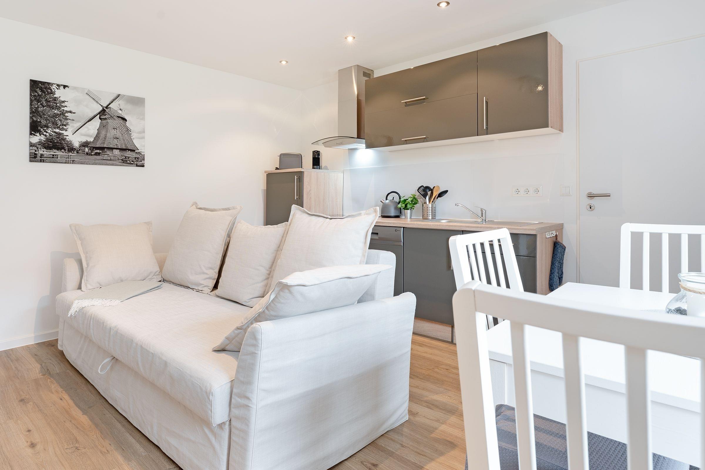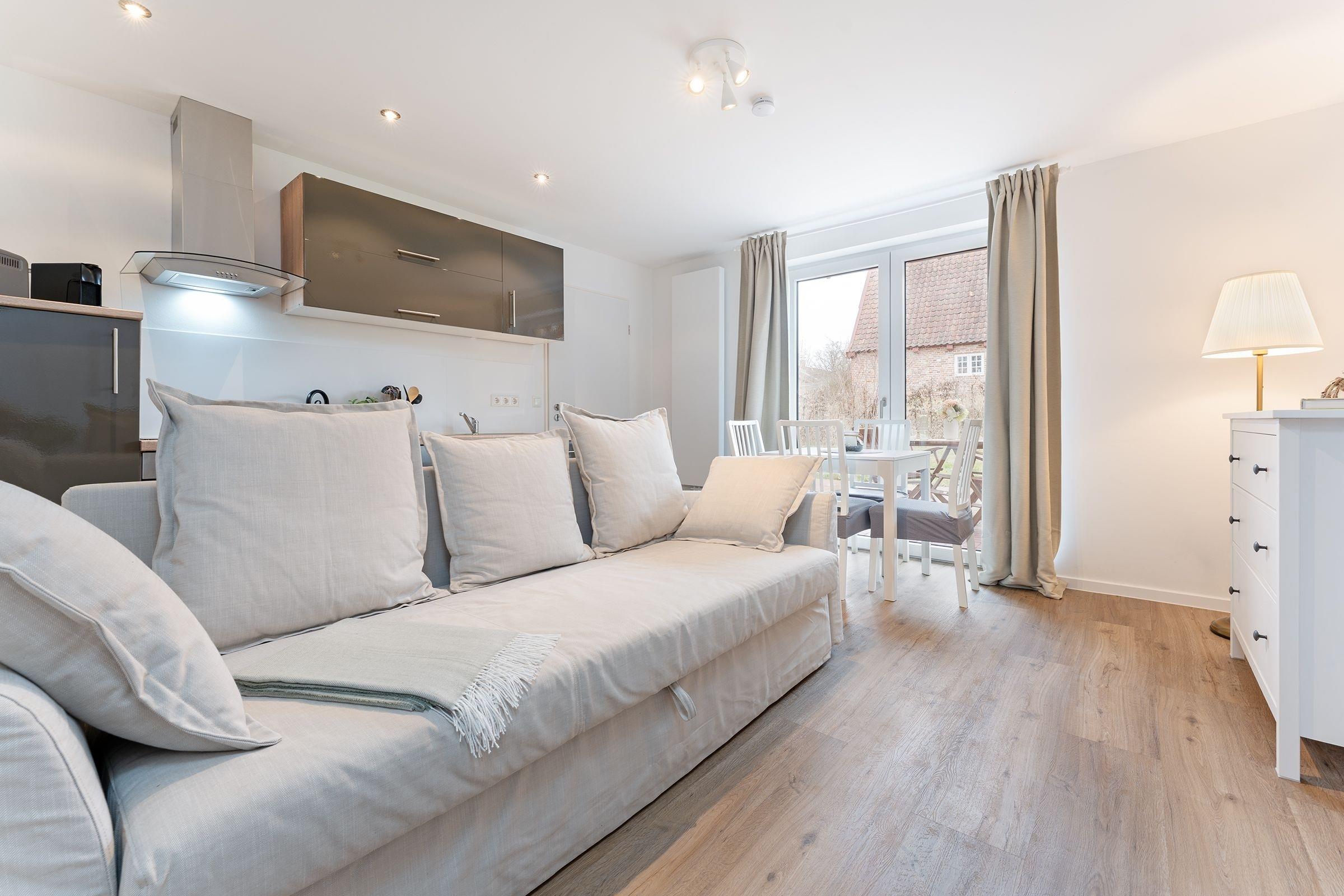 Ihre Ferienwohnung bietet einen traumhaften Ausblick auf die umliegende Natur, den Sie durch große Fensterfronten genießen können. Von hier aus gelangen Sie auf die großzügige, überdachte Terrasse mit vorgelagertem Gemeinschaftsgarten, die sich perfekt für entspannte Stunden an der frischen Luft eignet. Machen Sie es sich auf den komfortablen Gartenmöbeln gemütlich. In der offen zum Wohnzimmer gestalteten Küche können Sie kulinarische Highlights zaubern und diese gemeinsam am Esstisch genießen. Das separate Schlafzimmer verfügt über ein komfortables Boxspring-Doppelbett (160x200 cm) sowie genügend Stauraum für Ihre Urlaubsgarderobe. Eine zusätzliche Schlafmöglichkeit für zwei Personen befindet sich im Wohnbereich. Hier können Sie das gemütlich Sofa für die Nacht leicht in einen weiteren Schlafbereich (2x80x200 cm) verwandeln. Das moderne Duschbad verfügt zusätzlich über eine Waschmaschine, die für eine stets saubere Urlaubsgarderobe sorgt.