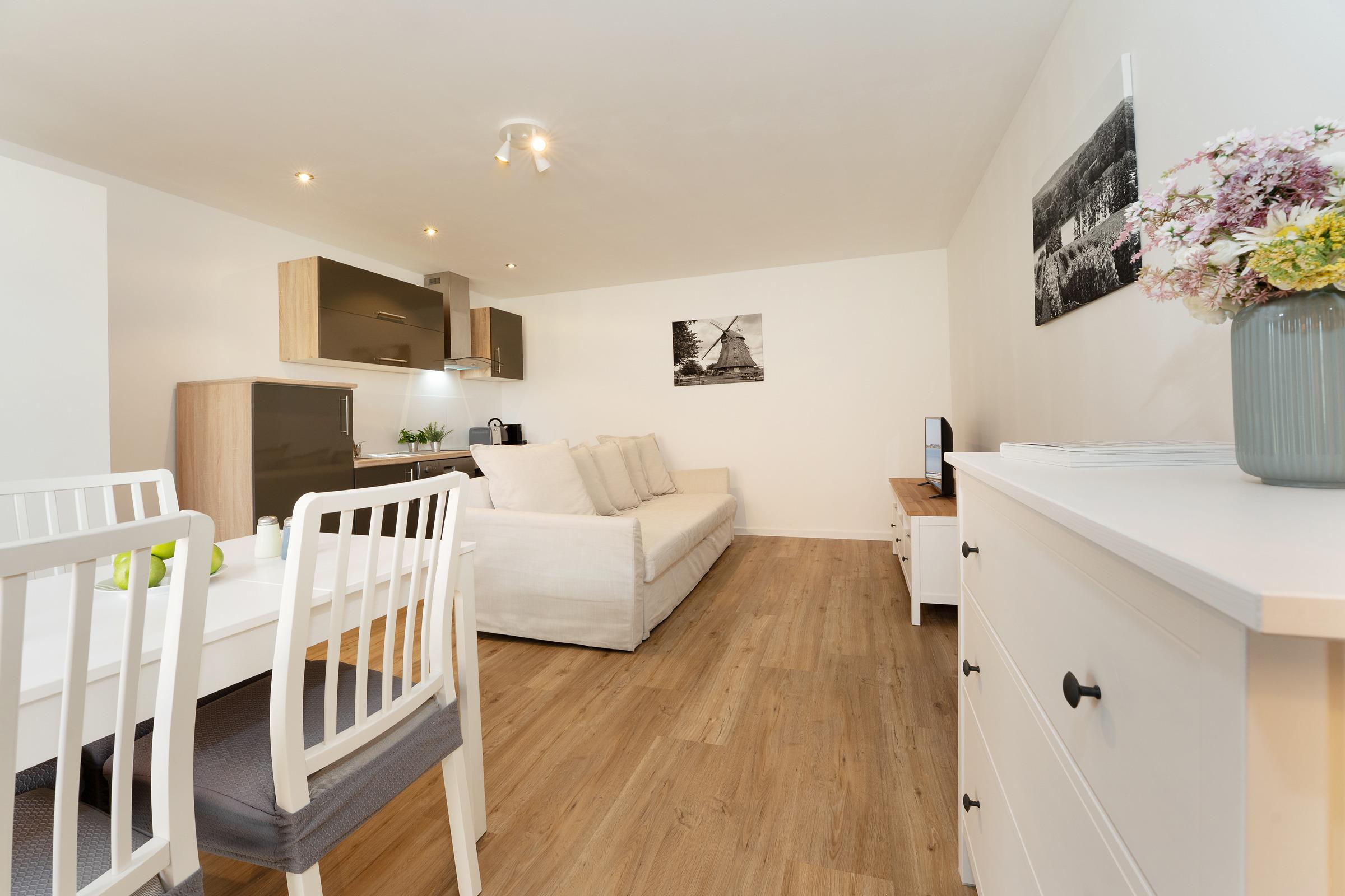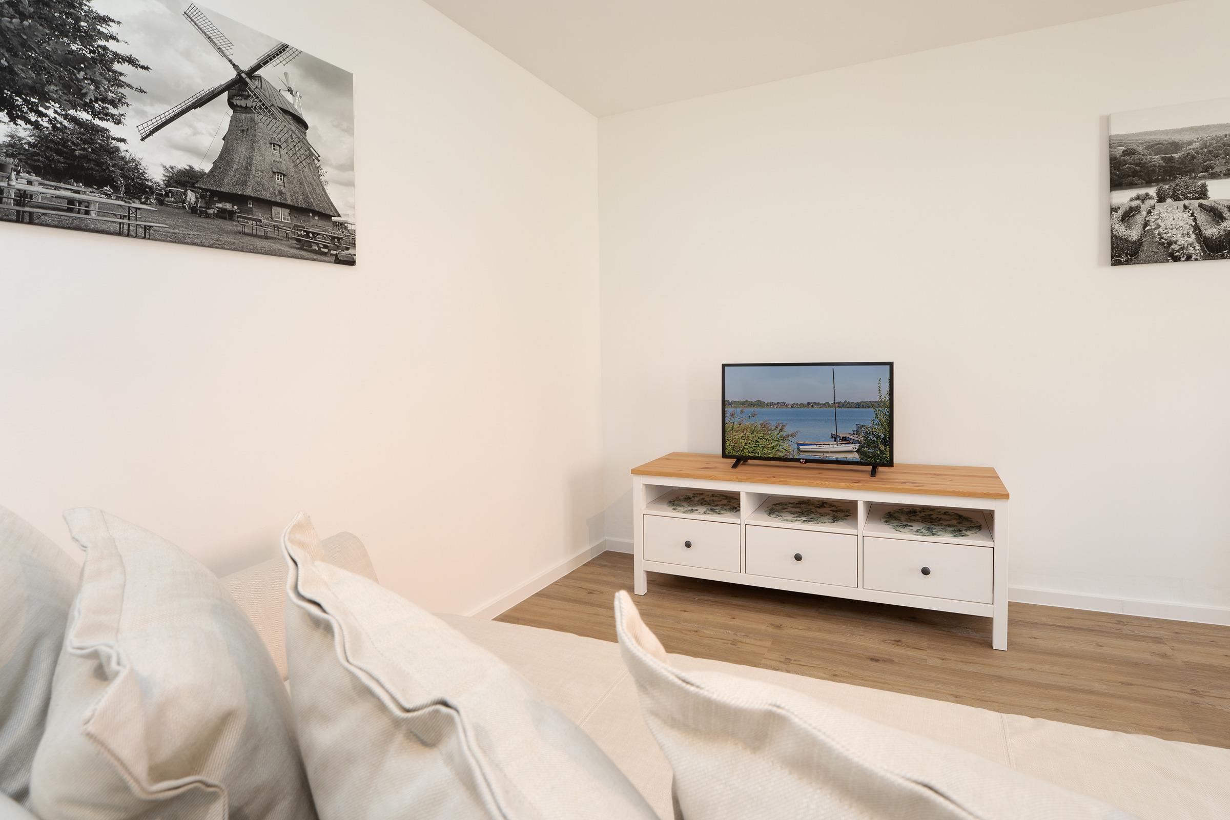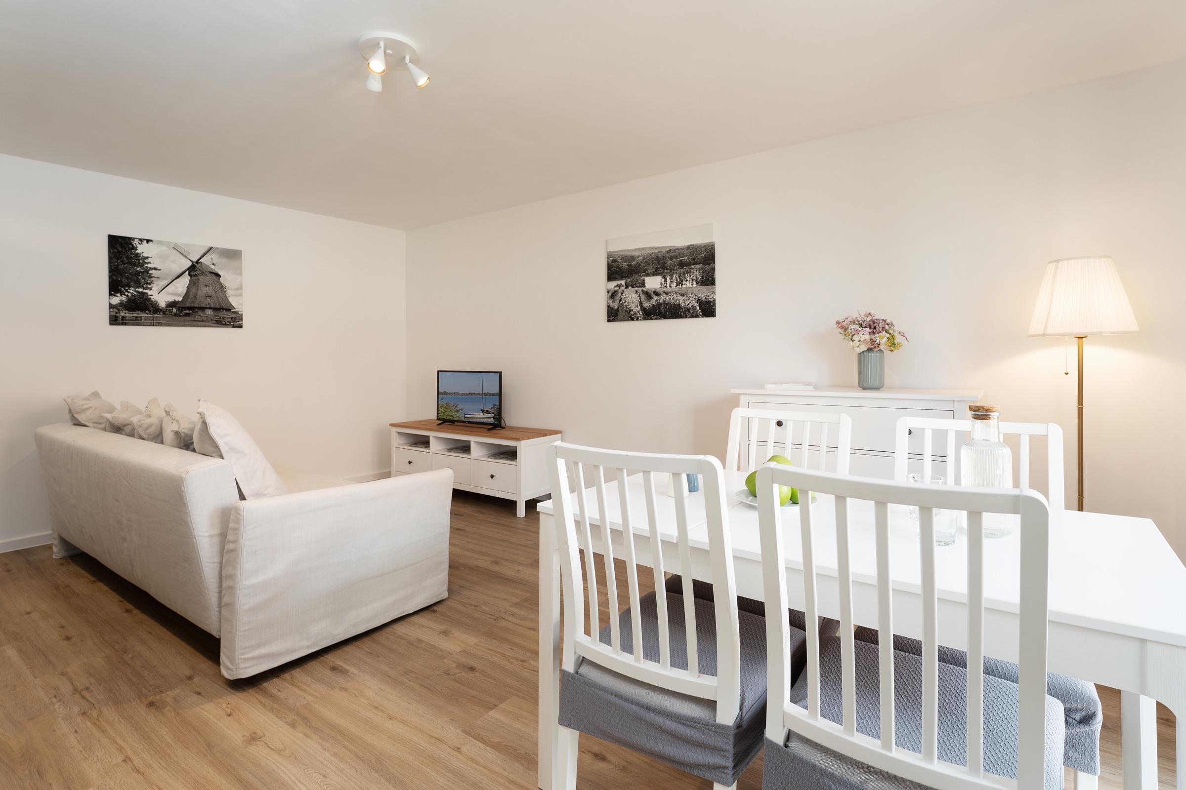 Willkommen in dieser stilvoll eingerichteten Ferienwohnung, die durch ihre harmonische Ausstattung und ihre idyllische Lage in einem Dorf besticht. Der offene Wohnbereich bietet ein einladendes Sofa und moderne Unterhaltungsmöglichkeiten wie einem Flachbild-TV.