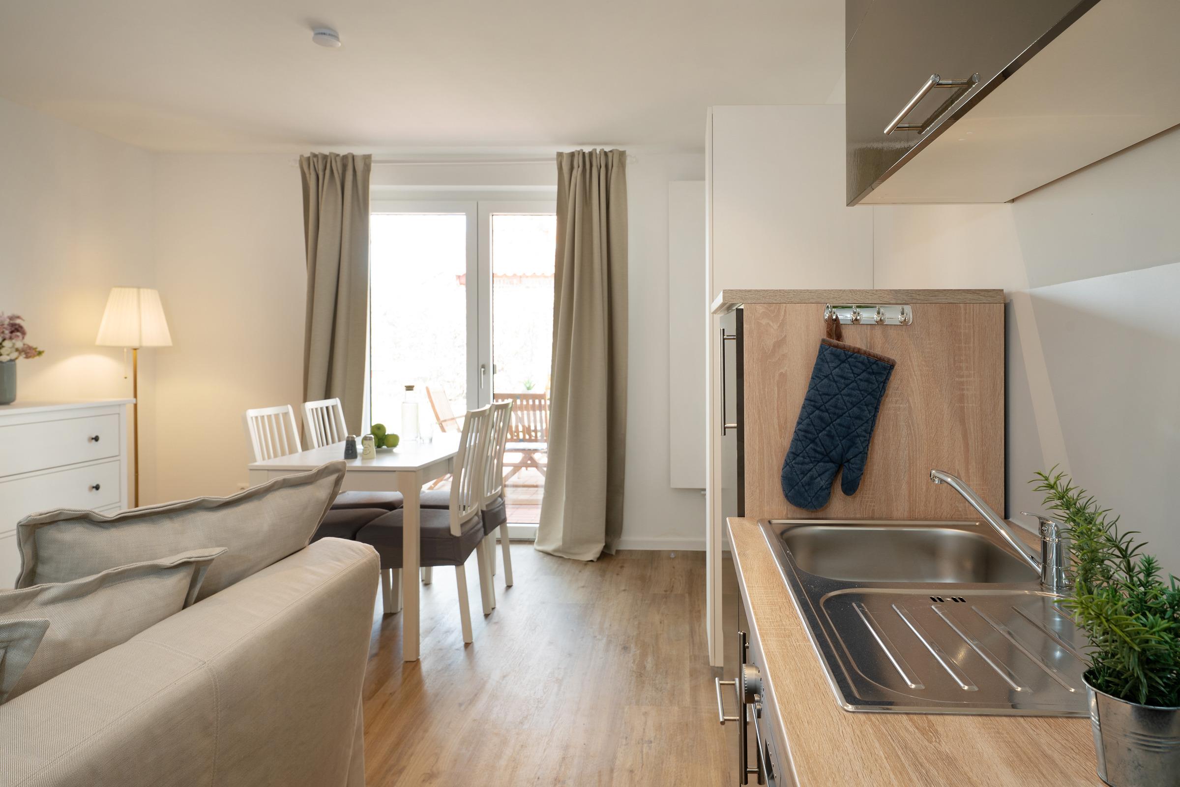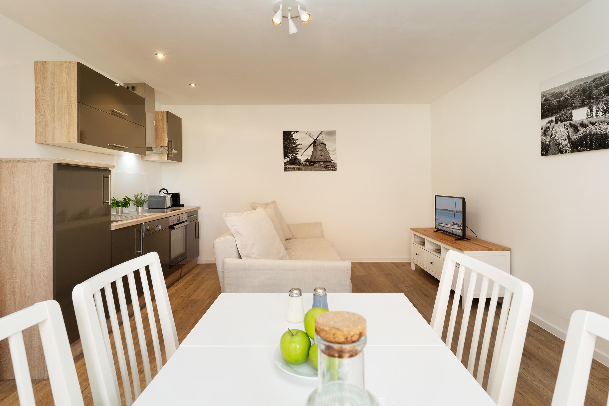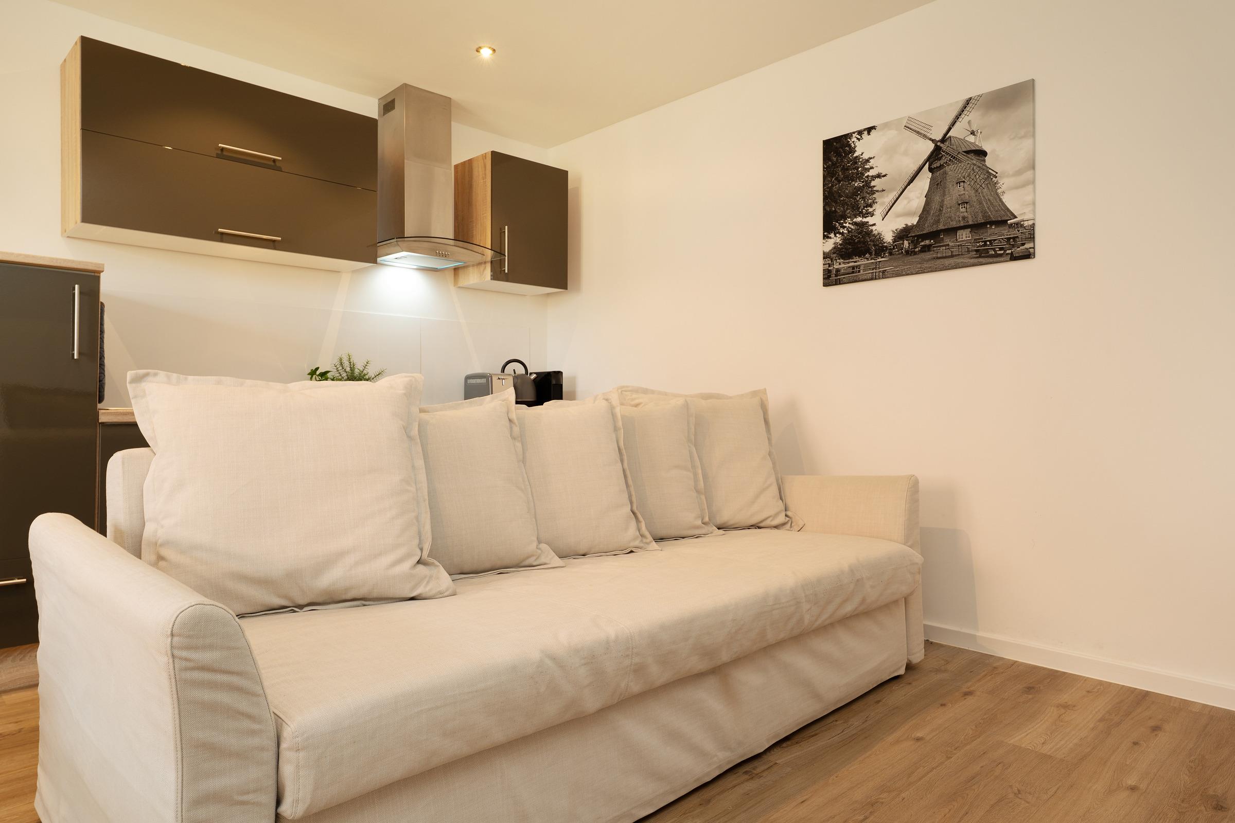Willkommen in dieser stilvoll eingerichteten Ferienwohnung, die durch ihre harmonische Ausstattung und ihre idyllische Lage in einem Dorf besticht. Der offene Wohnbereich bietet ein einladendes Sofa und moderne Unterhaltungsmöglichkeiten wie einem Flachbild-TV.