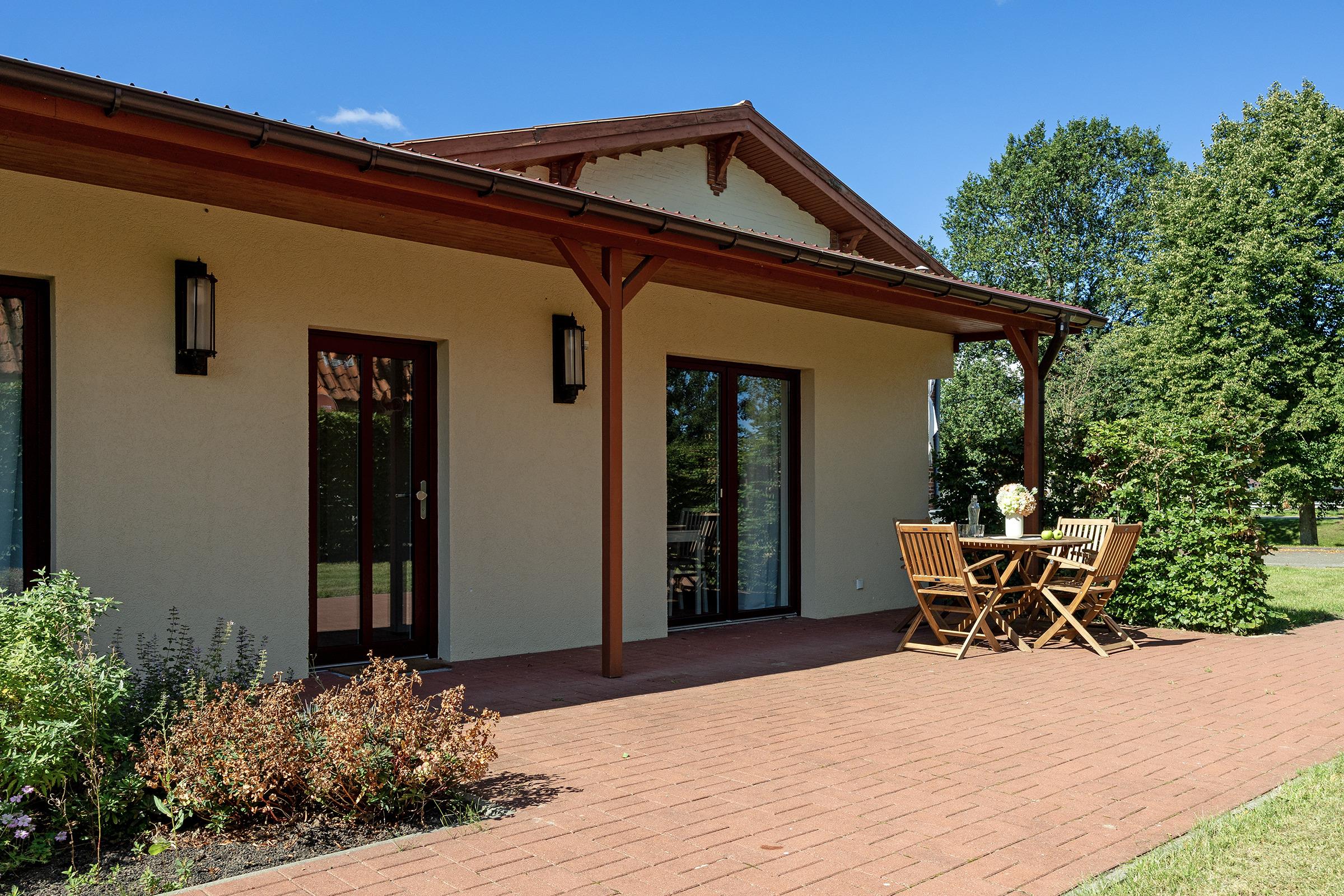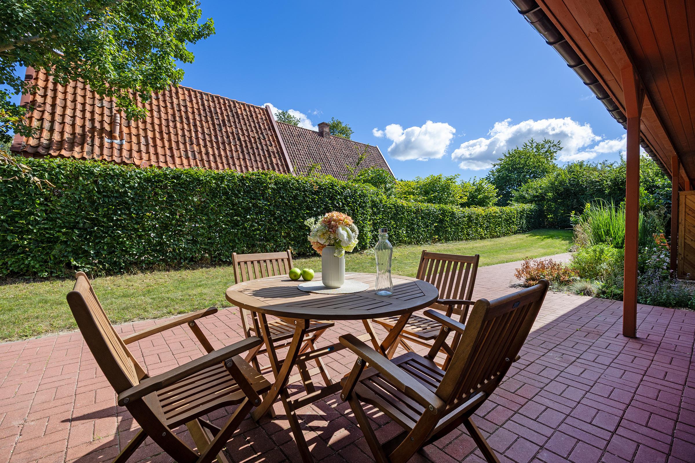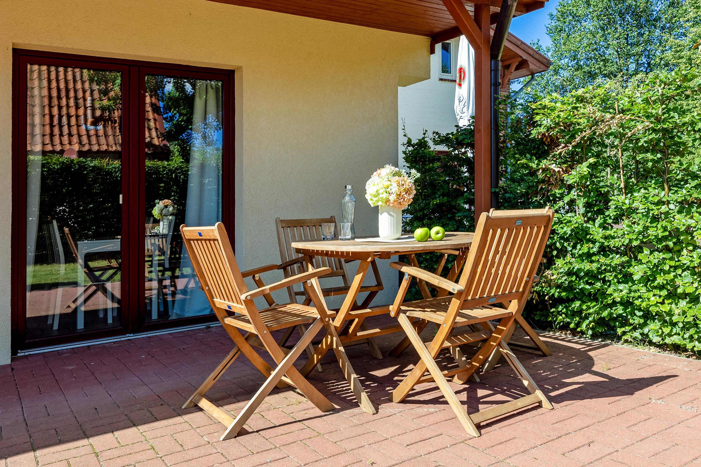 Die angrenzende Terrasse mit Blick ins Grüne ist ideal, um bei schönem Wetter zu entspannen oder ein Frühstück im Freien zu genießen. Gartenmöbel stehen Ihnen selbstverständlich zur Verfügung.
