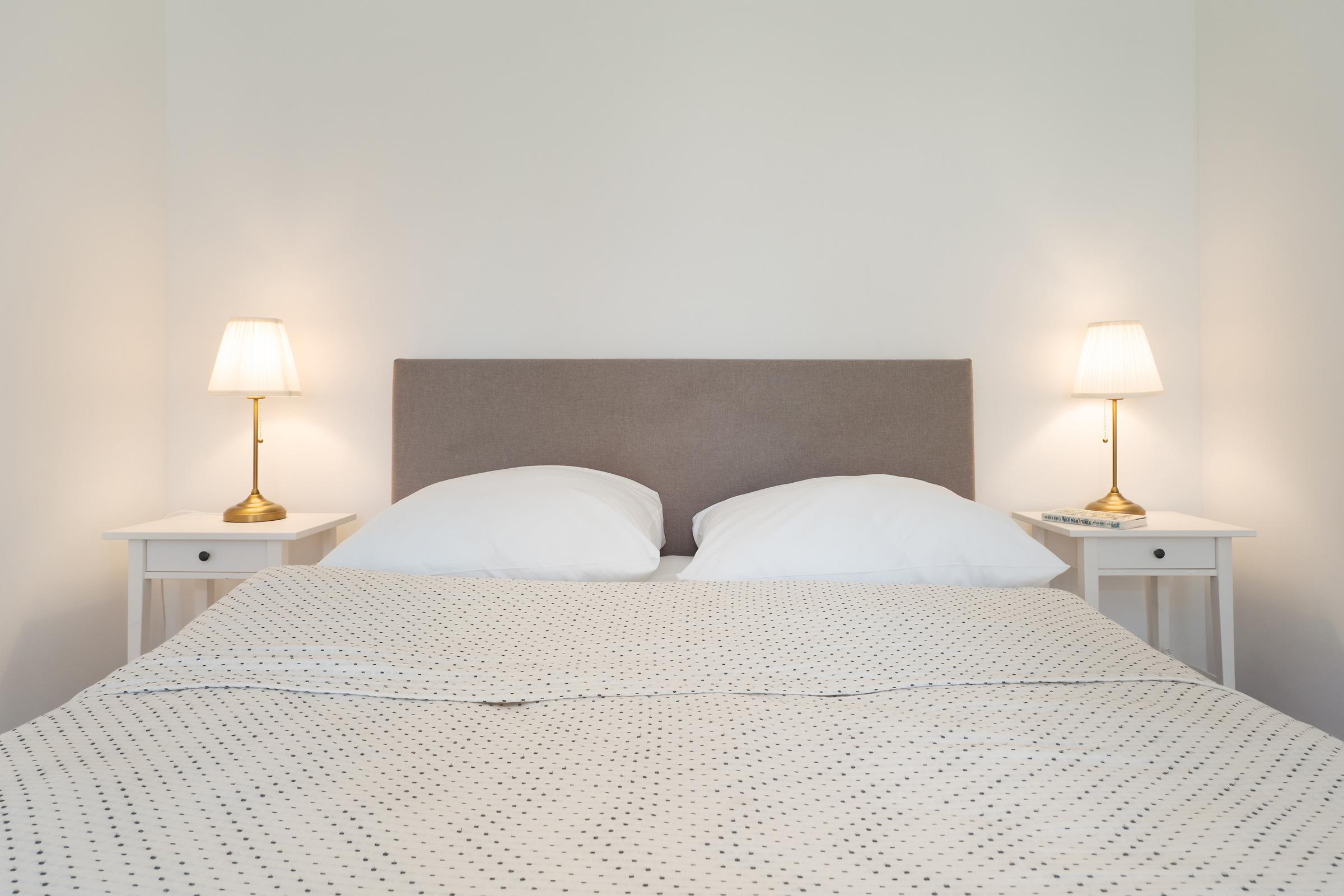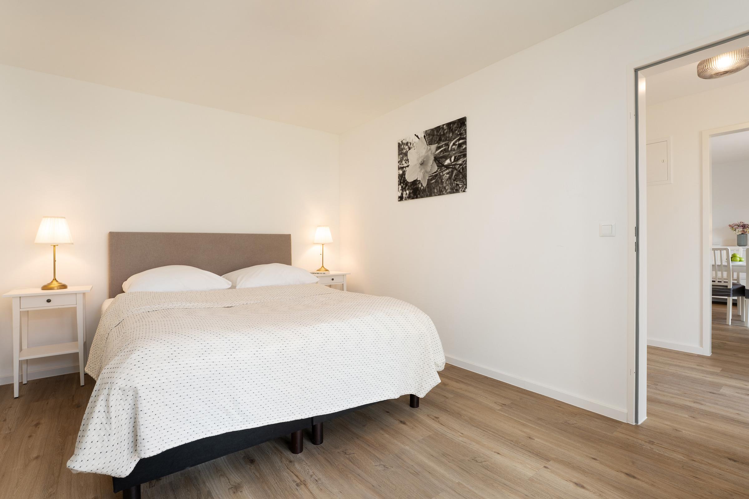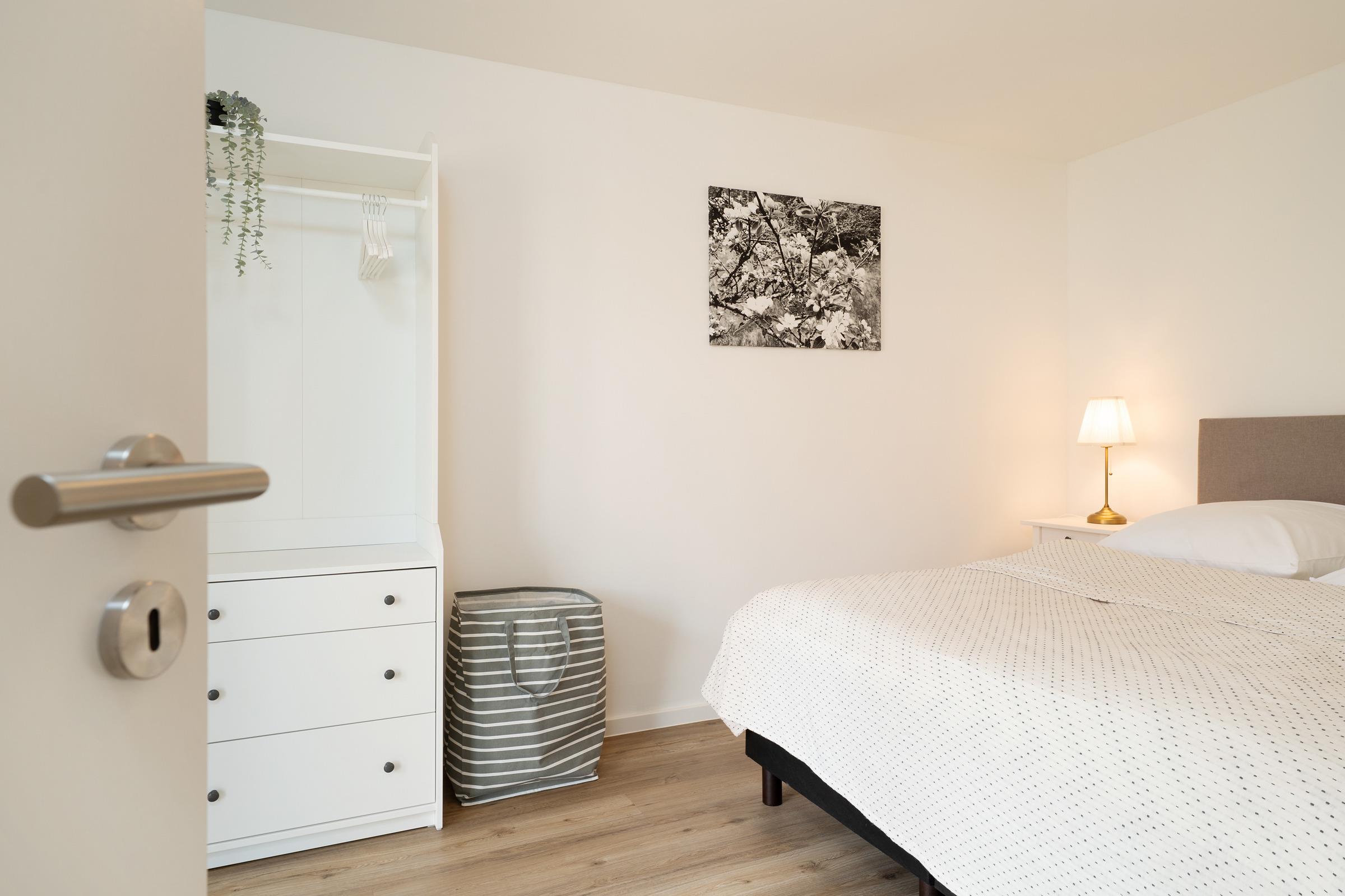 Schlafzimmer: 1 Doppelboxspringbett (160x200 cm), Kleiderschrank, Verdunkelung: Vorhänge, Platz für ein Babybett vorhanden