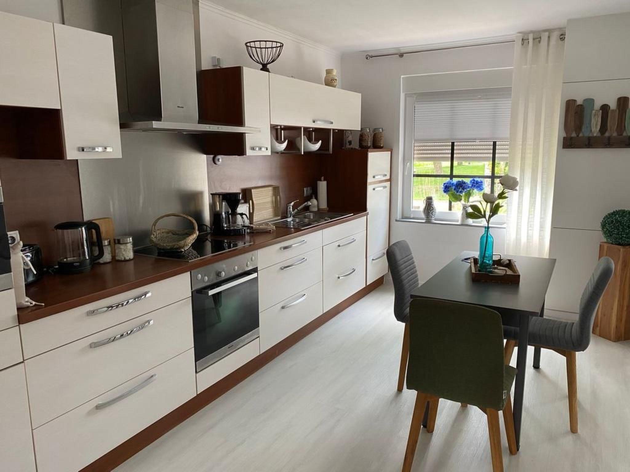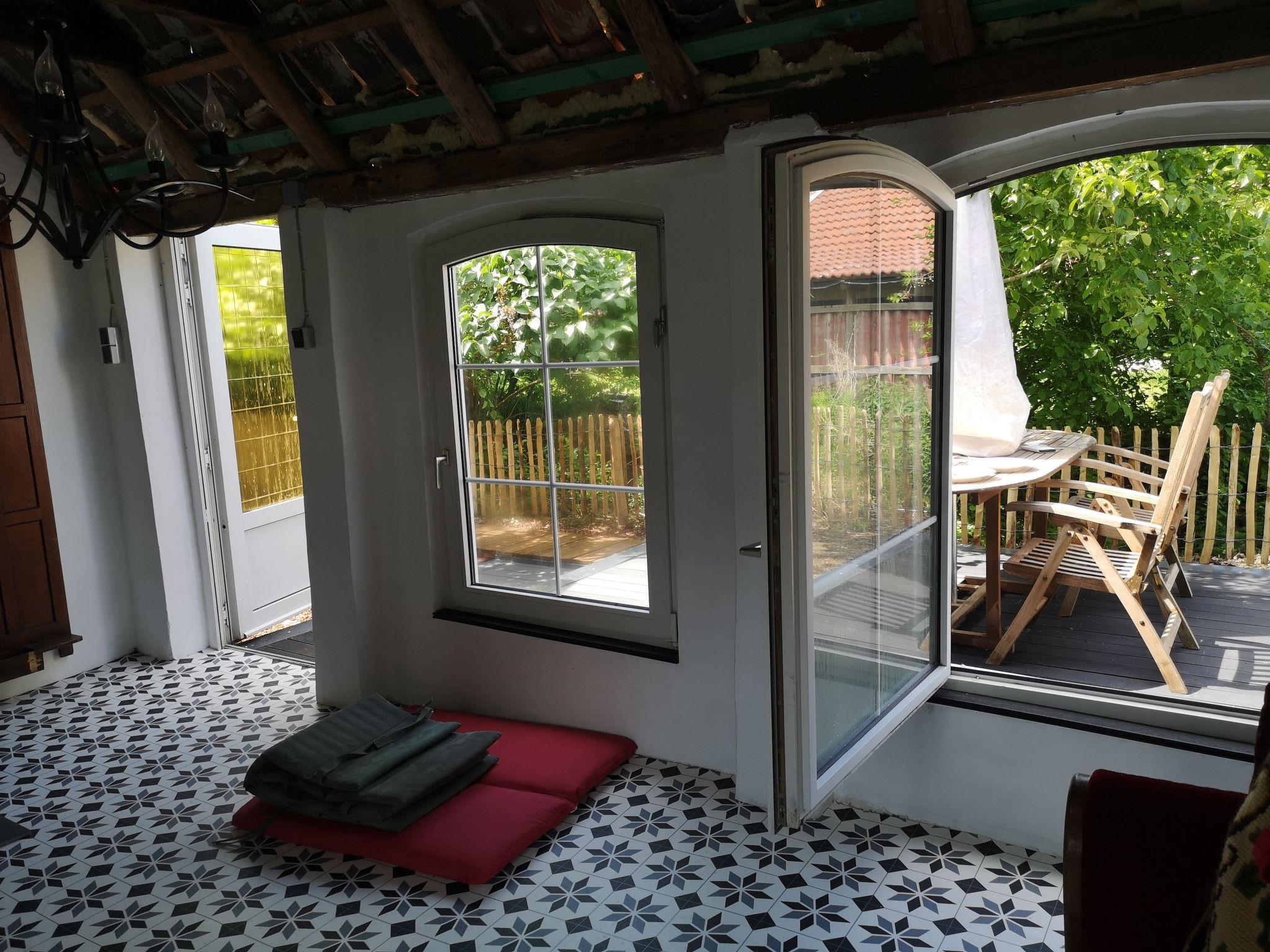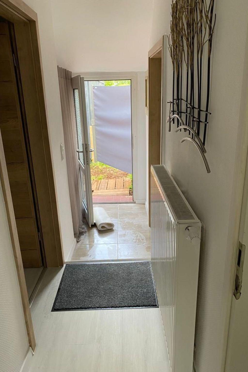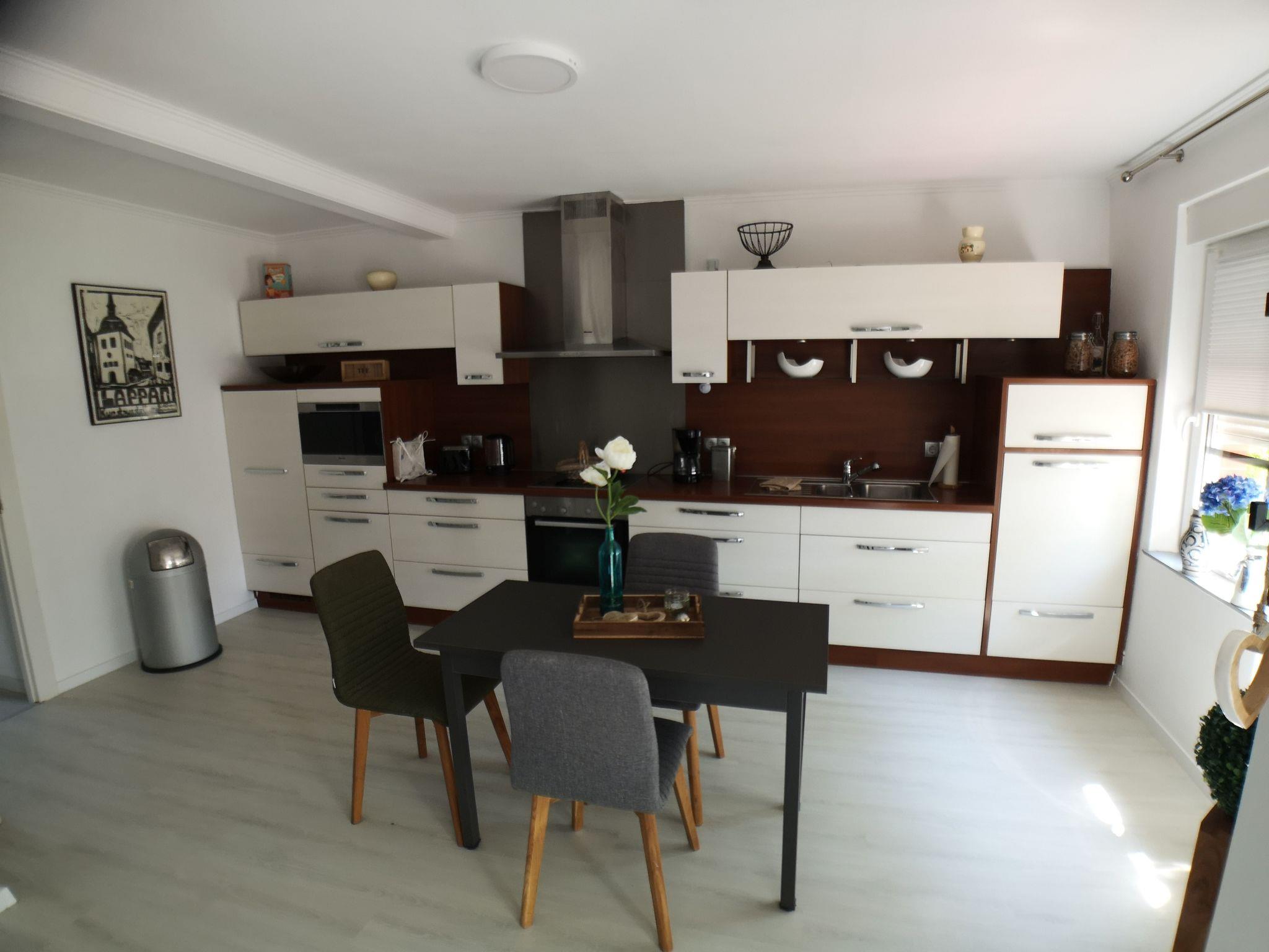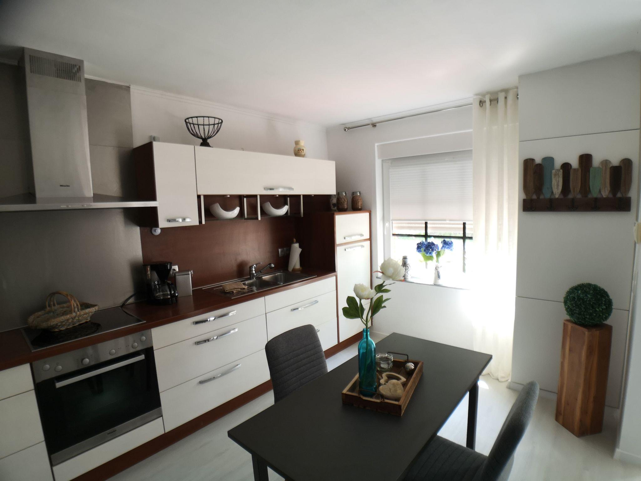 Inside the holiday home, you will find a cosy and well-equipped environment that leaves nothing to be desired. The living room is furnished with a comfortable corner sofa and a Smart TV, while the bedroom has a spacious double bed and an additional TV. The large kitchen with dining area is well equipped with modern Miele appliances - including a dishwasher, steam cooker, fridge and oven - and invites you to cook and linger together. The shower room impresses with a spacious floor-to-ceiling shower with rainforest shower head. A washing machine, electric blinds and insect screens on the windows round off the high-quality interior fittings.