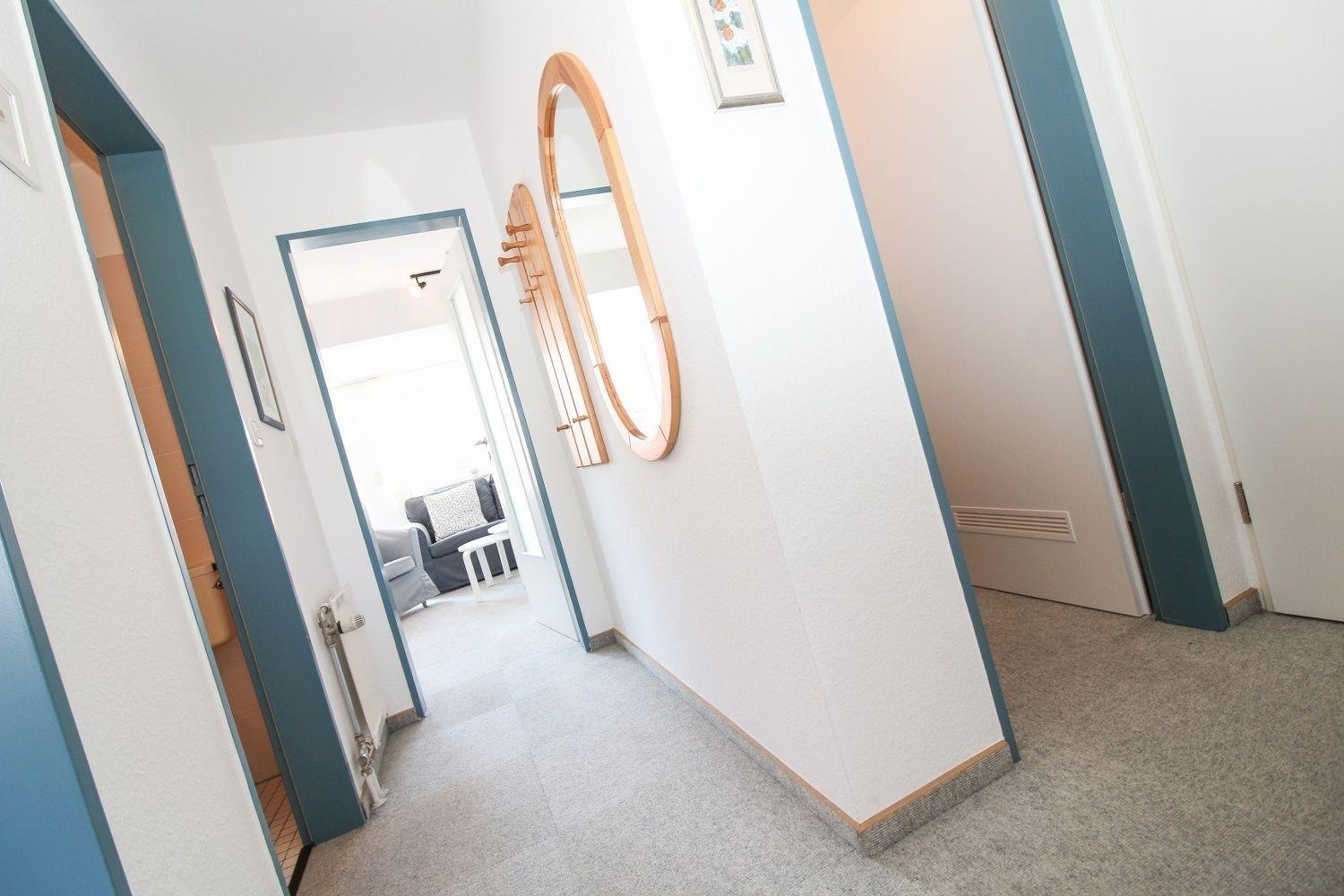 Im Wohn-/Essbereich befindet sich eine gut ausgestattete Küchenzeile. Im Schlafzimmer steht ein Doppelbett. Im zweiten Schlafzimmer sind zwei Einzelbetten vorhanden. Der Abstellraum im Flur bietet Platz für Ihre Koffer o.ä.. Die gesamte Ferienwohnung ist, bis auf das geflieste Badezimmer, mit Teppich ausgelegt.