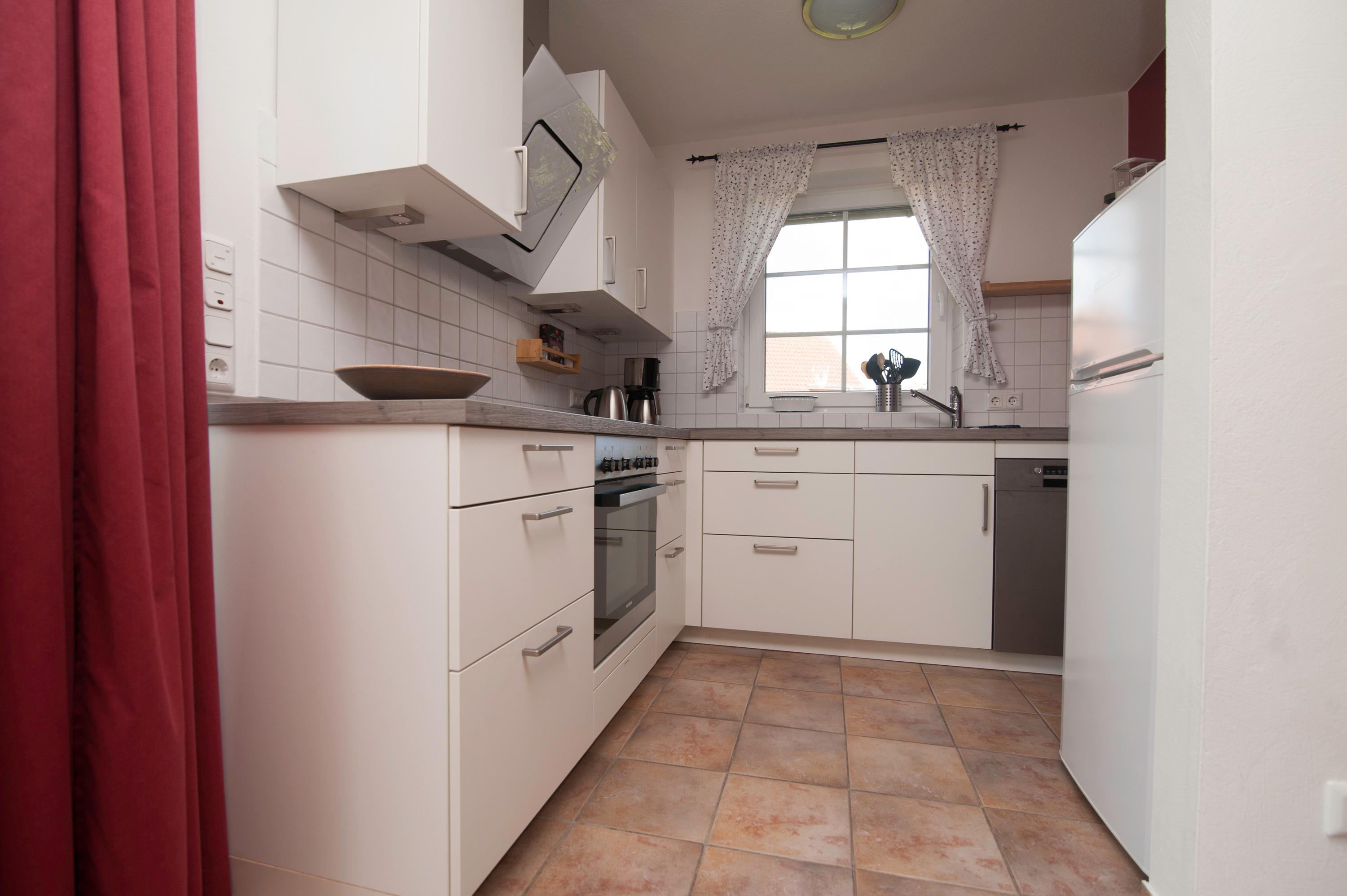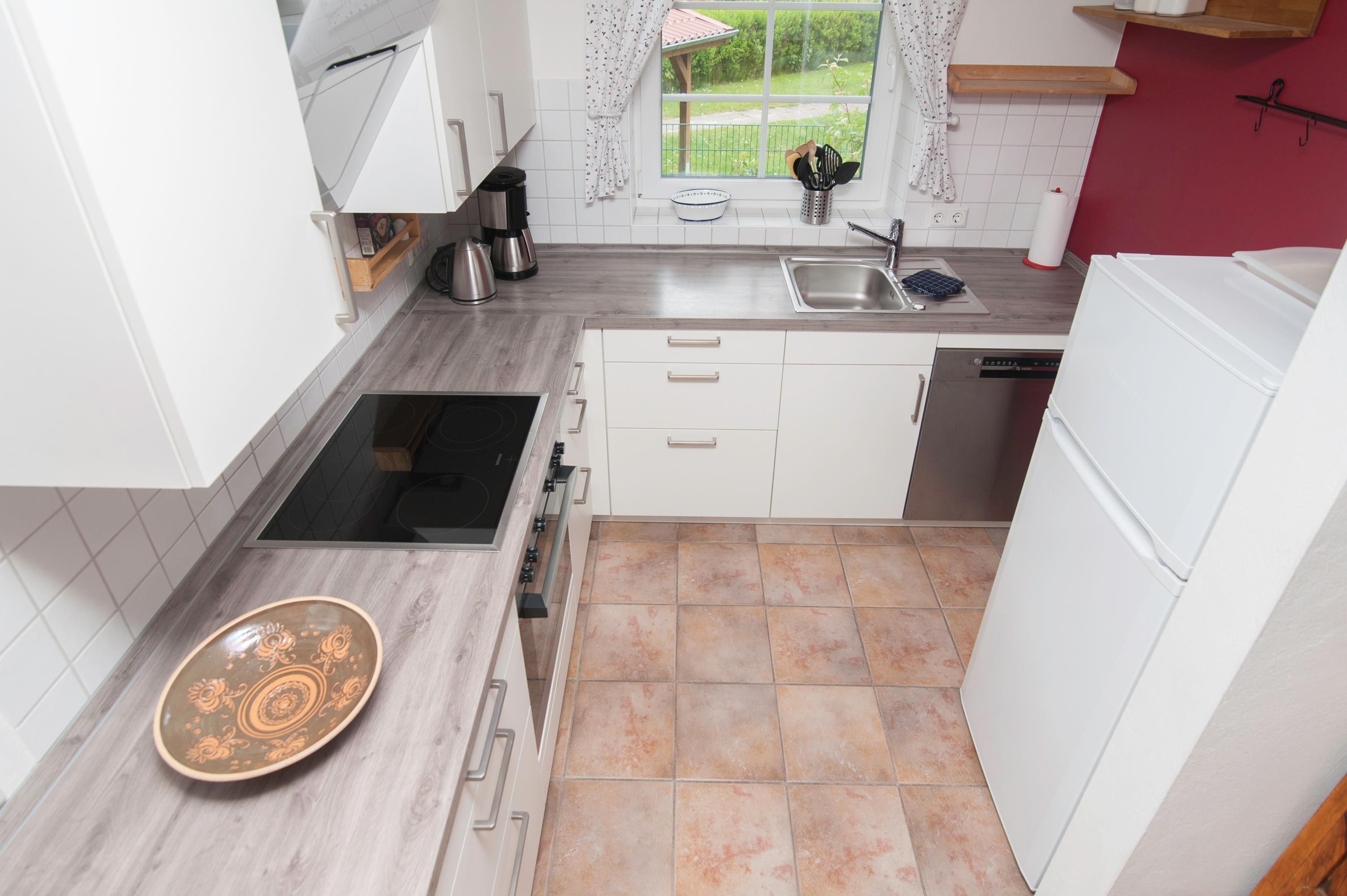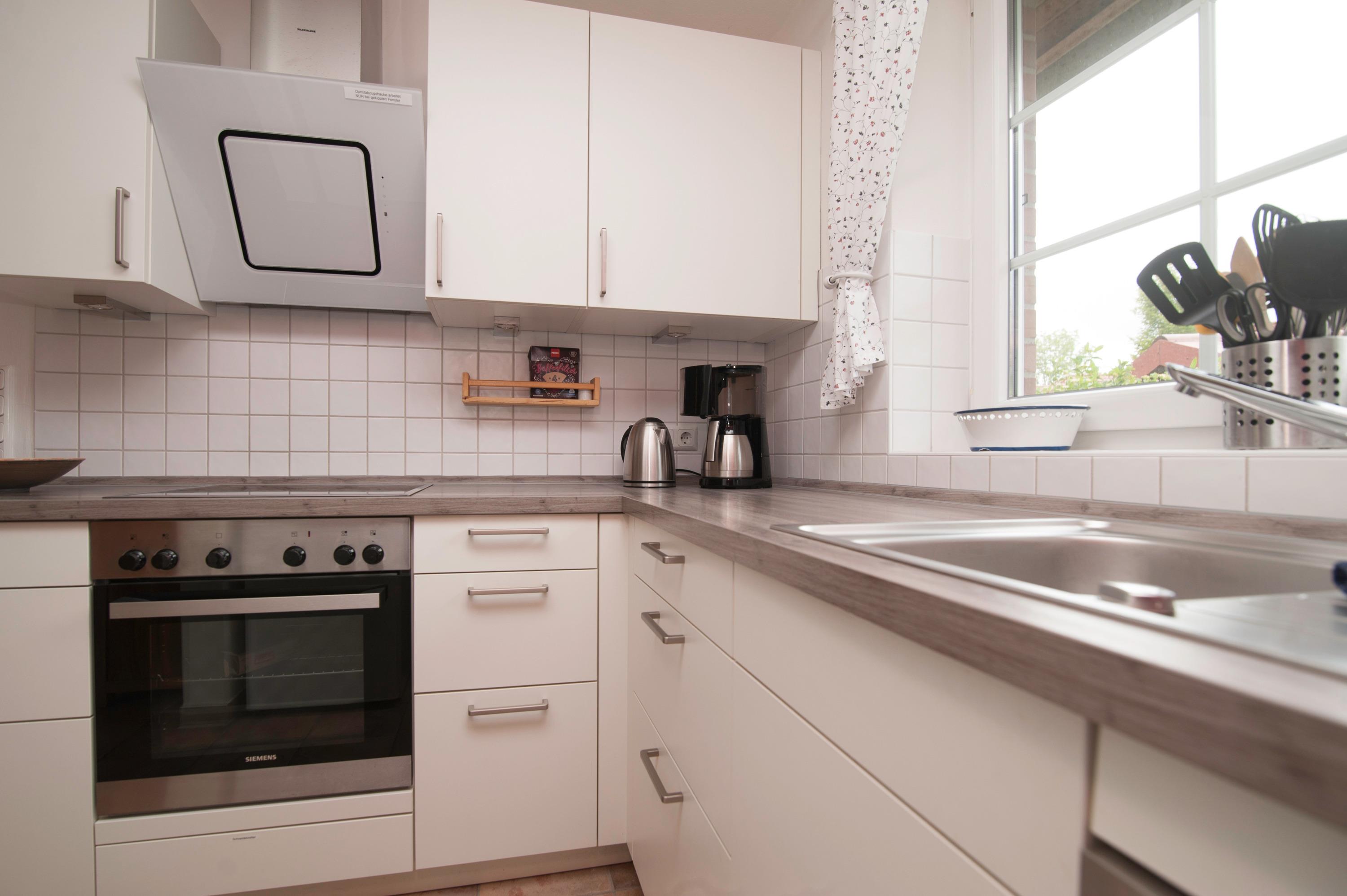 Herd mit Cerankochfeld, Dunstabzugshaube, Geschirrspüler, Kühlschrank mit Gefrierfach, Koch-und Küchengeschirr, Filterkaffeemaschine