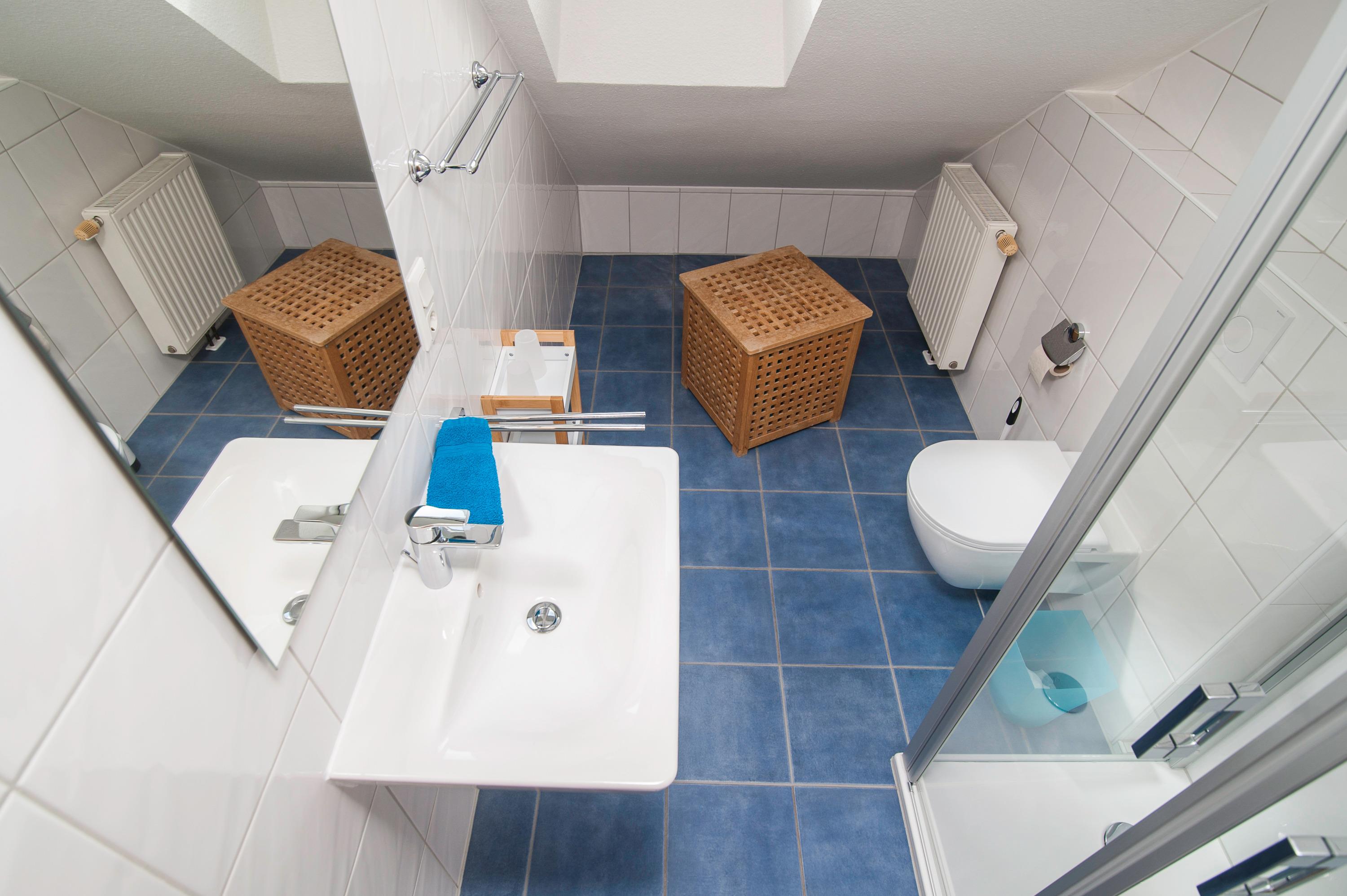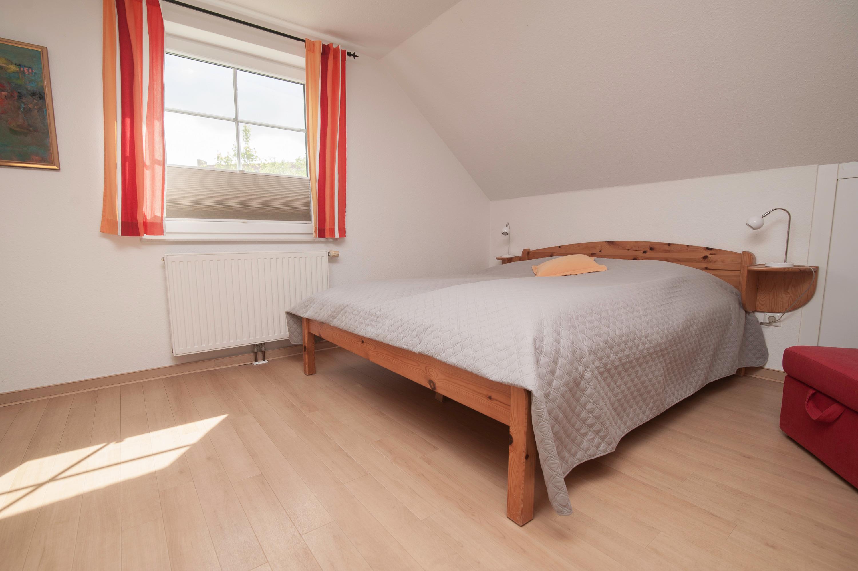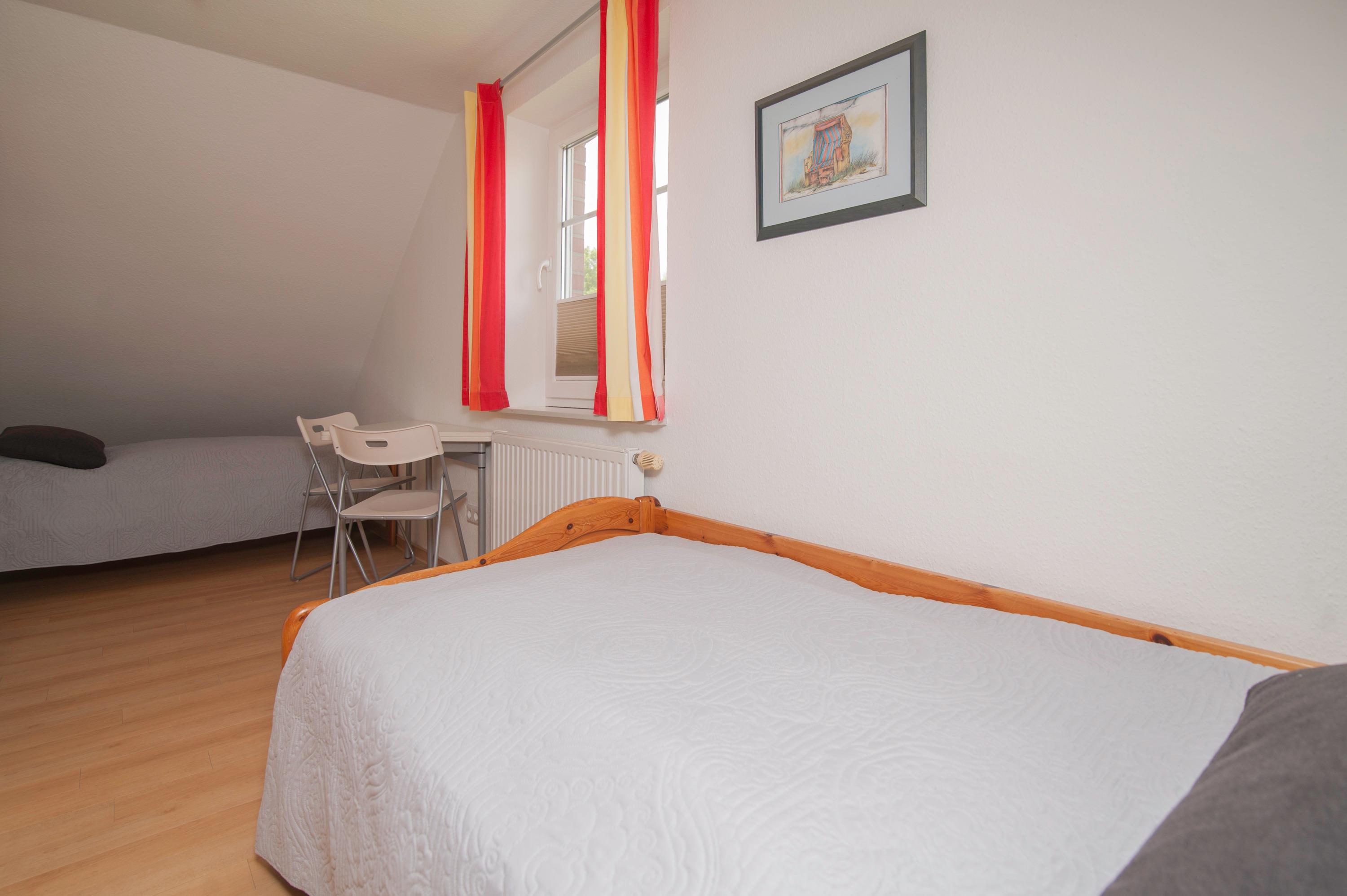 Ein zusätzliches Bad im Obergeschoß mit Dusche, WC, Waschbecken, Ein Schlafzimmer im Obergeschoß (Deichblick), Ein zweites Schlafzimmer im Obergeschoß, beide mit Plissee und Vorhang, mit einem Doppelbett und 2 x 80 x 200cm, mit zwei Einzelbetten 90 x 200cm