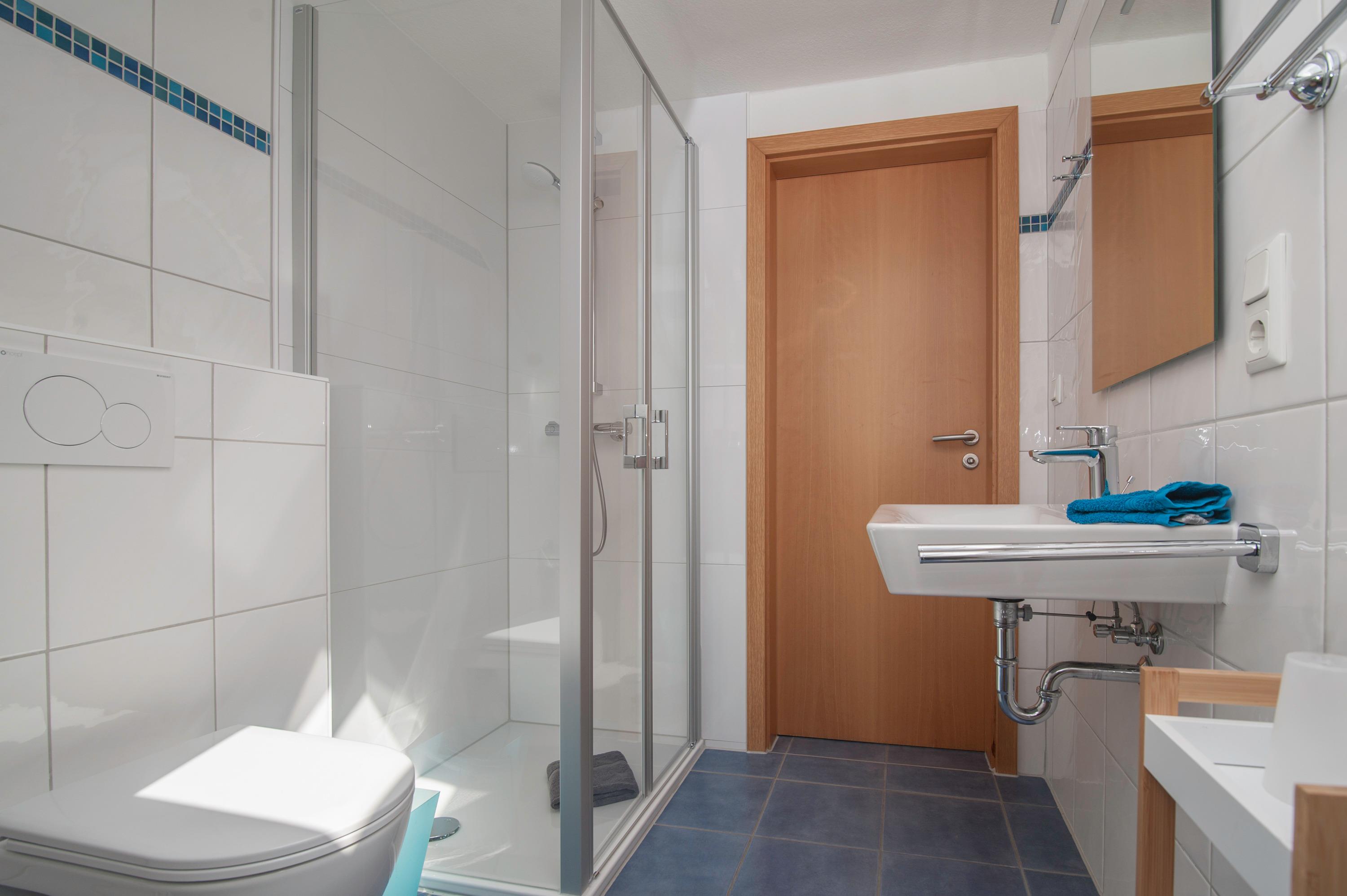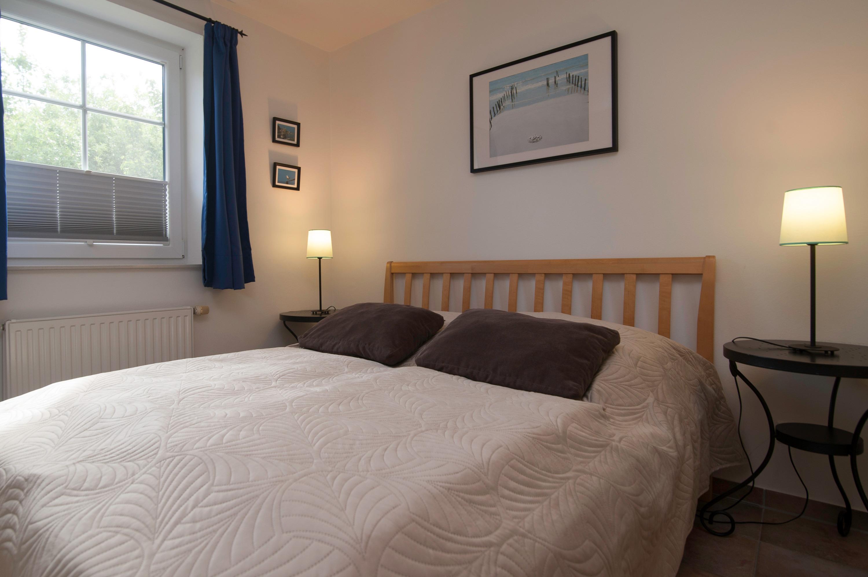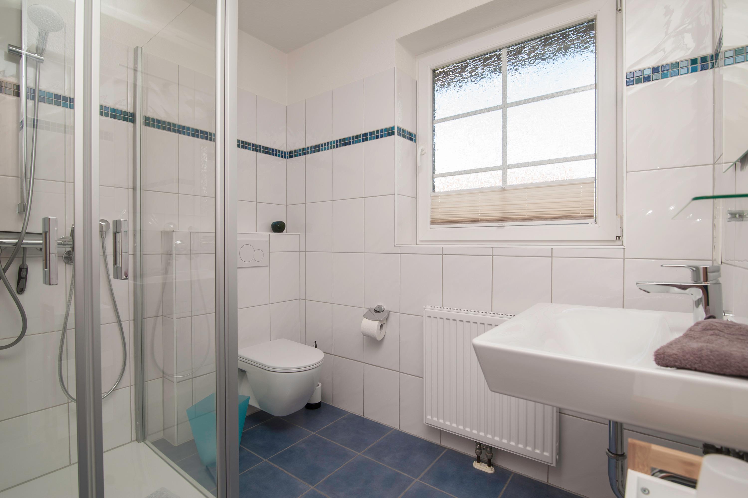 Ein zusätzliches Bad im Obergeschoß mit Dusche, WC, Waschbecken, Ein Schlafzimmer im Obergeschoß (Deichblick), Ein zweites Schlafzimmer im Obergeschoß, beide mit Plissee und Vorhang, mit einem Doppelbett und 2 x 80 x 200cm, mit zwei Einzelbetten 90 x 200cm