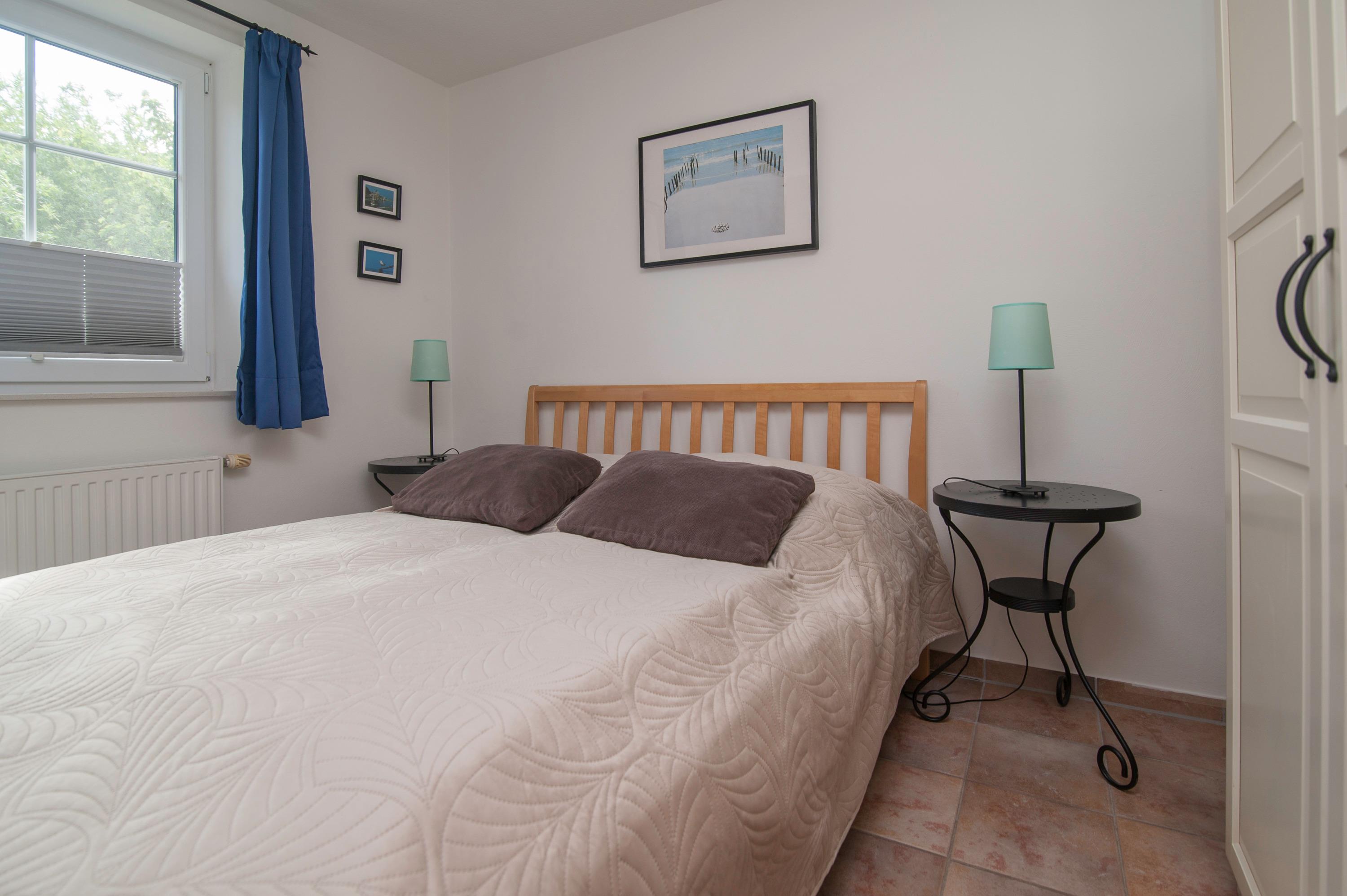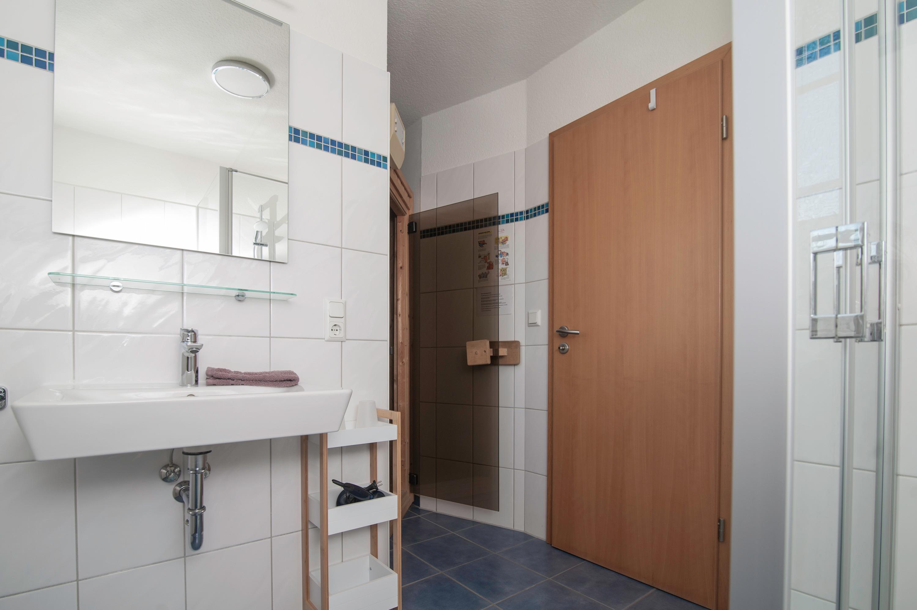 Schlafzimmer im Erdgeschoß mit einem Doppelbett und 2 x 80 x 200cm, Verdunkelung durch Plissee und Vorhang, Bad im Erdgeschoß mit Dusche, WC, Sauna, Waschbecken.