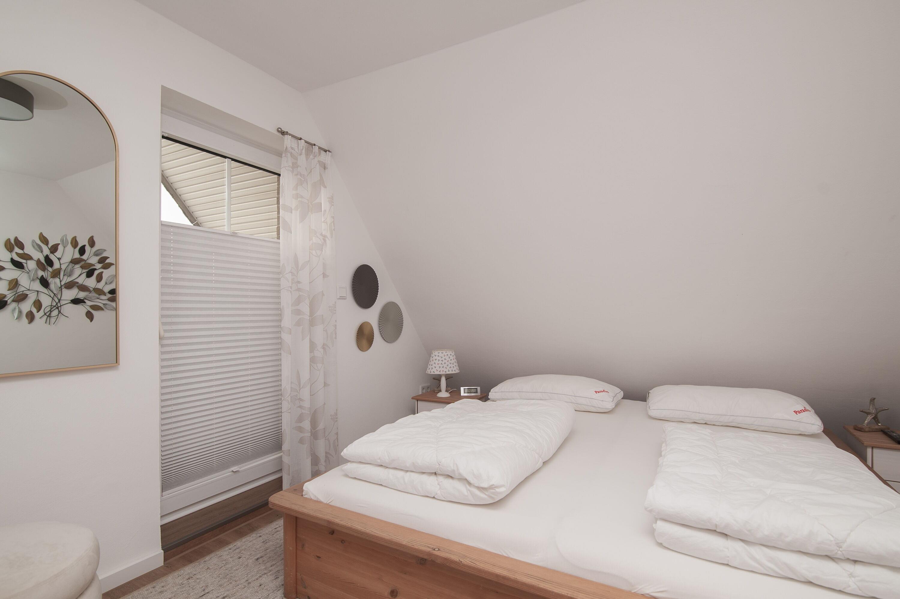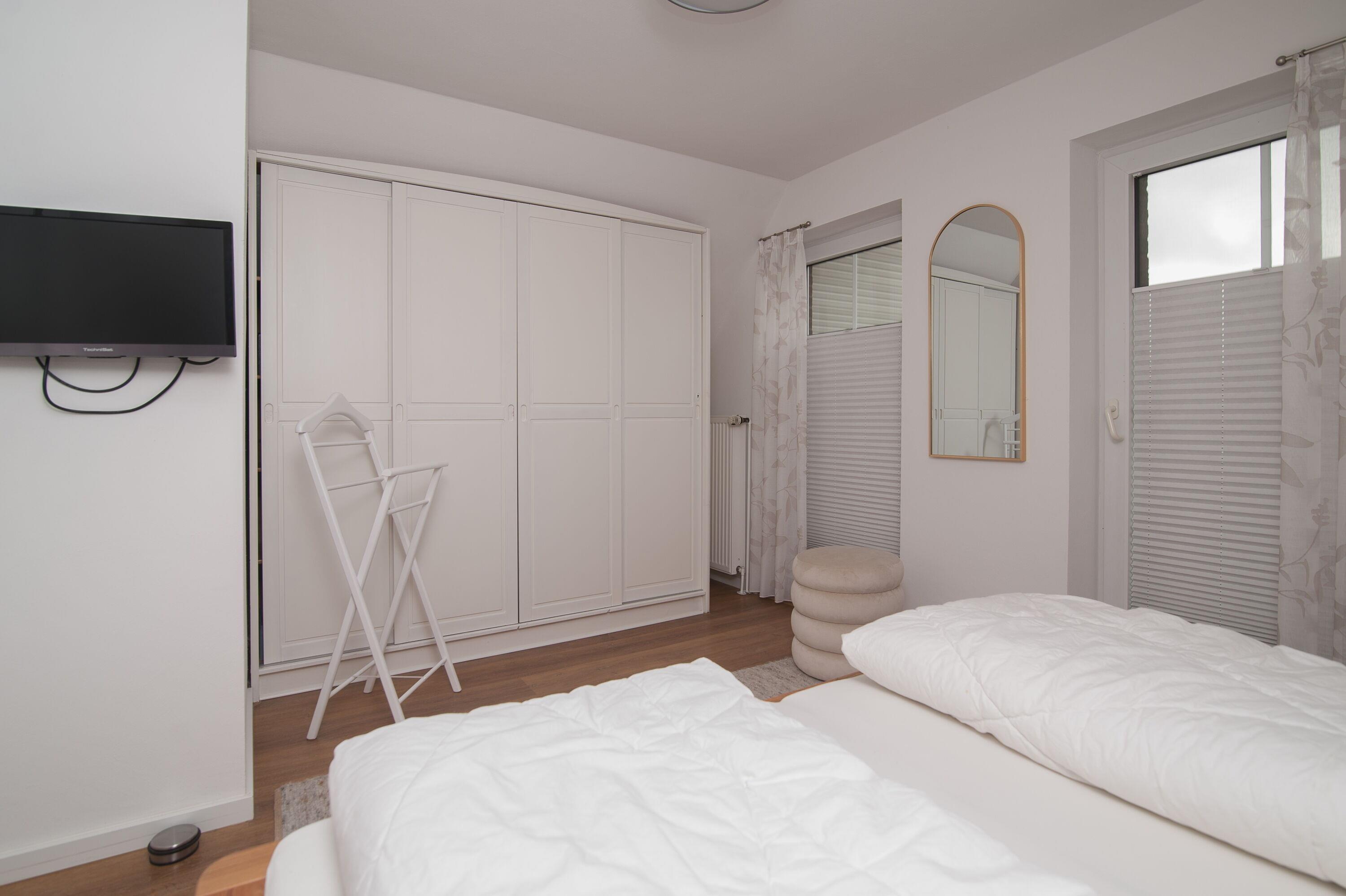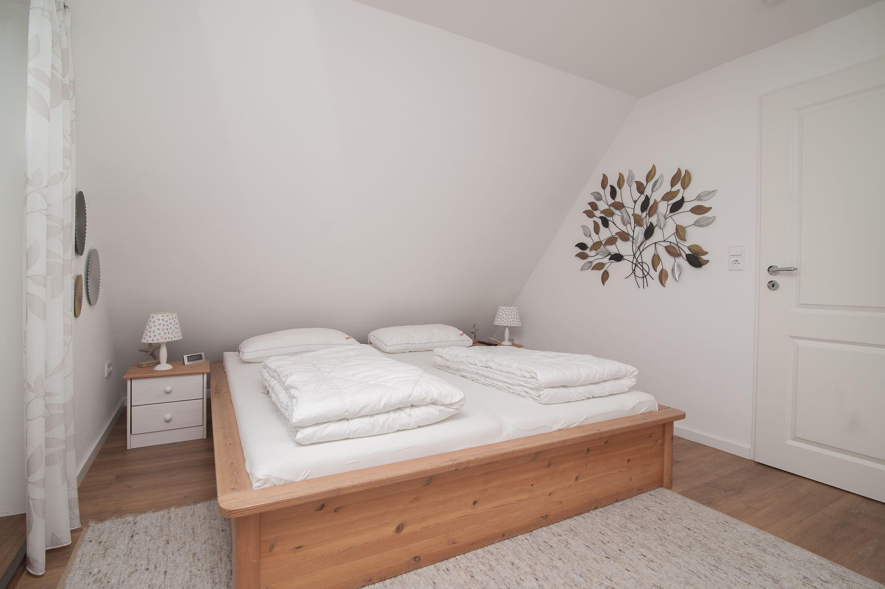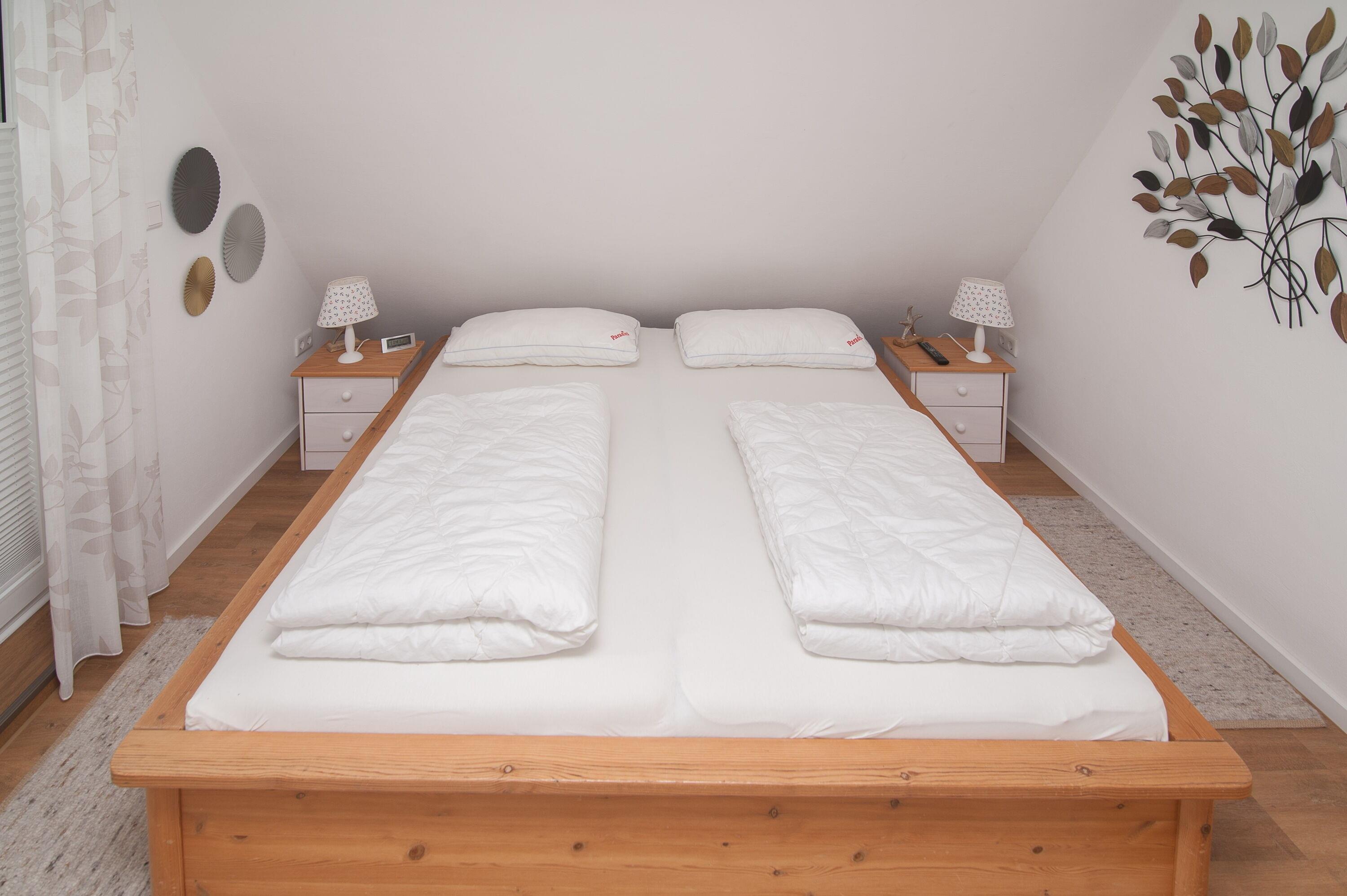 Ein Schlafzimmer mit einem Massivholz-Doppelbett (2 x 90 x 200 cm) und verstellbarem Lattenrost im Obergeschoß mit 22"Technisat FullHD LCD-TV., sowie ein Schlafzimmer mit zwei Massivholz-Einzelbetten (90 x 200 cm) mit 32" Metz FullHD LCD-TV-Gerät und das Badezimmer mit Dusche, Waschbecken und WC im Obergeschoss,