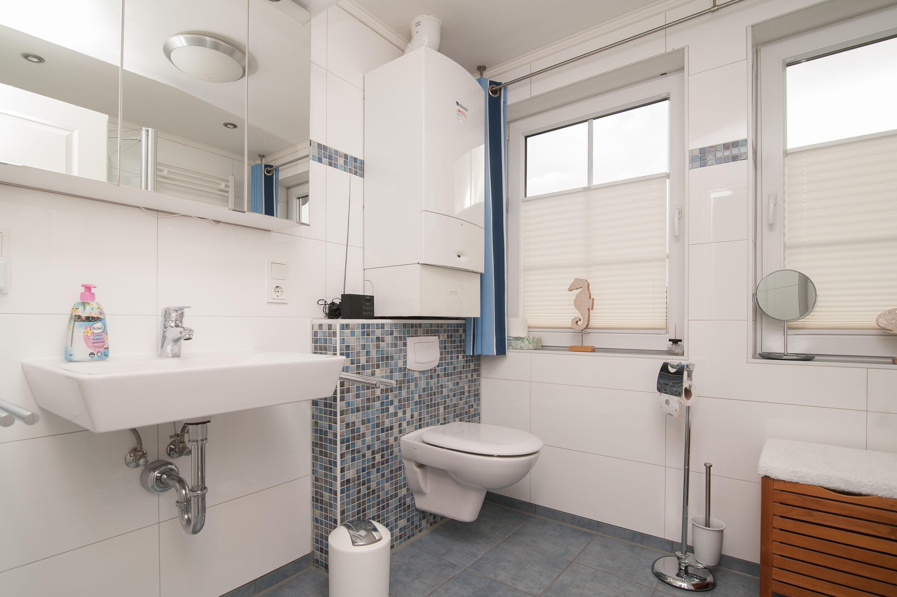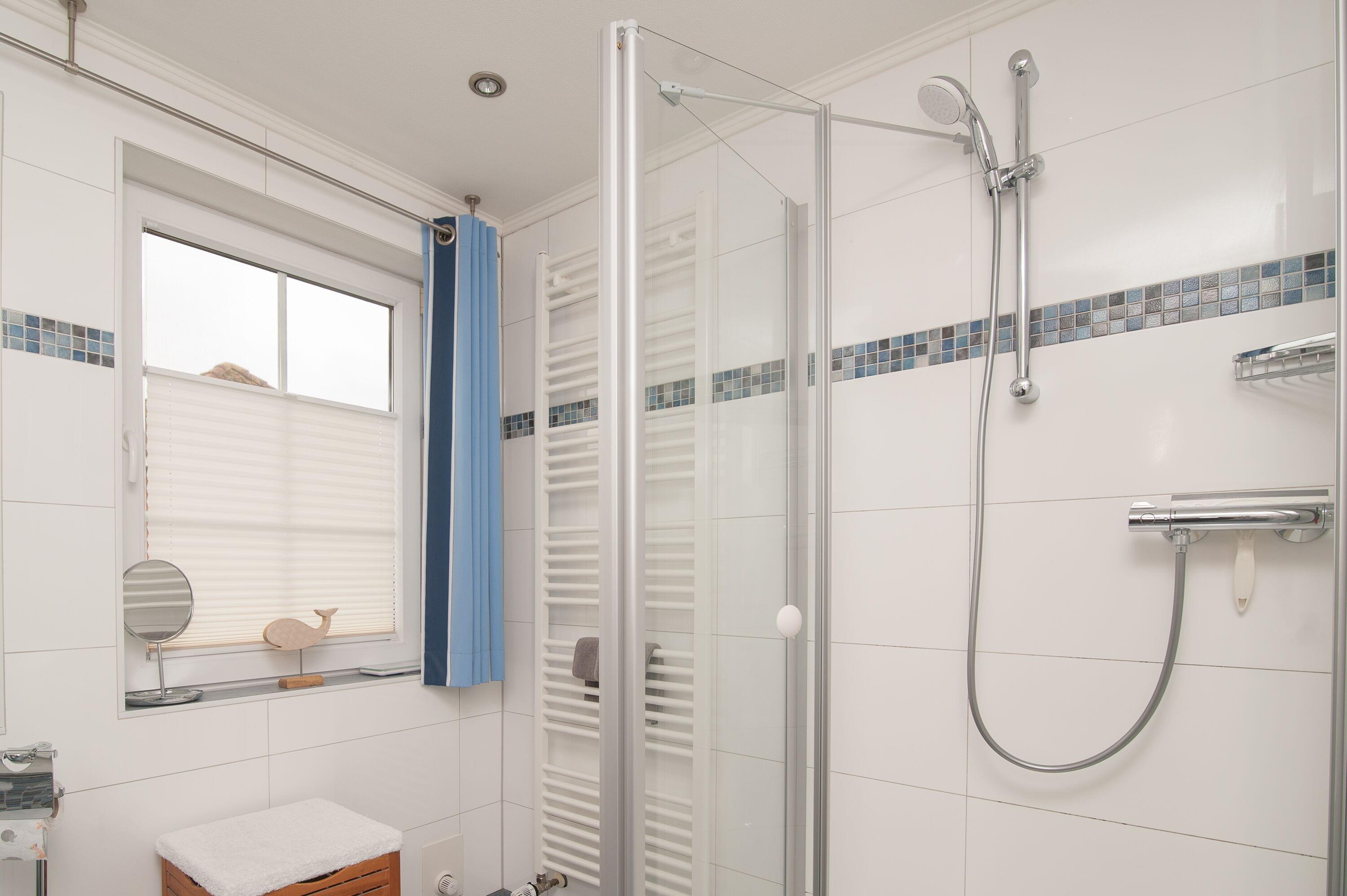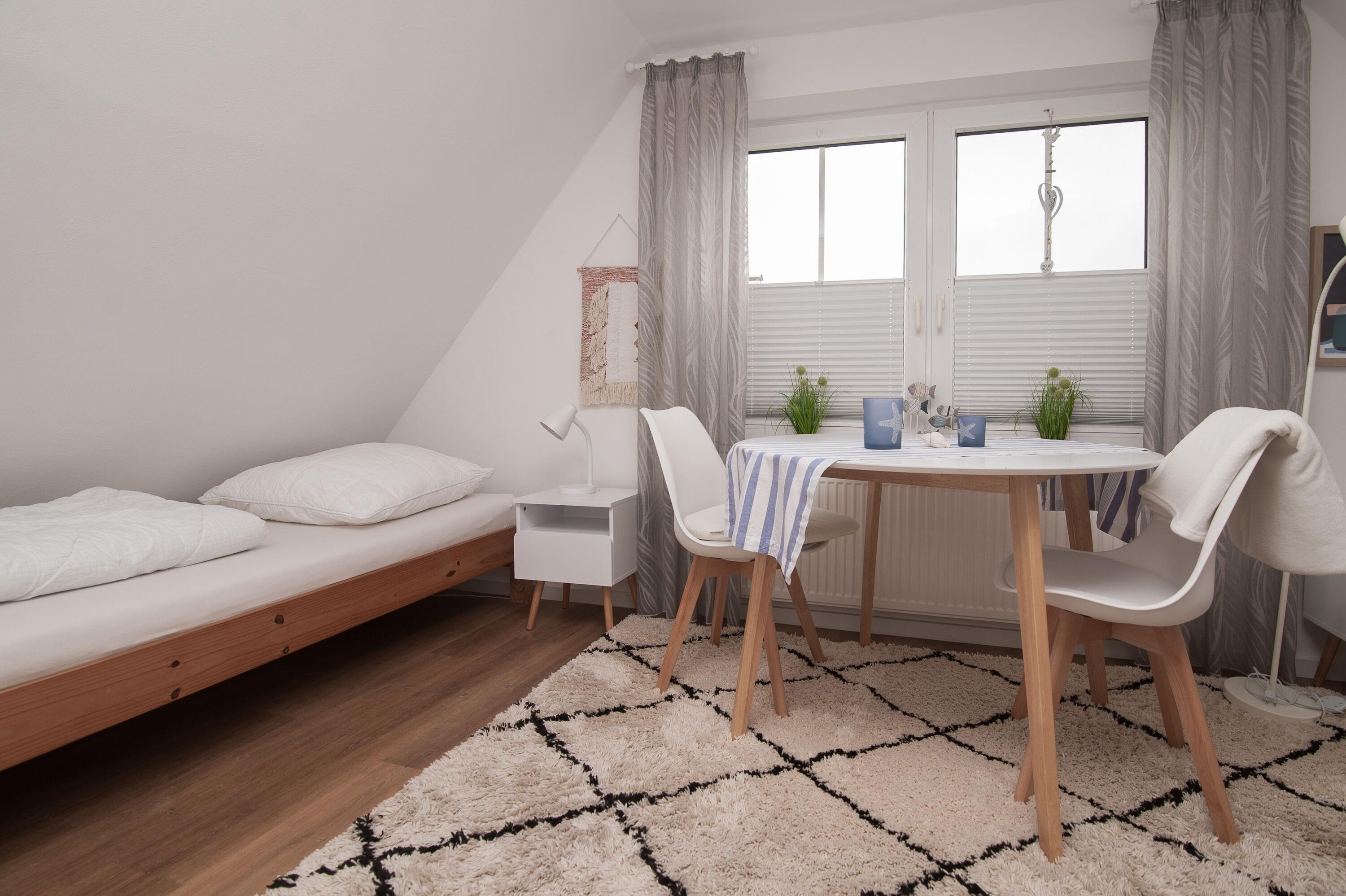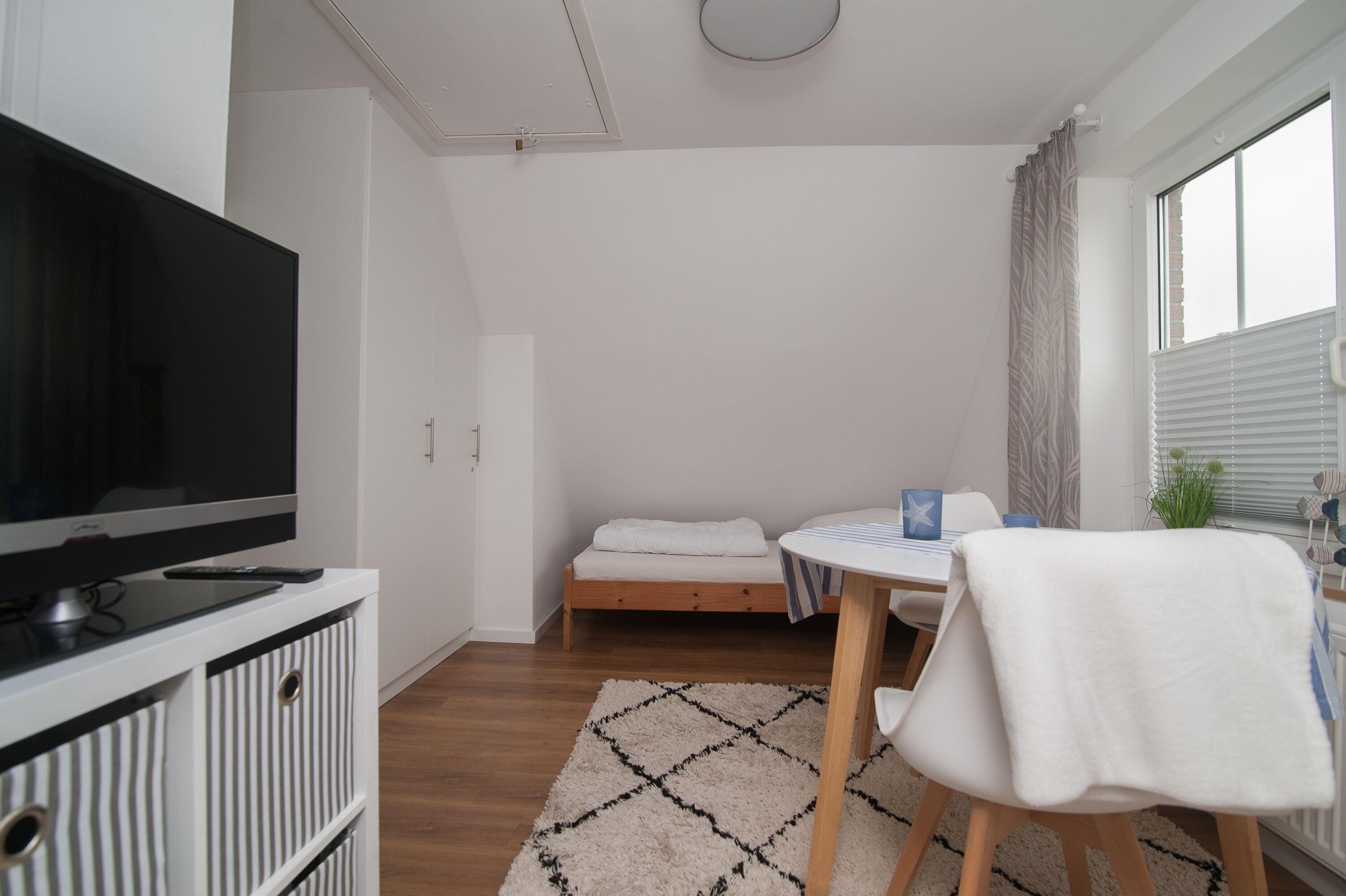 Ein Schlafzimmer mit einem Massivholz-Doppelbett (2 x 90 x 200 cm) und verstellbarem Lattenrost im Obergeschoß mit 22"Technisat FullHD LCD-TV., sowie ein Schlafzimmer mit zwei Massivholz-Einzelbetten (90 x 200 cm) mit 32" Metz FullHD LCD-TV-Gerät und das Badezimmer mit Dusche, Waschbecken und WC im Obergeschoss,
