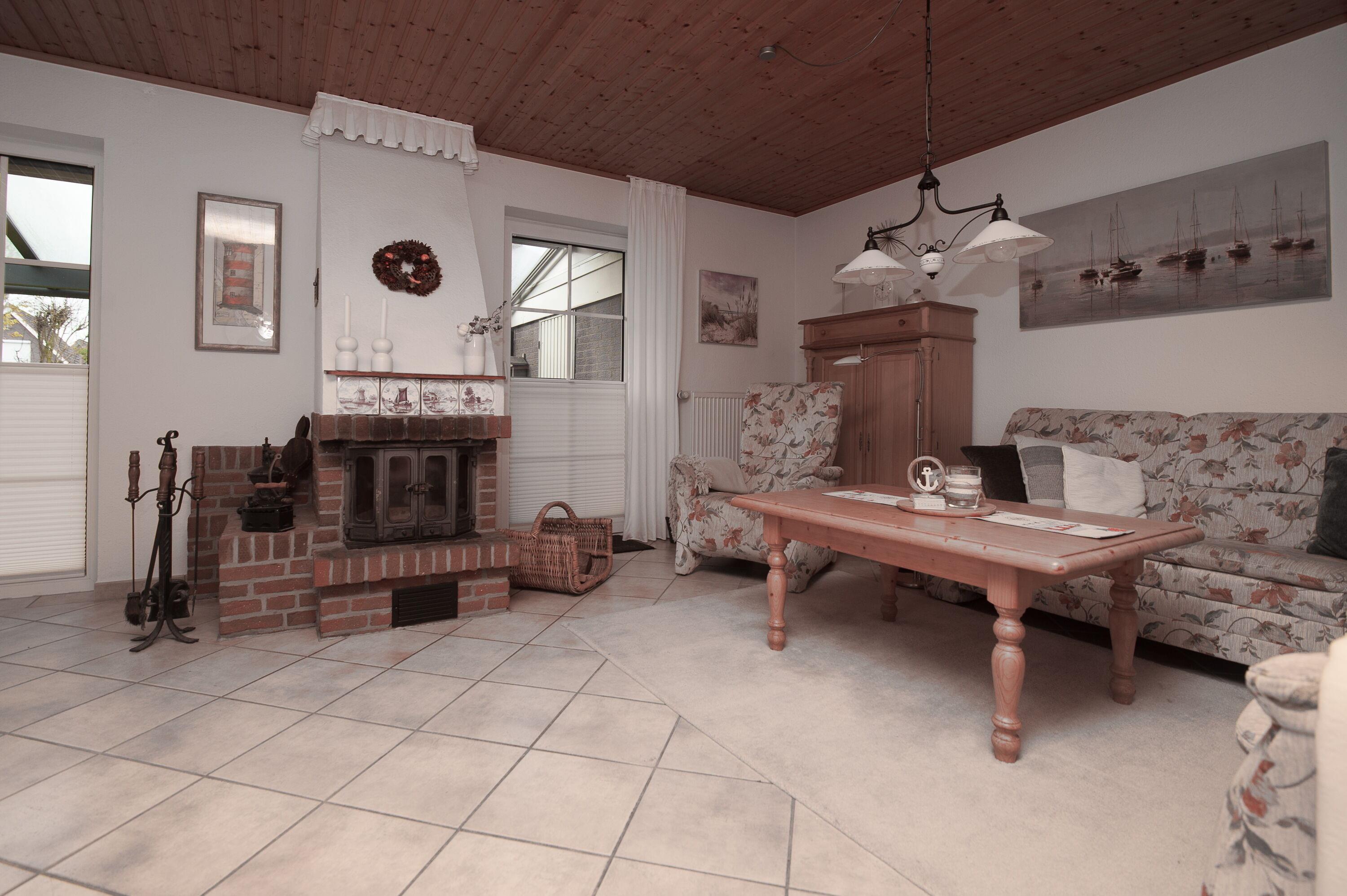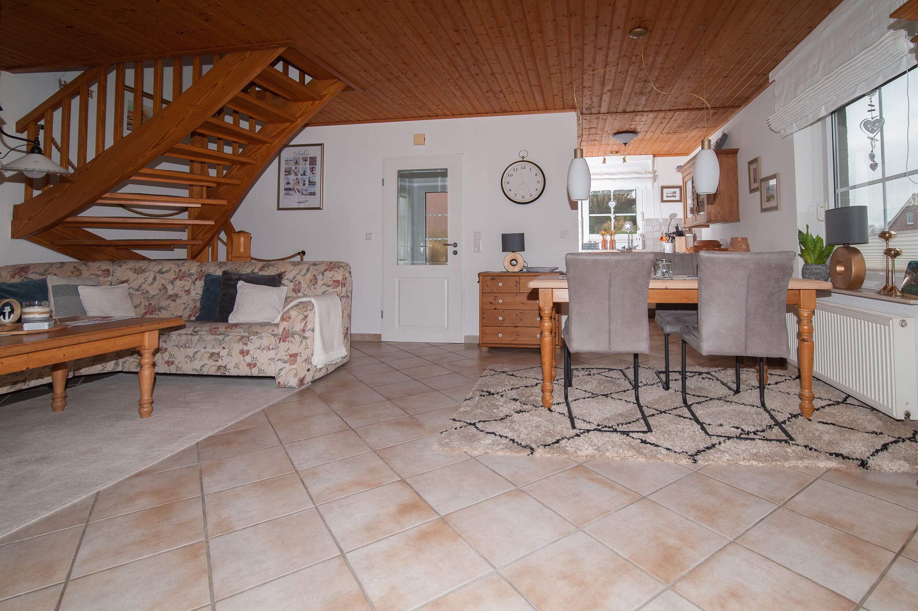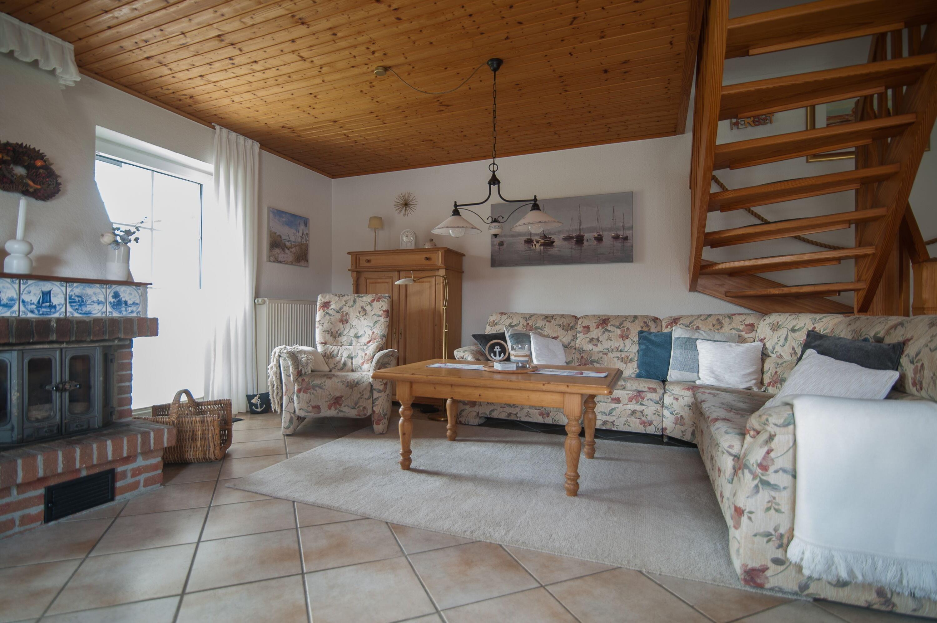 Schöner Wohnraum im Landhausstil, mit großer Couch, verstellbarem Sessel, Kamin,32"Metz FullHD LED-TV , DVD-Player und Bluetooth-Radio, gemütliche Rundsitzgruppe sowie einem Essplatz für 4 Personen.